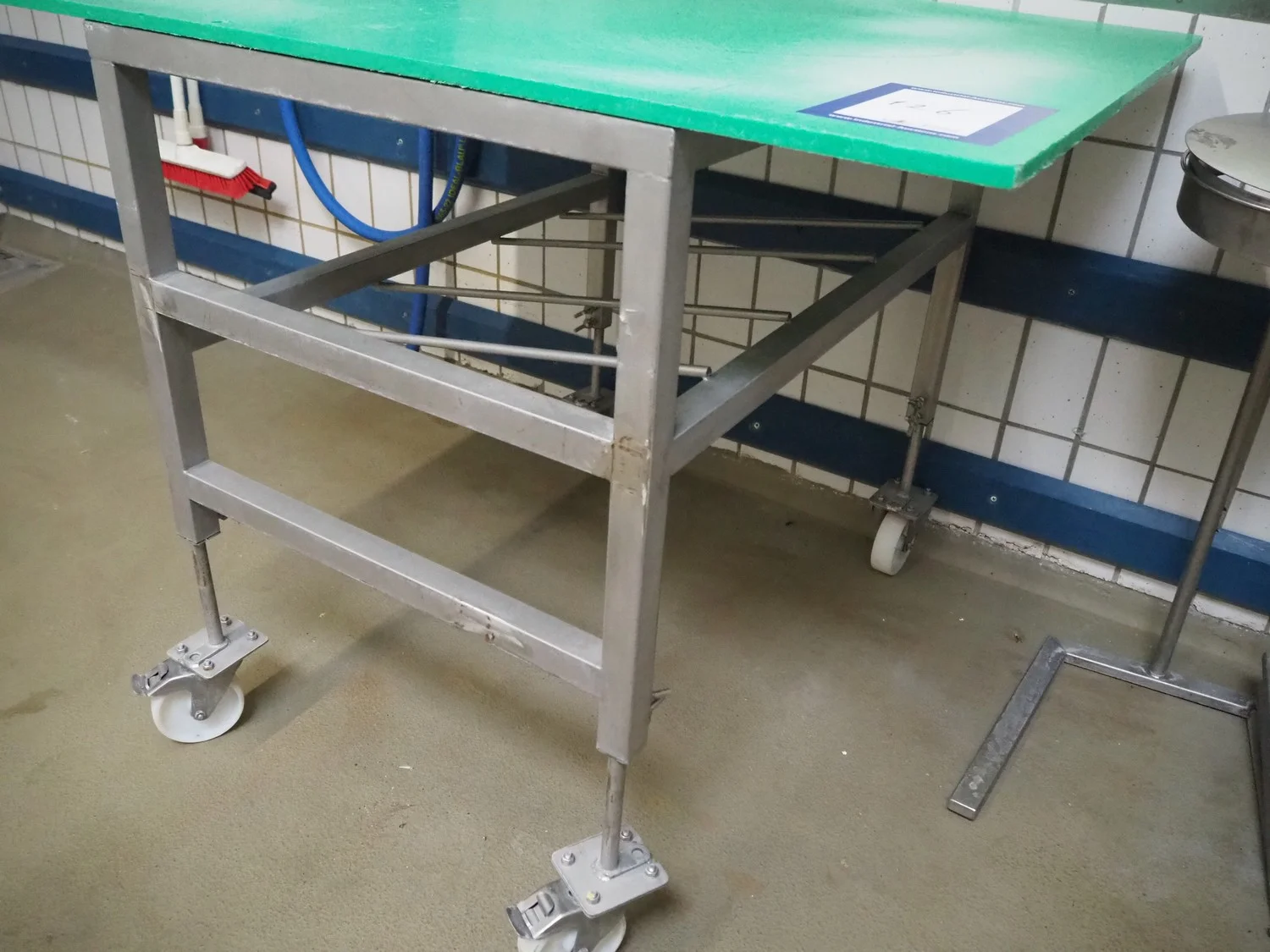 Mobile table, s/s frame, plastic worktop, dimensions: 1200 mm x 1000 mm x 1000 mm.
