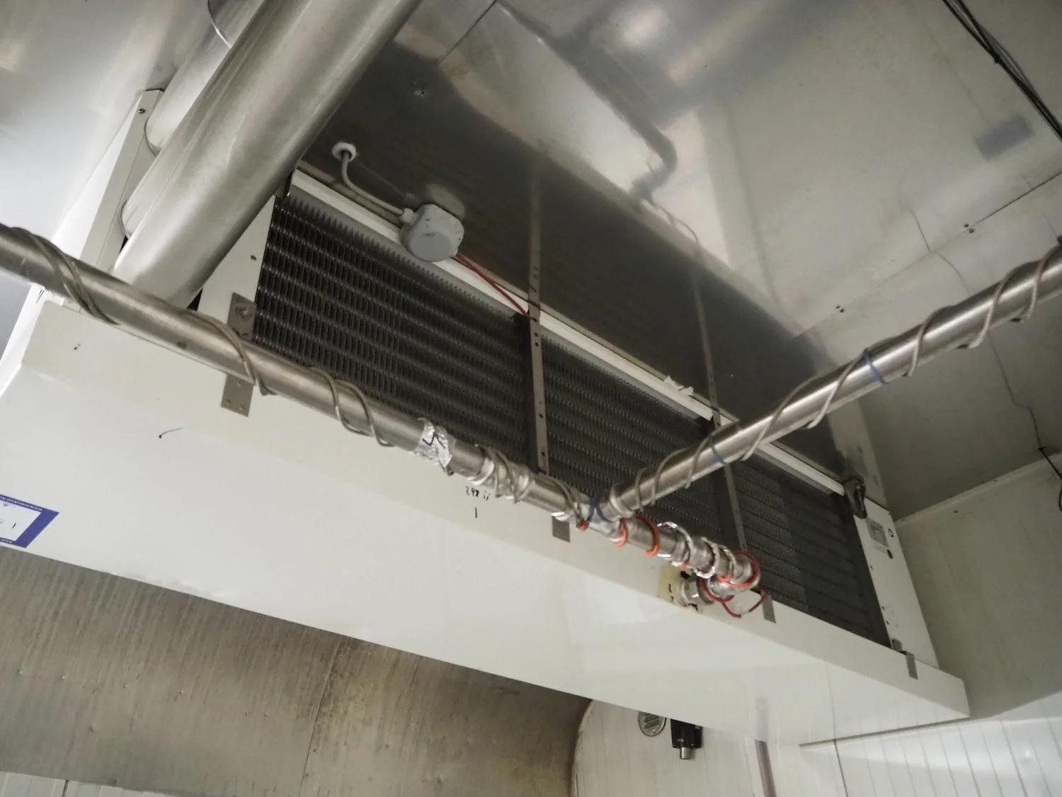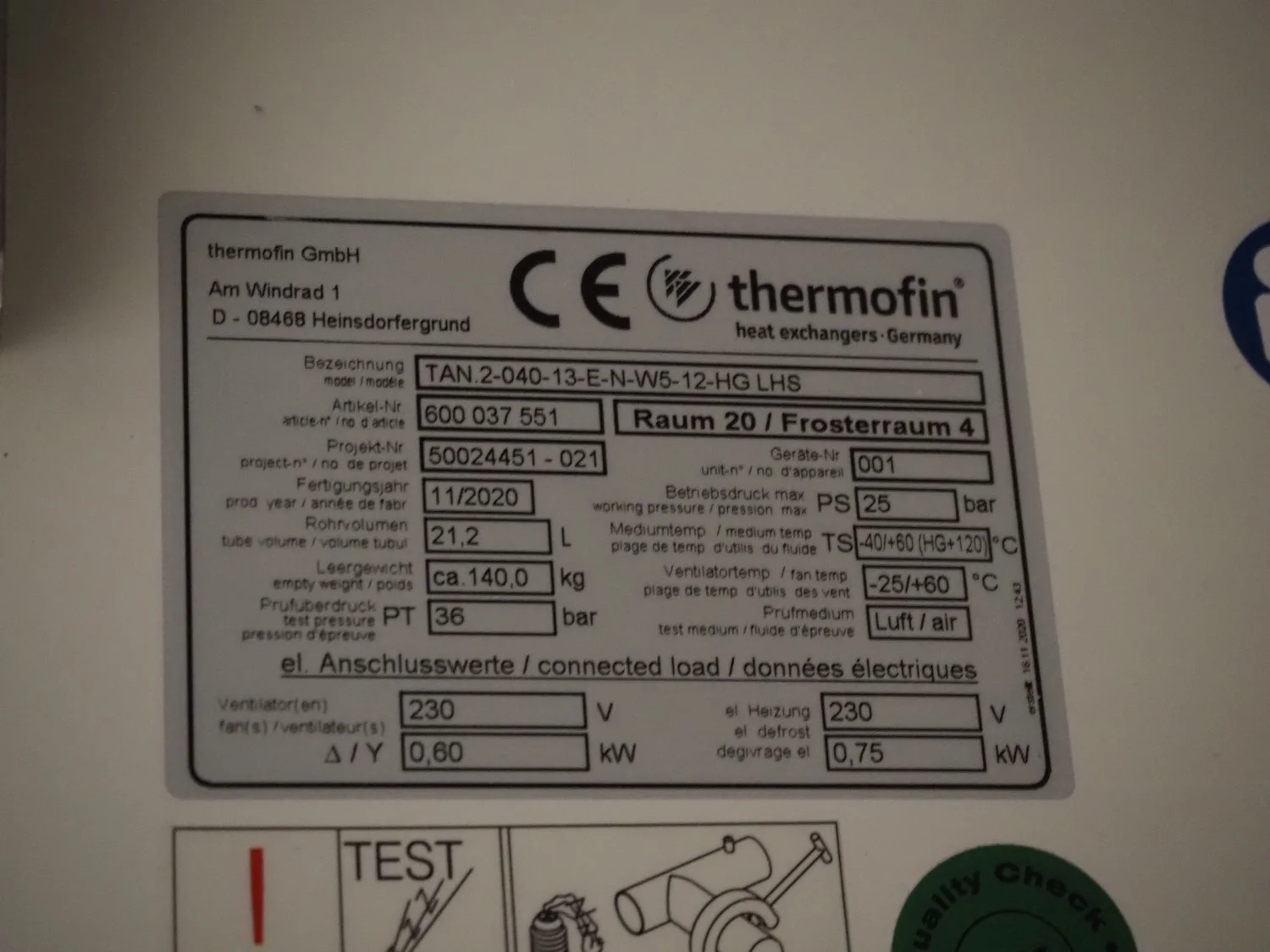 Thermofin GmbH evaporator, model: TAN.2-040-13-E-N-W5-12-HG LHS, unit number: 001, year of construction: 11/2020, 230 V, 0.75 kW, maximum working pressure: 25 bar, tube volume: 21.2 liter, 3 fans, dimensions: 2200 mm x 600 mm x 600 mm.
