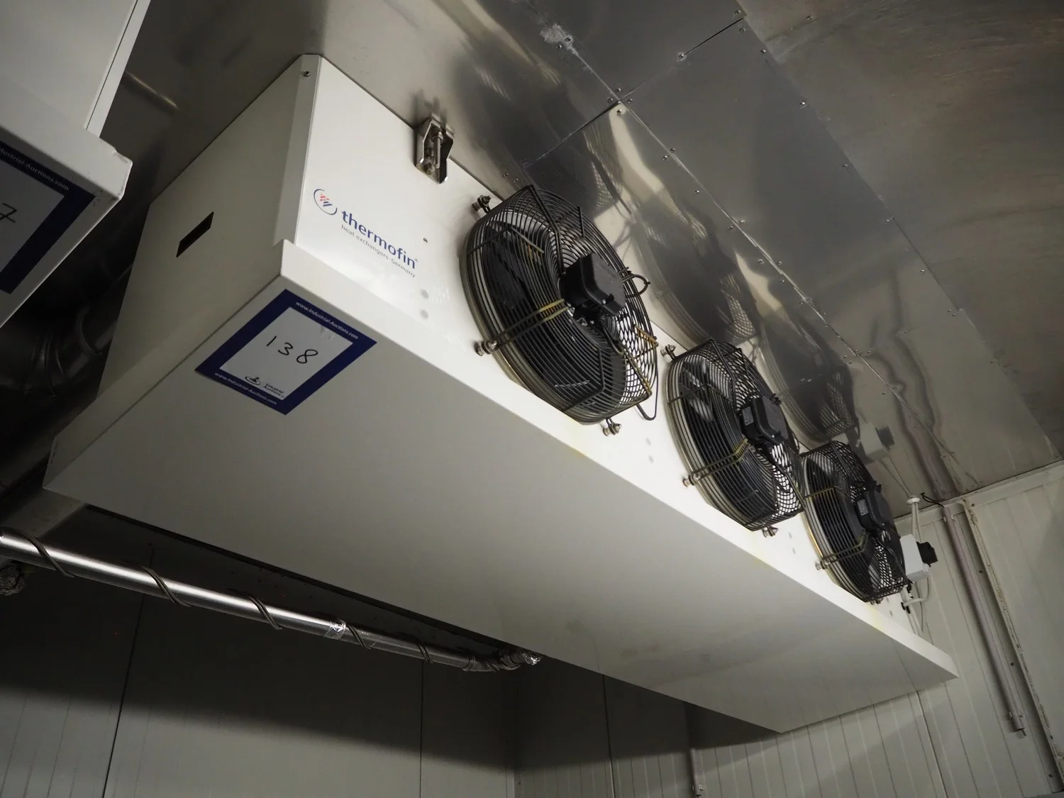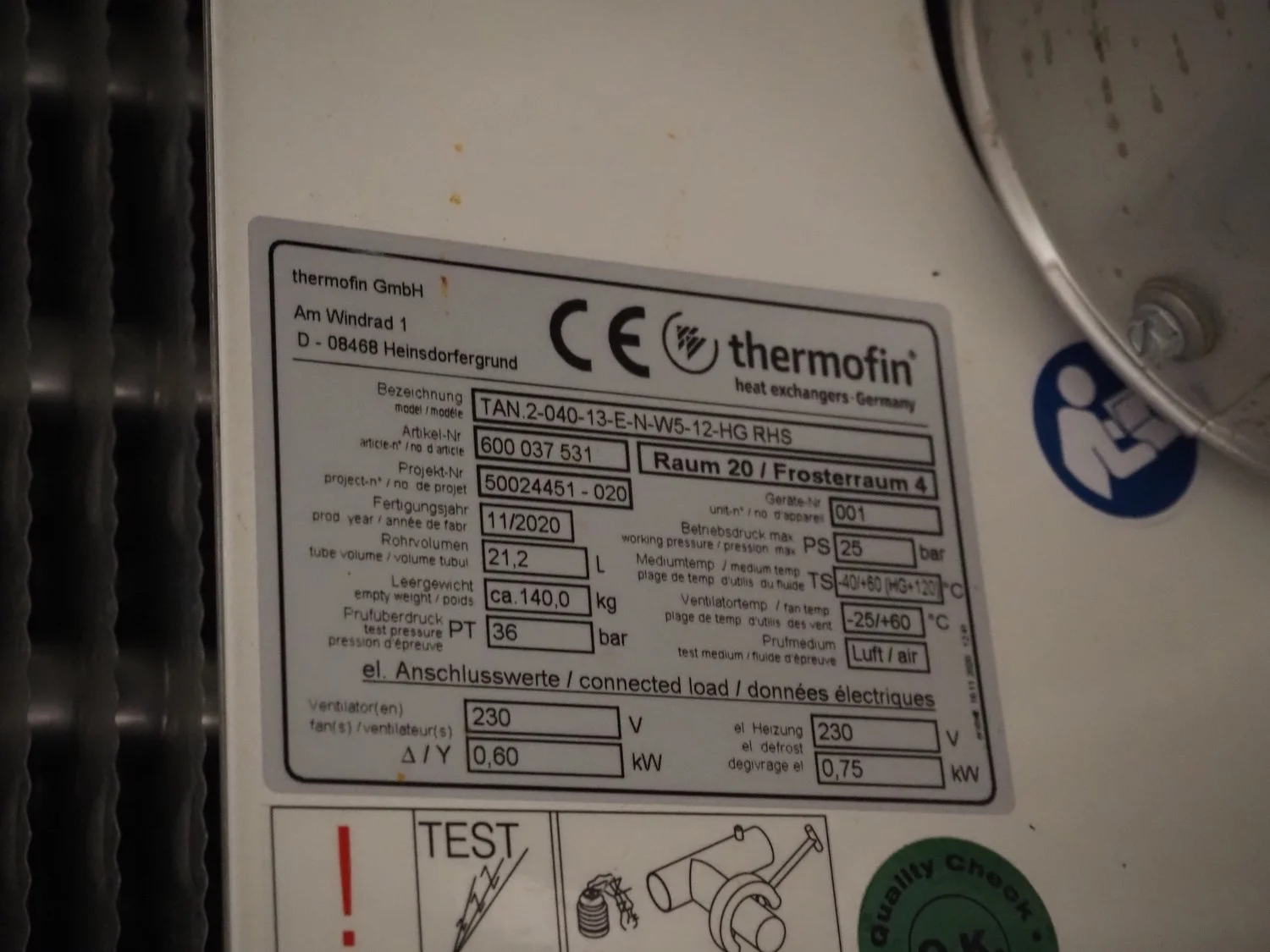 Thermofin GmbH evaporator, model: TAN.2-040-13-E-N-W5-12-HG RHS, unit number: 001, year of construction: 11/2020, 230 V, 0.60 / 0.75 kW, maximum working pressure: 25 bar, volume: 21.2 liter, 3 fans, dimensions: 2200 mm x 600 mm x 600 mm.