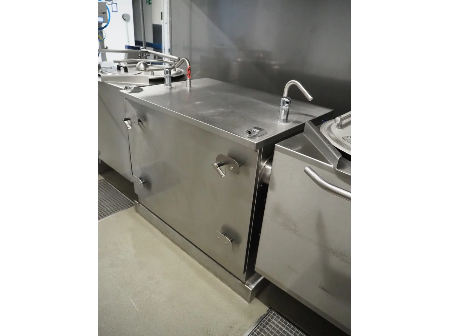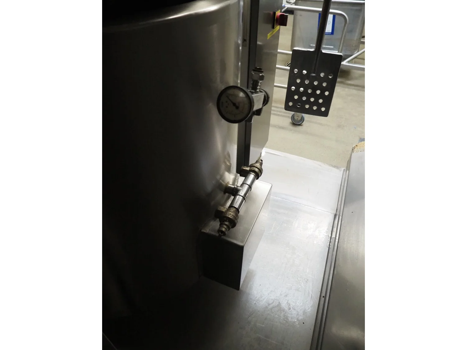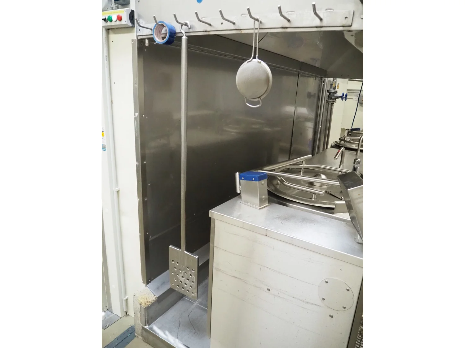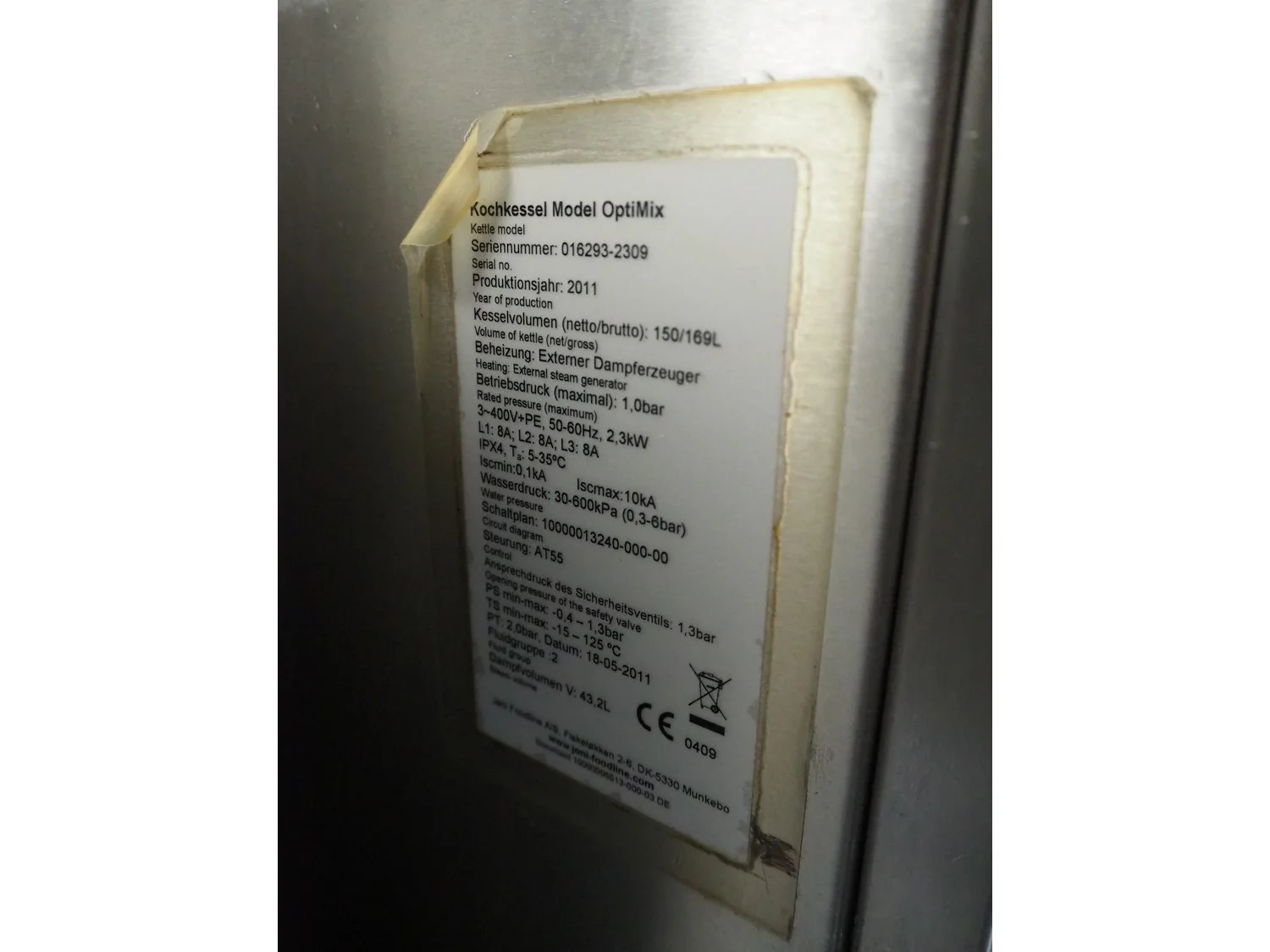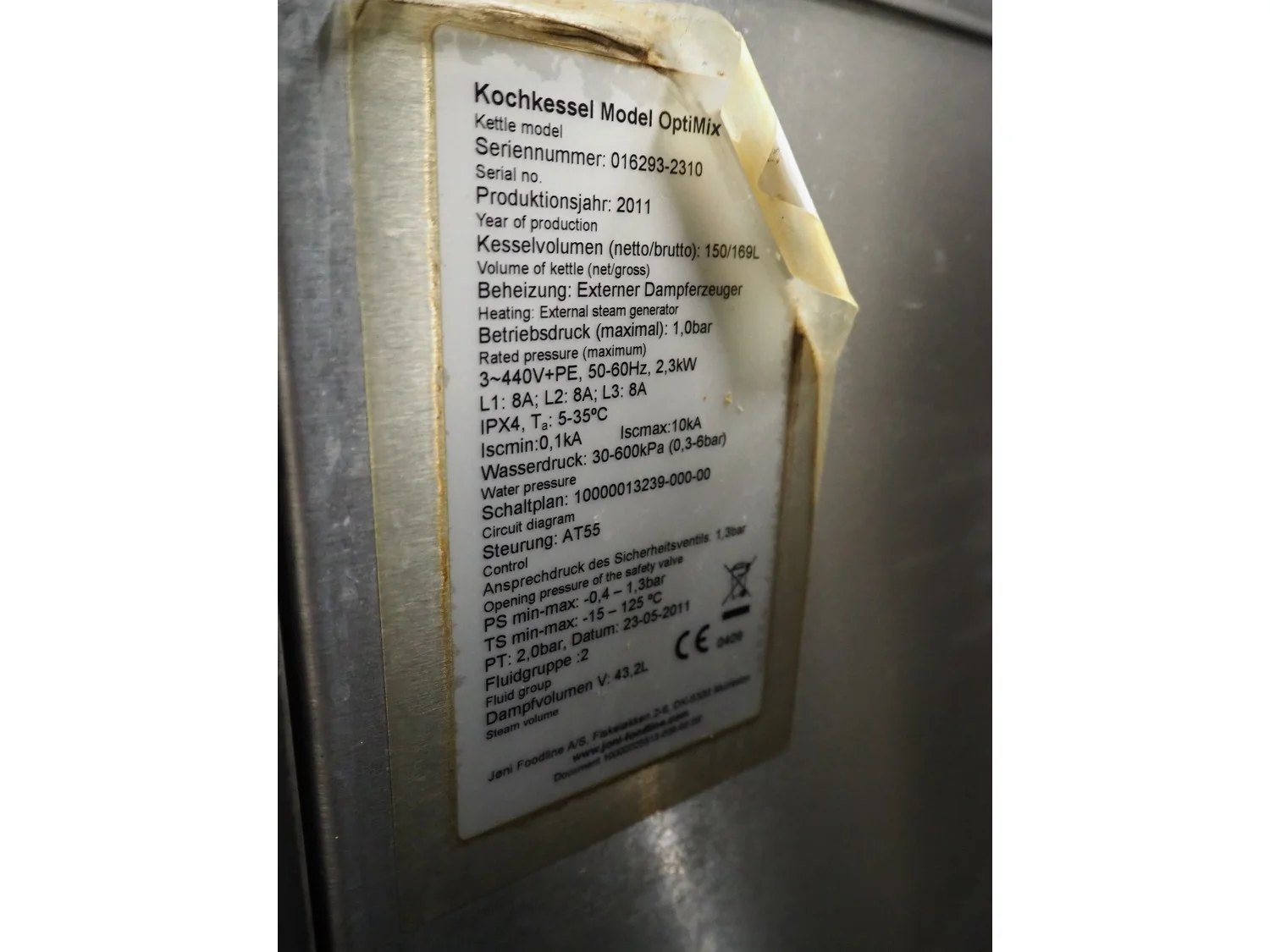 Joni A/S double cooking vessel with agitators and scrapers, model: OptiMix, year of construction: 2011, volume: (2x) 150 liter, 400 V, 3 Ph, 50 Hz, 8 A, 2.3 kW, heating: external steam generator, dimensions: 3500 mm x 900 mm x 1300 mm, s/s extractor hood, dimensions: 3350 mm x 1100 mm x 800 mm.