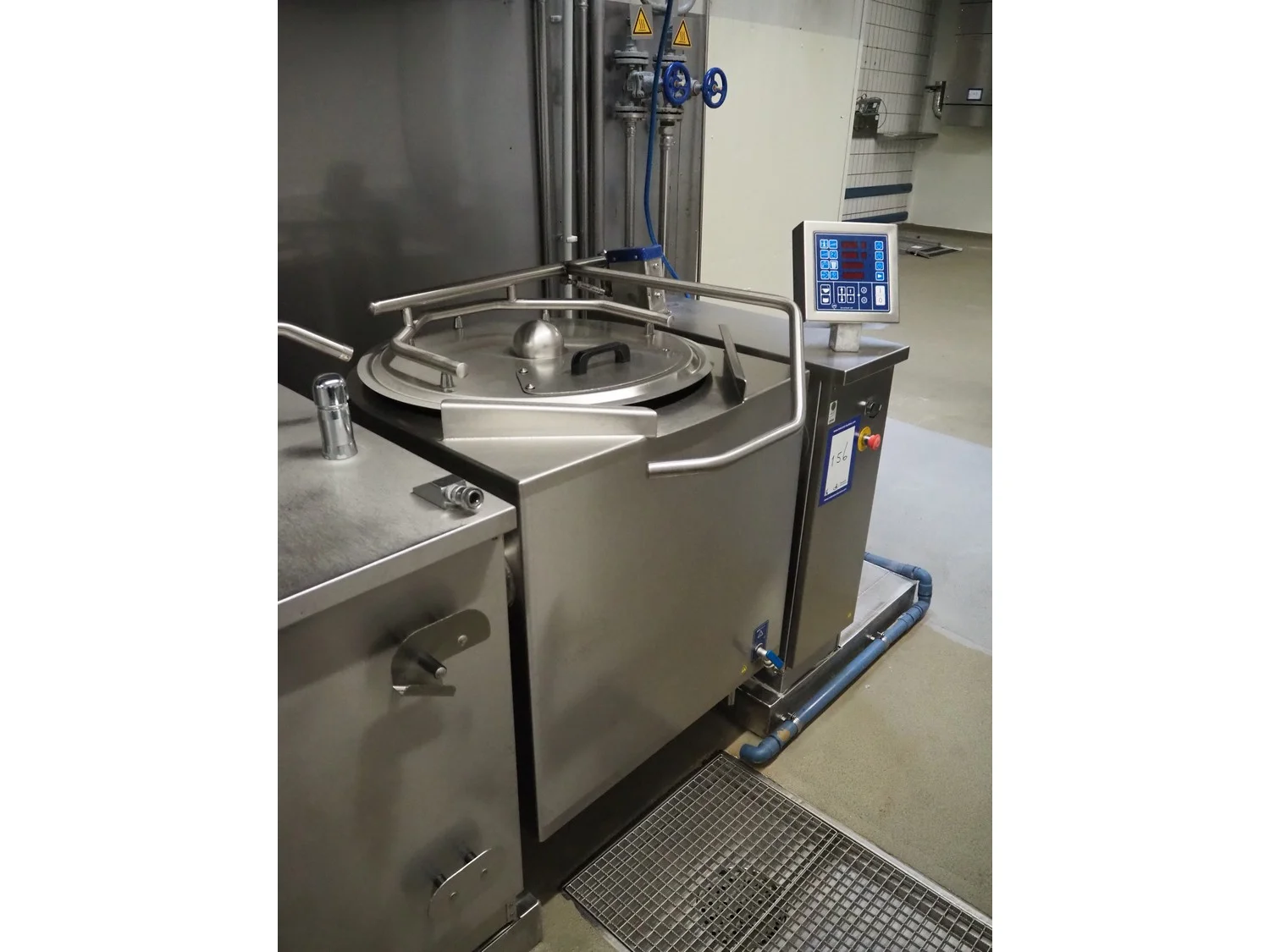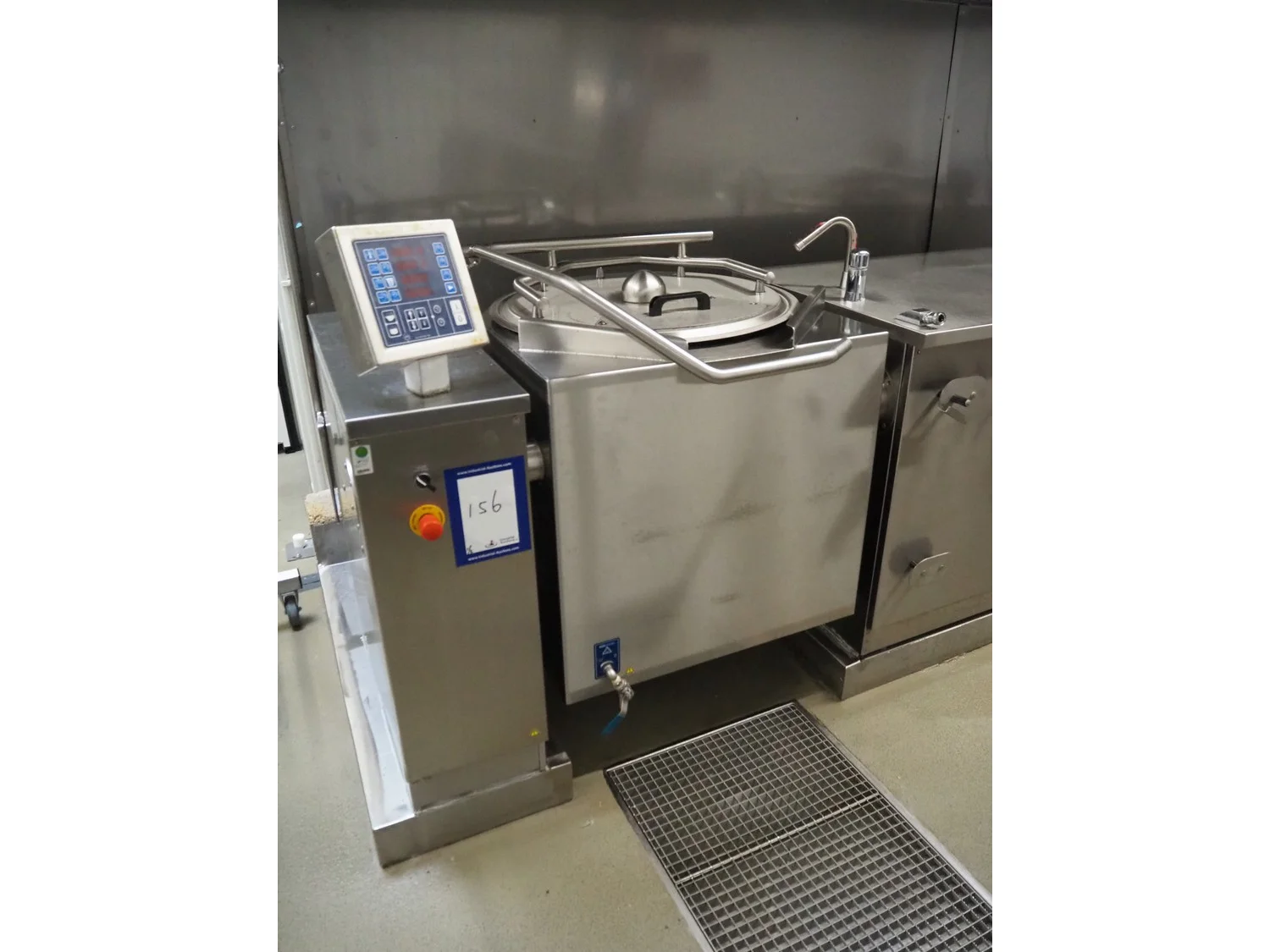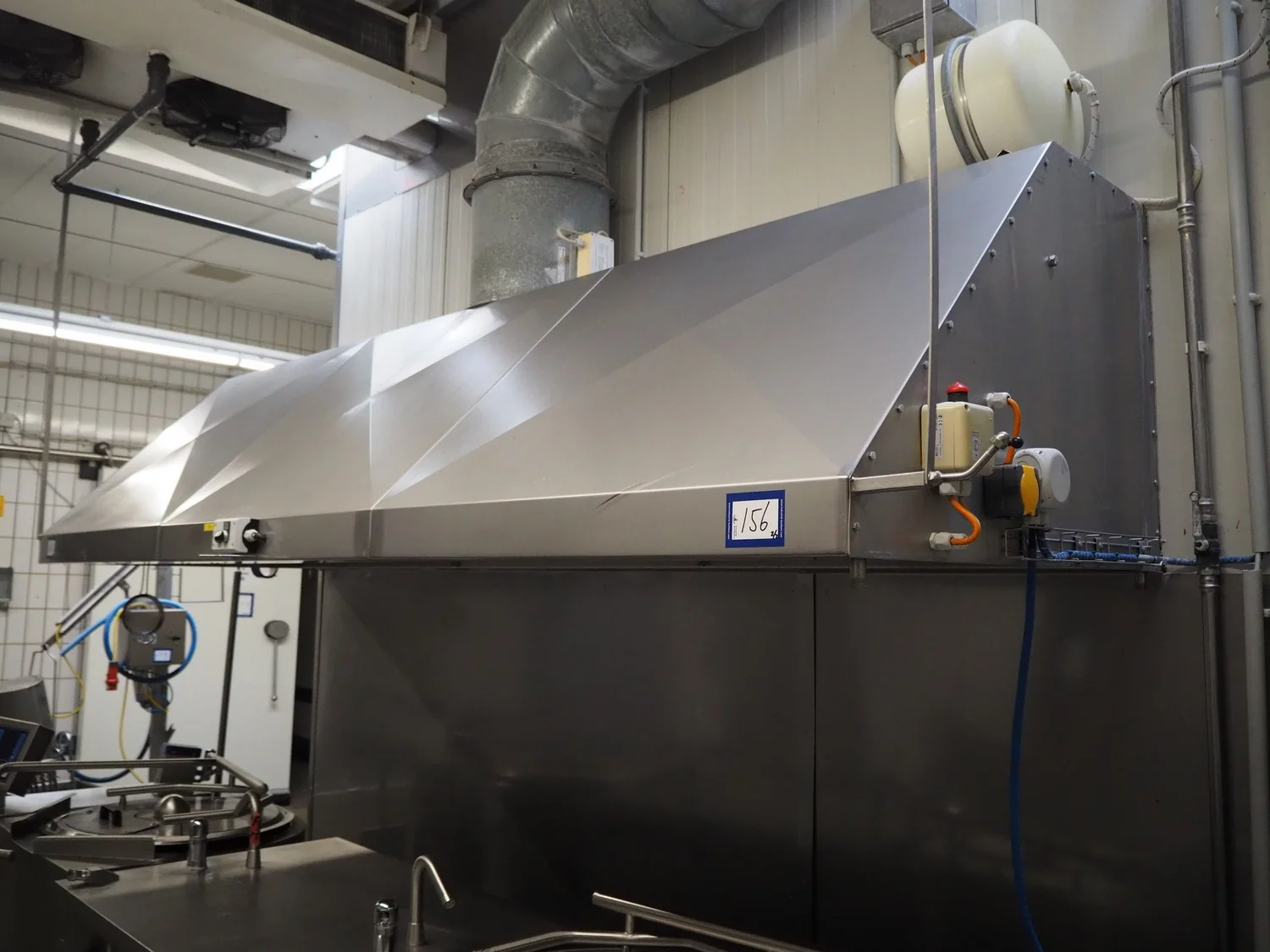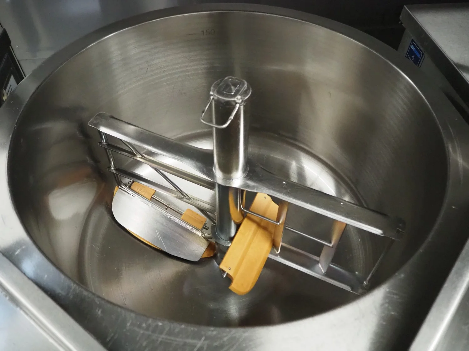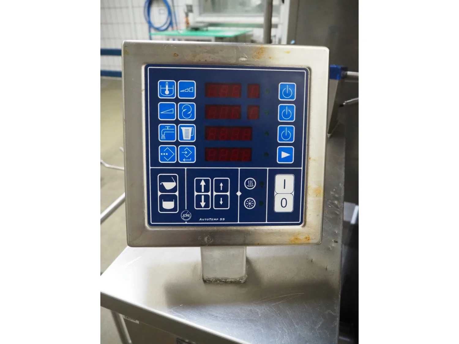 Joni A/S double cooking vessel with agitators and scrapers, model: OptiMix, year of construction: 2011, volume: (2x) 150 liter, 400 V, 3 Ph, 50 Hz, 8 A, 2.3 kW, heating: external steam generator, dimensions: 3500 mm x 900 mm x 1300 mm, s/s extractor hood, dimensions: 3350 mm x 1100 mm x 800 mm.