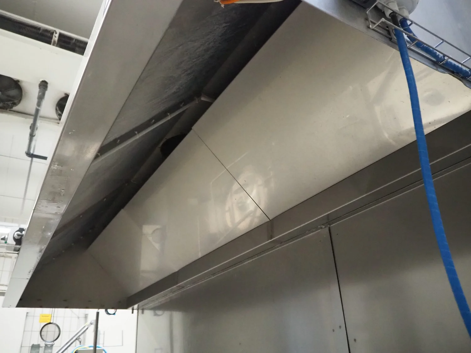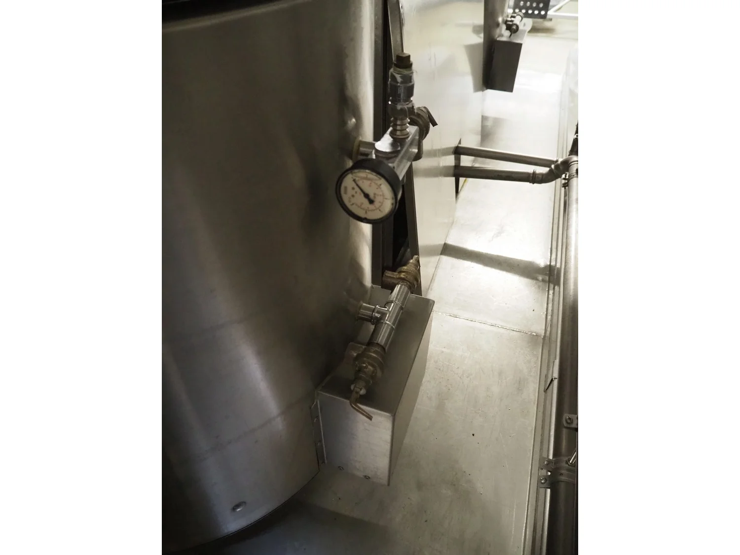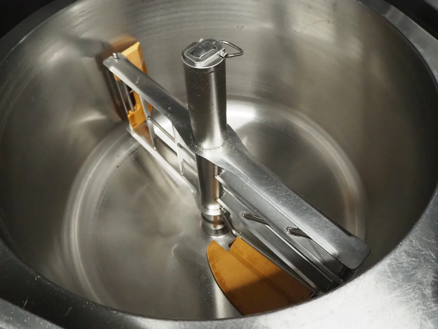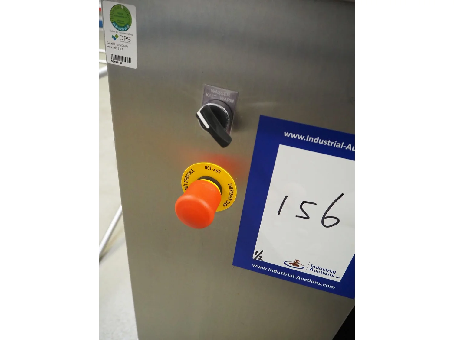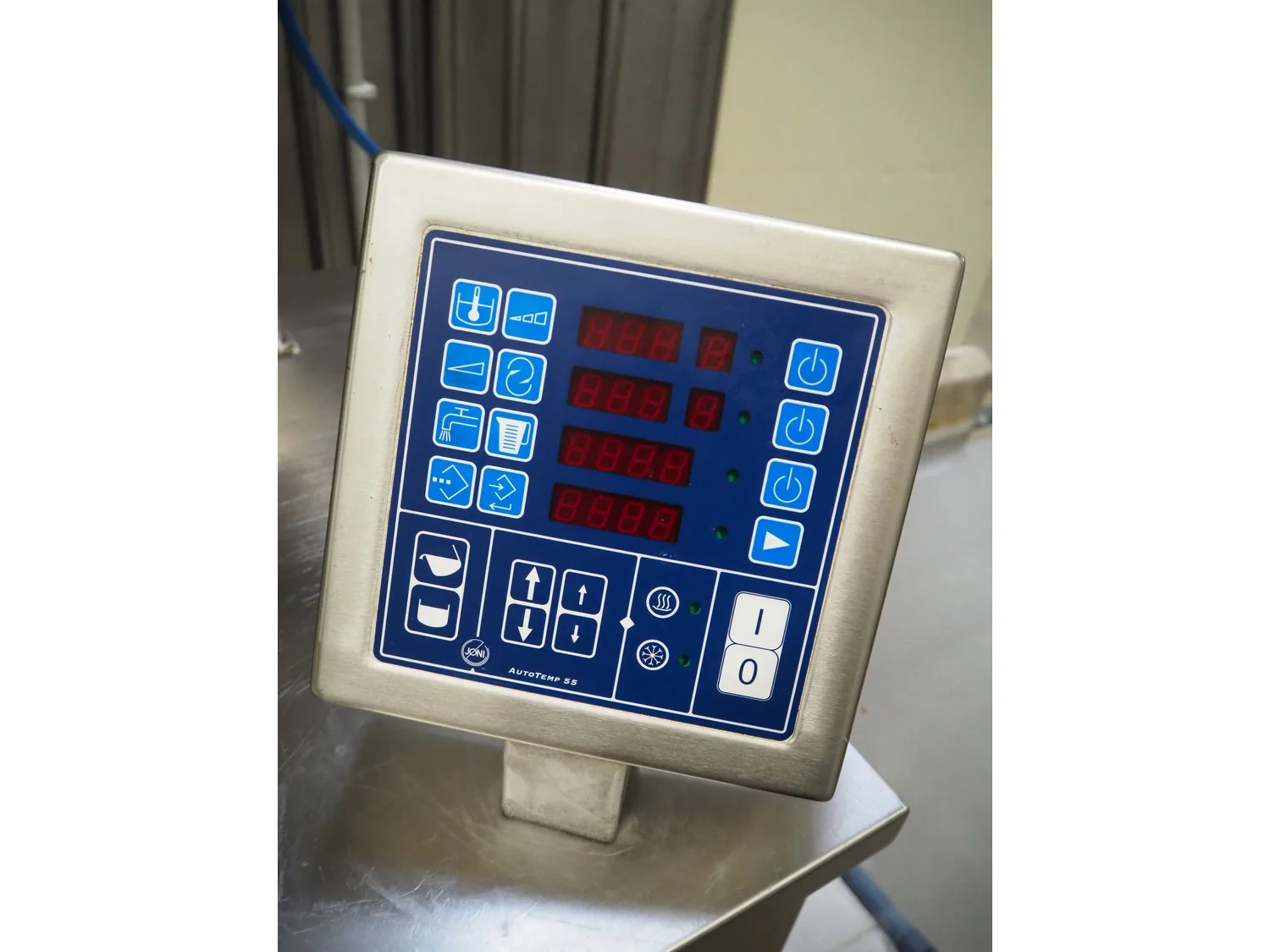 Joni A/S double cooking vessel with agitators and scrapers, model: OptiMix, year of construction: 2011, volume: (2x) 150 liter, 400 V, 3 Ph, 50 Hz, 8 A, 2.3 kW, heating: external steam generator, dimensions: 3500 mm x 900 mm x 1300 mm, s/s extractor hood, dimensions: 3350 mm x 1100 mm x 800 mm.