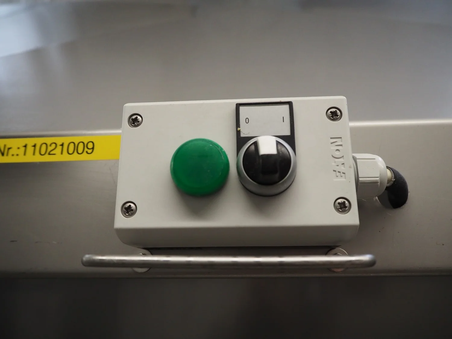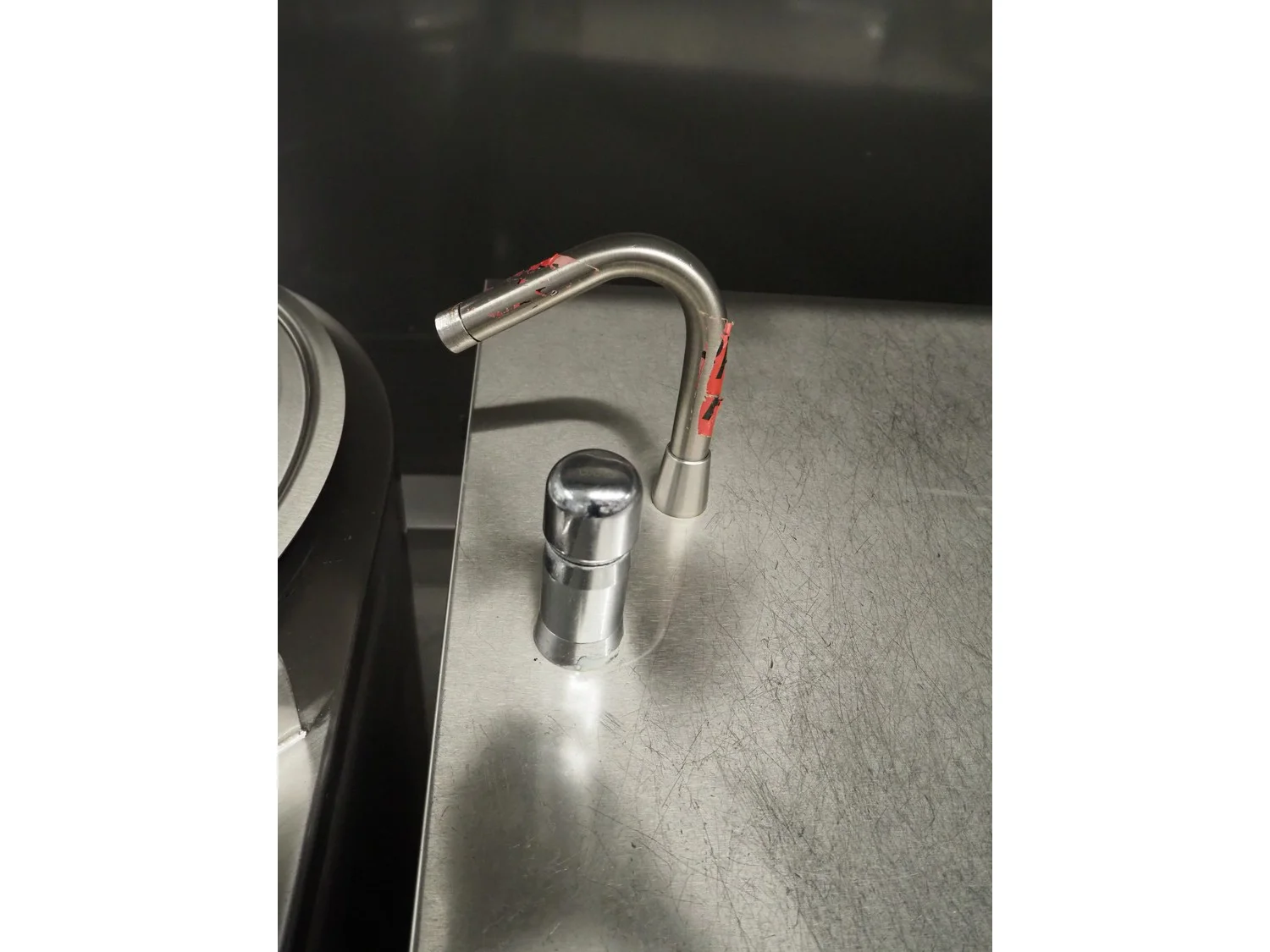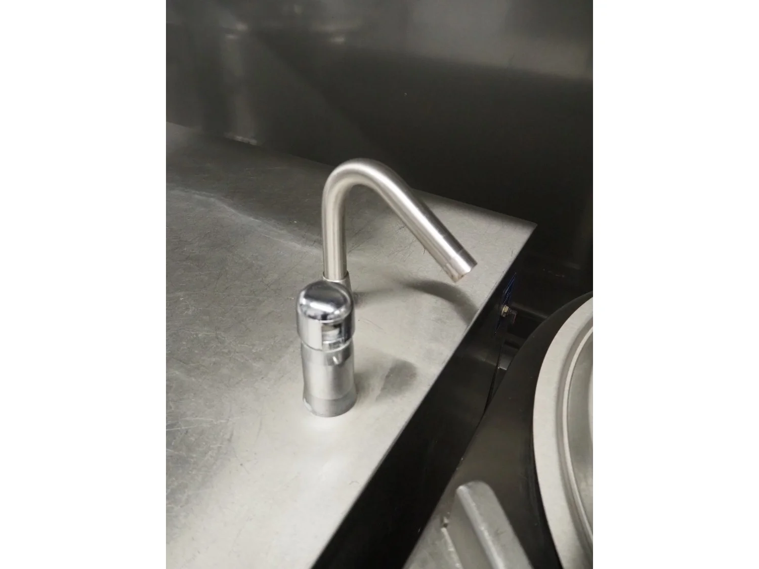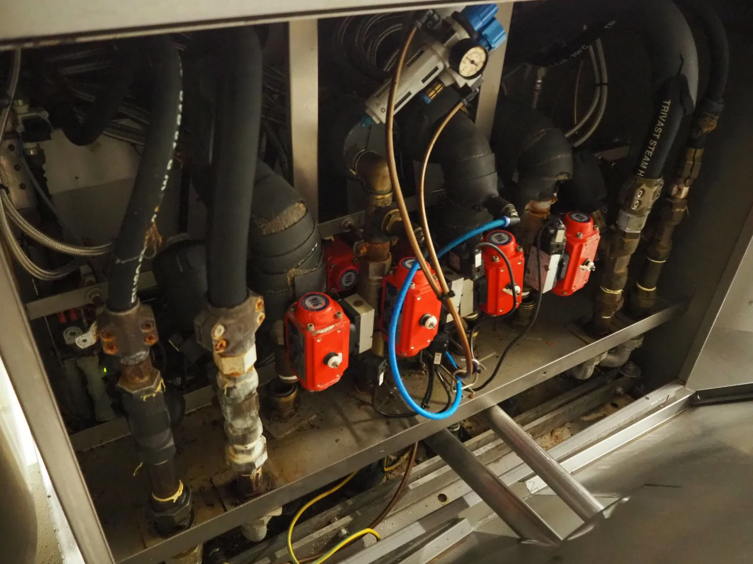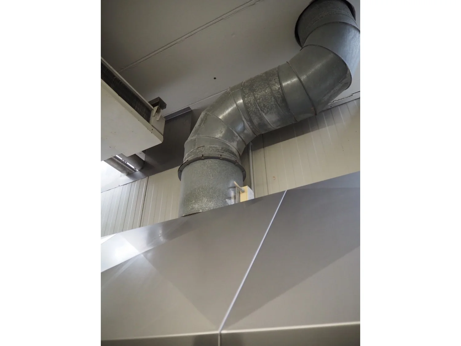 Joni A/S double cooking vessel with agitators and scrapers, model: OptiMix, year of construction: 2011, volume: (2x) 150 liter, 400 V, 3 Ph, 50 Hz, 8 A, 2.3 kW, heating: external steam generator, dimensions: 3500 mm x 900 mm x 1300 mm, s/s extractor hood, dimensions: 3350 mm x 1100 mm x 800 mm.