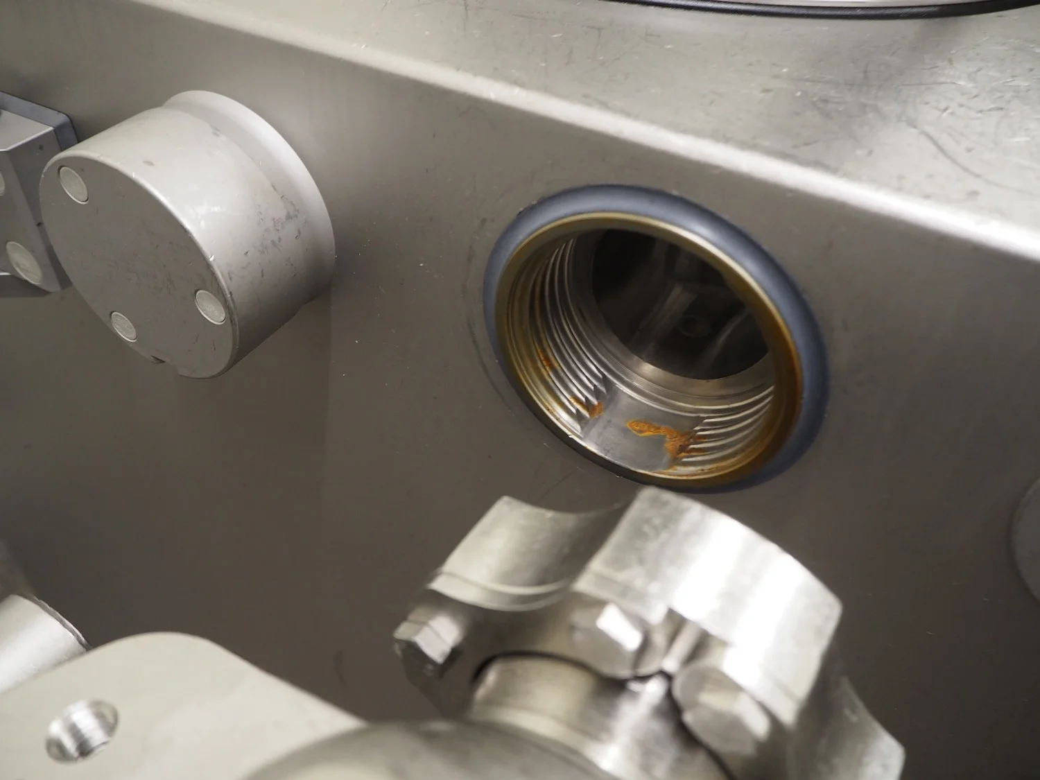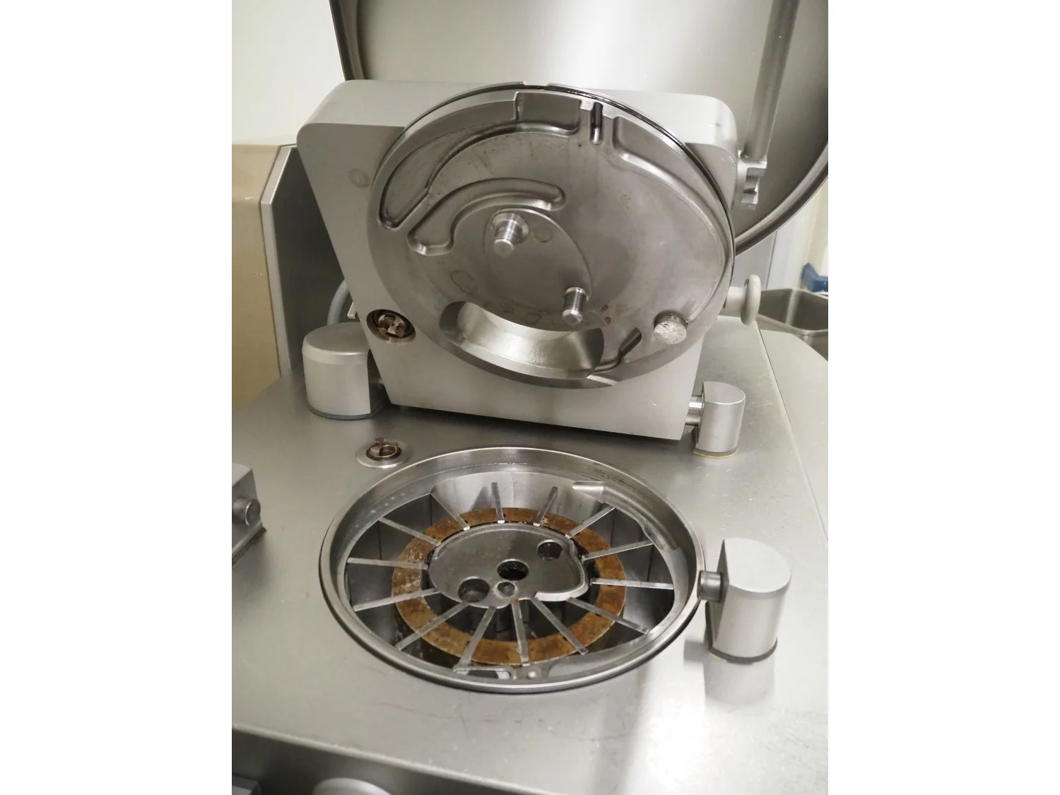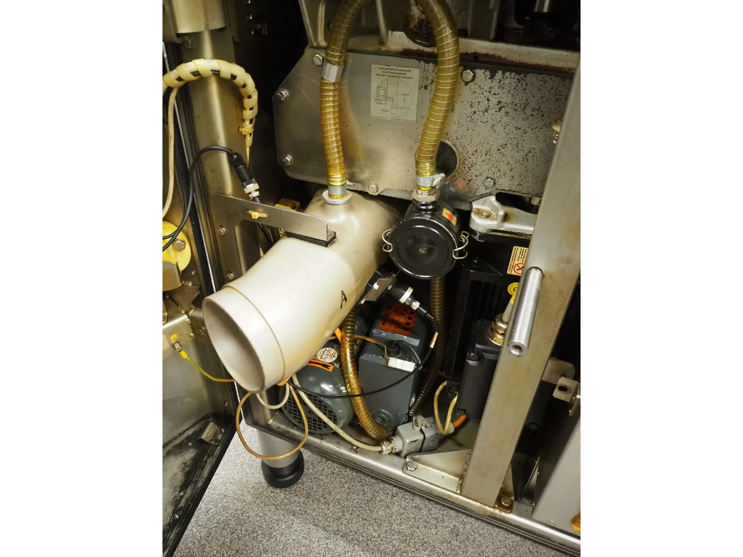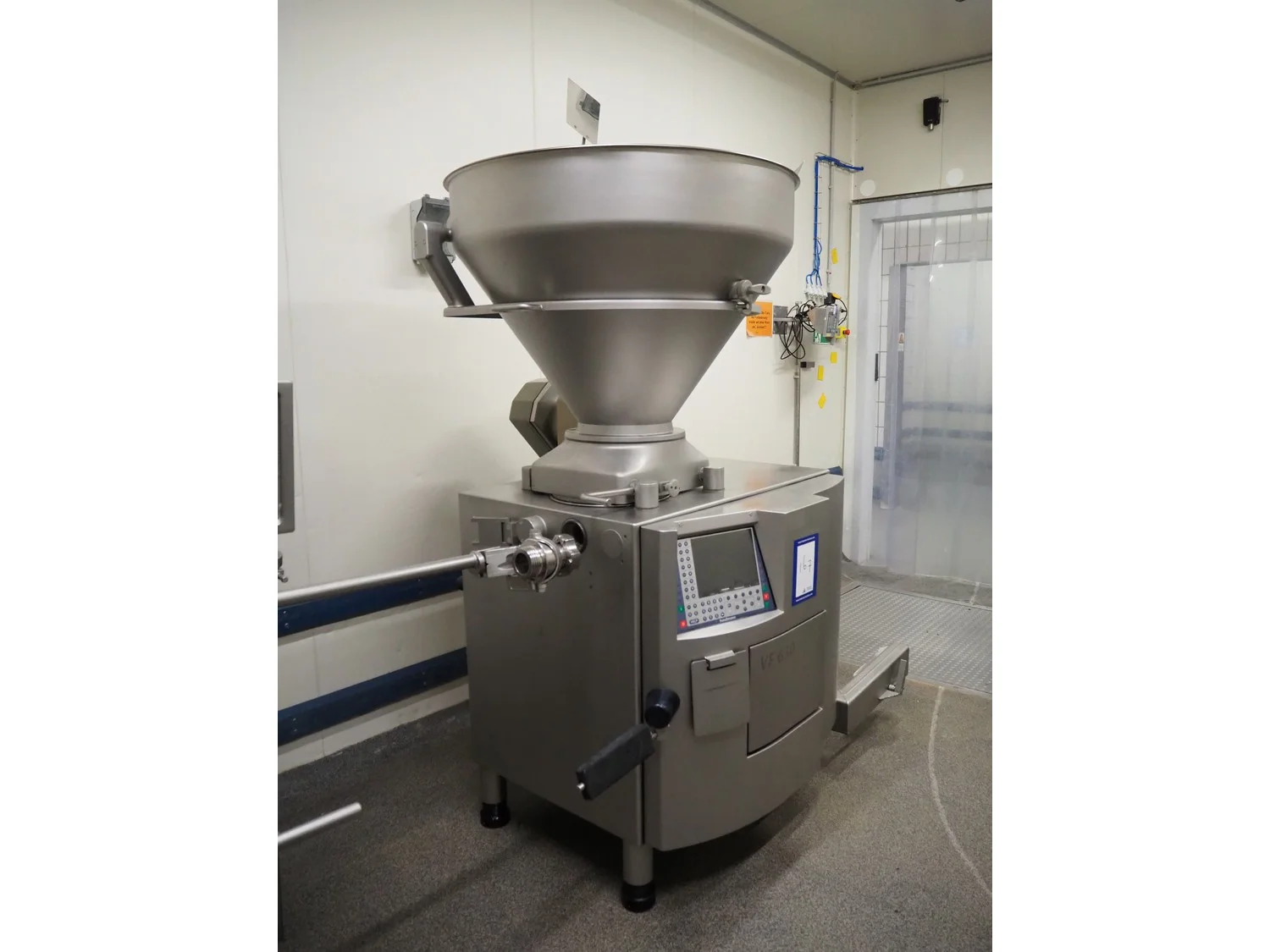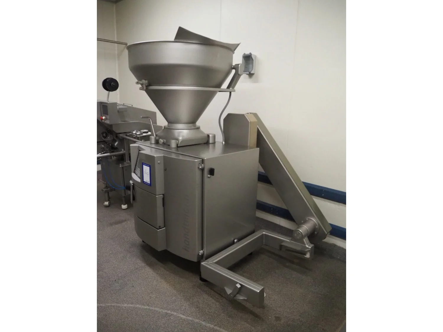 Handtmann vacuum filling machine with lifter for 200 liter meat bins, type: VF630, number: 32639, year of construction: 2013, 400 V, 3 Ph, 50 Hz, 18.0 A, 12.5 kW, Busch vacuum pump, type: KB 0040 D, serial number: 03040978, capacity: 48 m³ per hour, dimensions: 2000 mm x 1400 mm x 2200 mm.