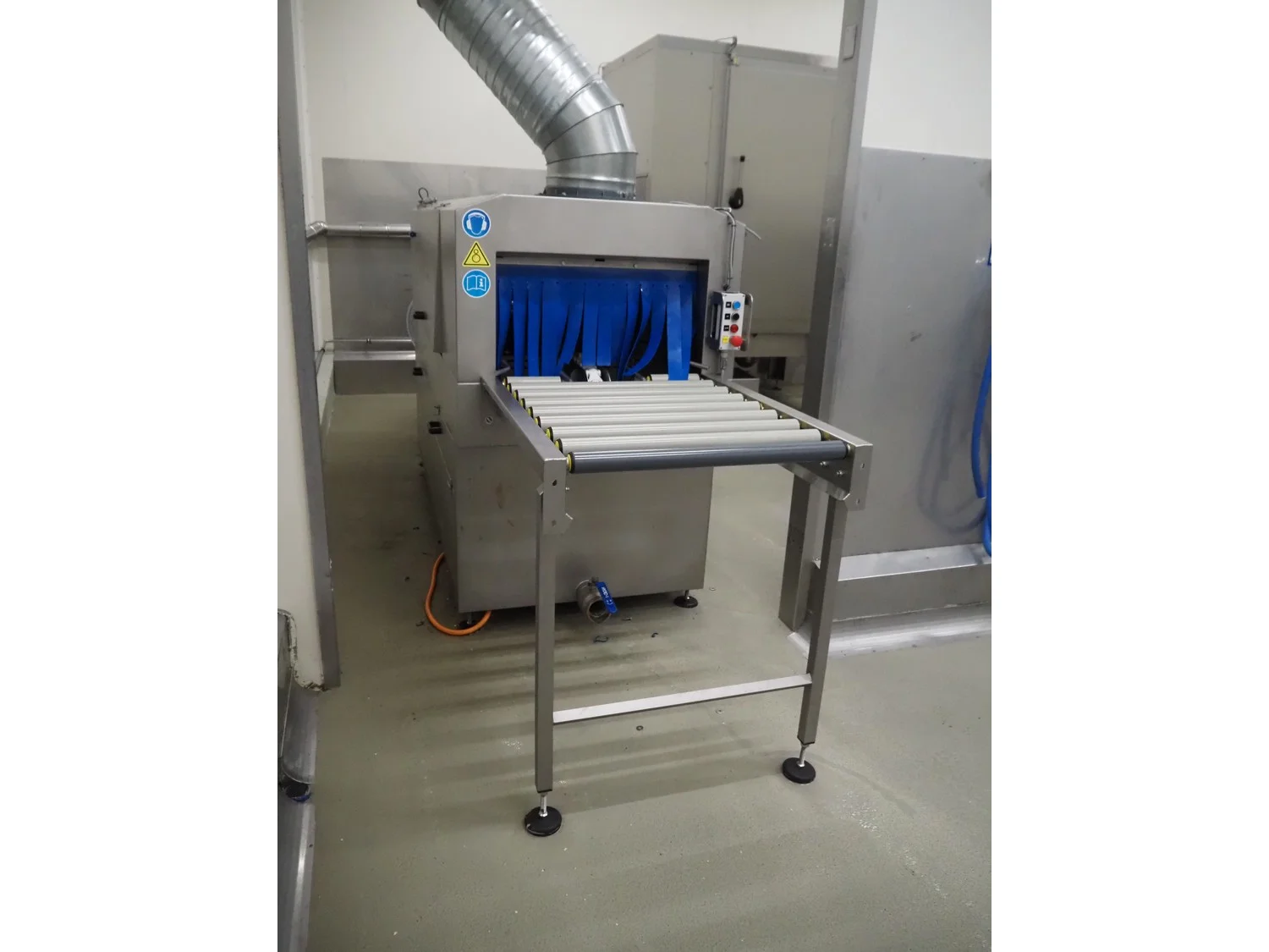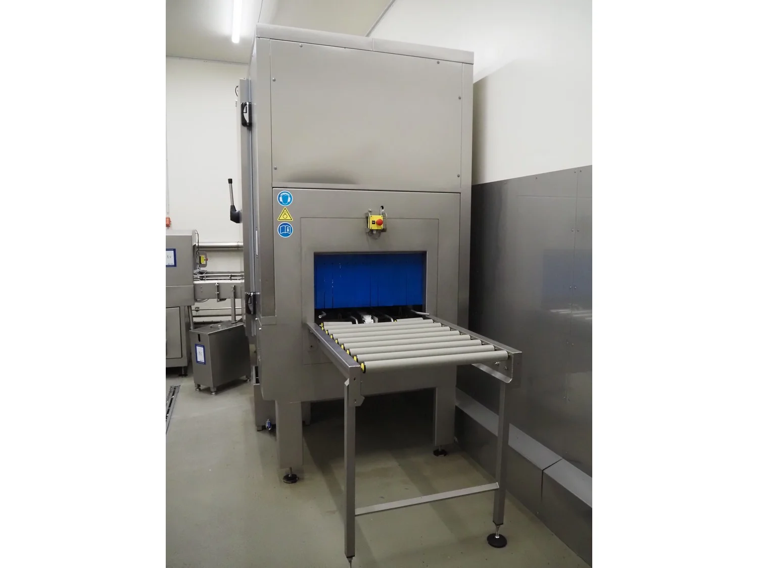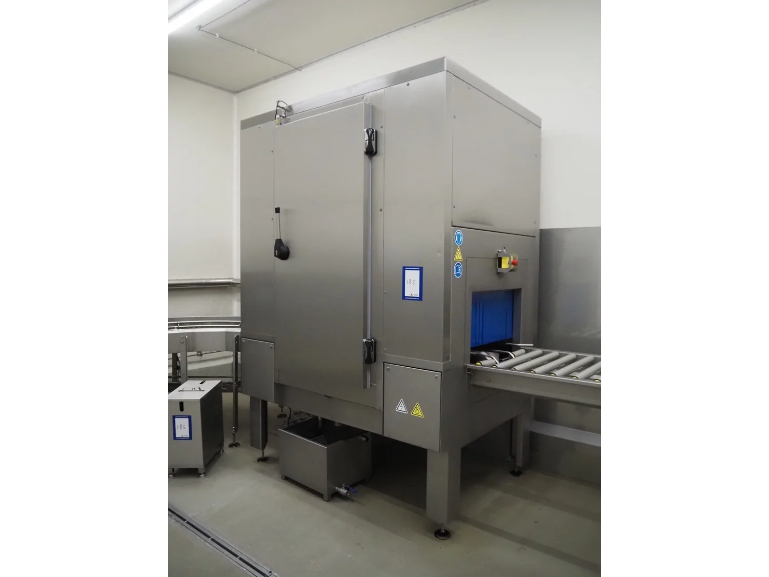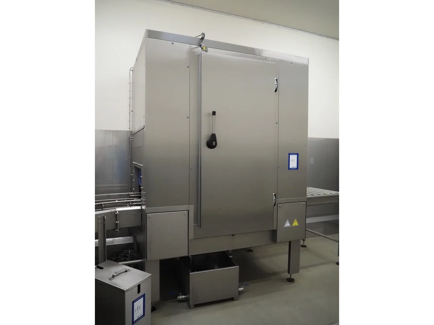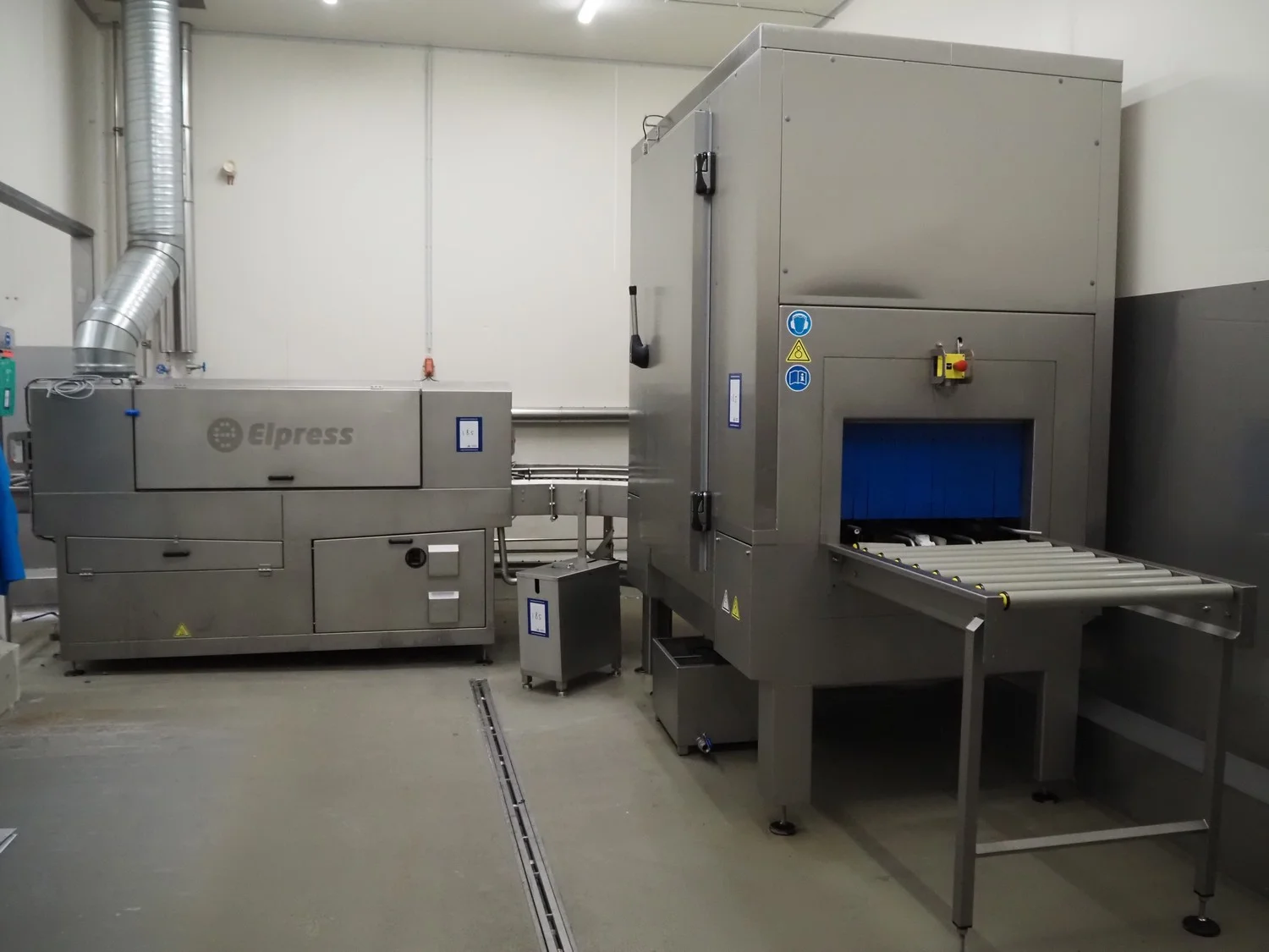 Elpress crate washing and drying machine with infeed and outfeed roller conveyors, type: 83101150, serial number: 43729, year of construction: 2023-8, 400 V, 3 Ph, 50 Hz, 32 A, 12 kW, maximum temperature: 70°C, plastic rollers, roller width: 700 mm, clearance: 750 mm x 470 mm, dimensions crate washer: 2500 mm x 1000 mm x 1650 mm, dimensions crate dryer: 1950 mm x 1450 mm x 2800 mm.