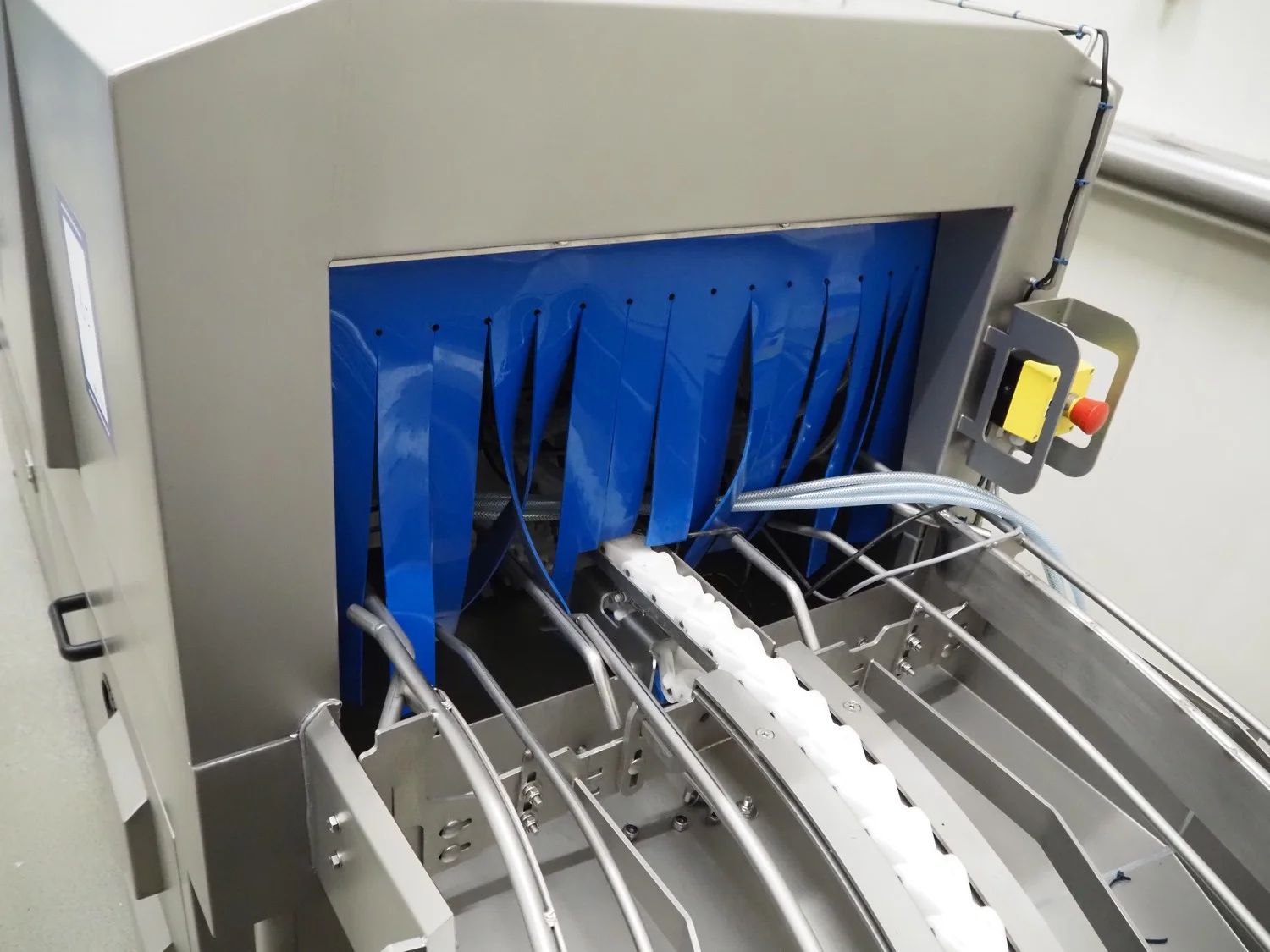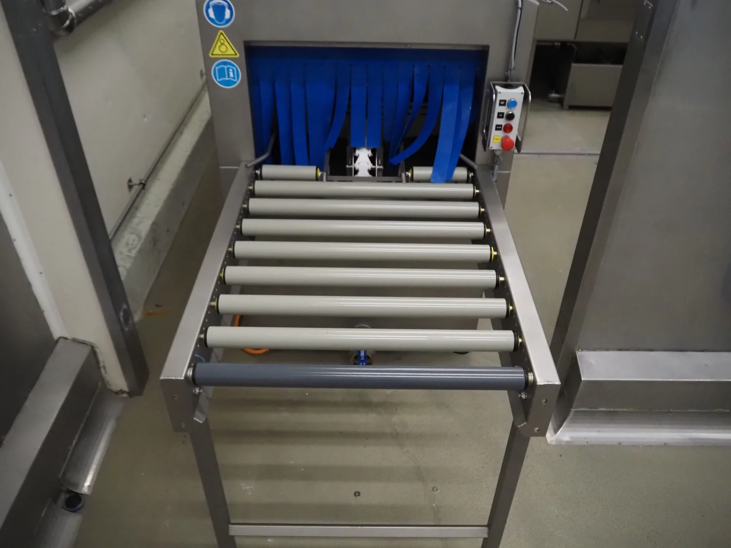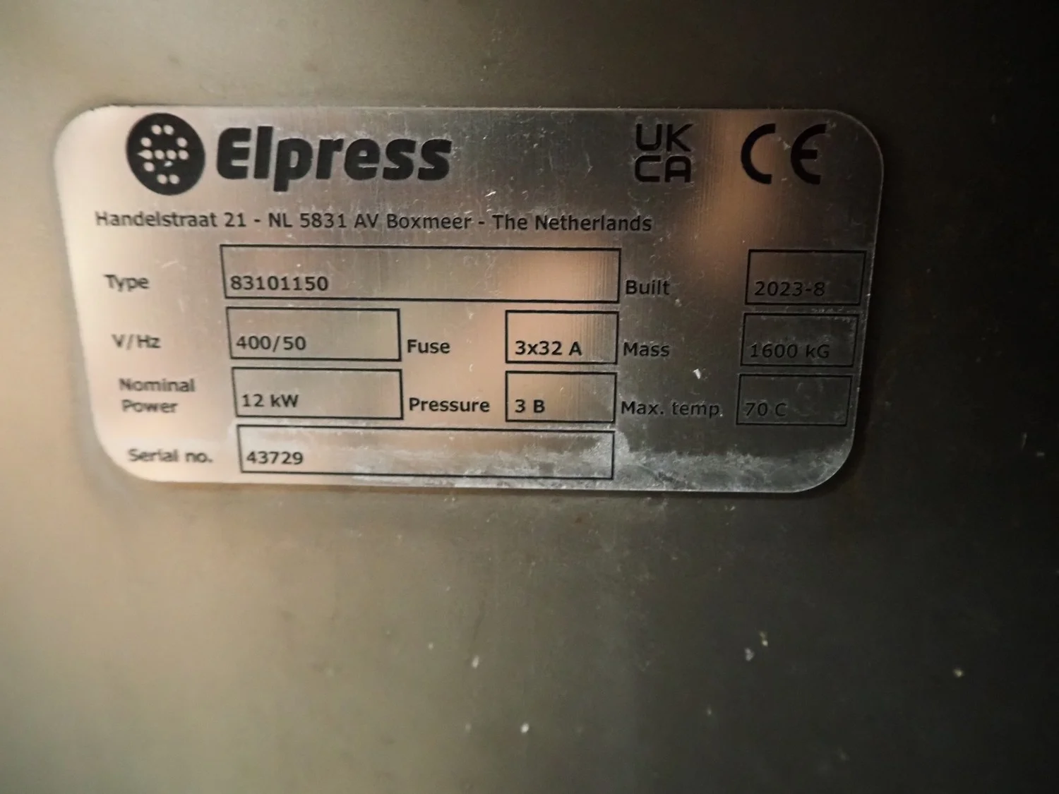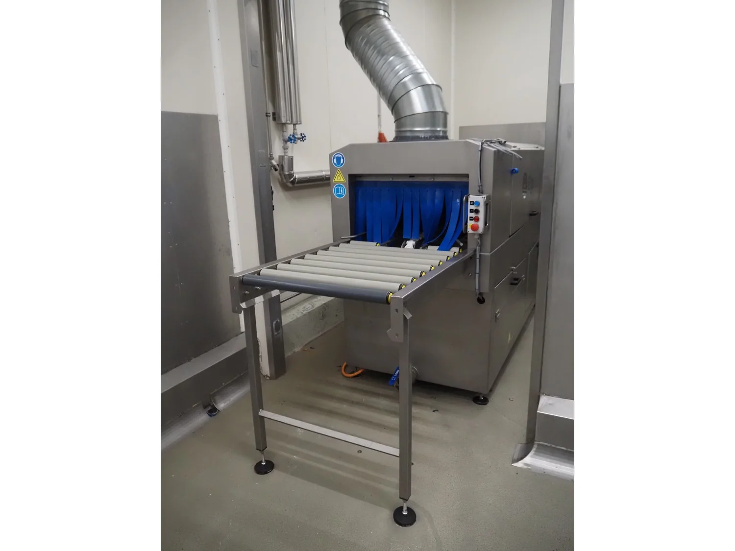 Elpress crate washing and drying machine with infeed and outfeed roller conveyors, type: 83101150, serial number: 43729, year of construction: 2023-8, 400 V, 3 Ph, 50 Hz, 32 A, 12 kW, maximum temperature: 70°C, plastic rollers, roller width: 700 mm, clearance: 750 mm x 470 mm, dimensions crate washer: 2500 mm x 1000 mm x 1650 mm, dimensions crate dryer: 1950 mm x 1450 mm x 2800 mm.
