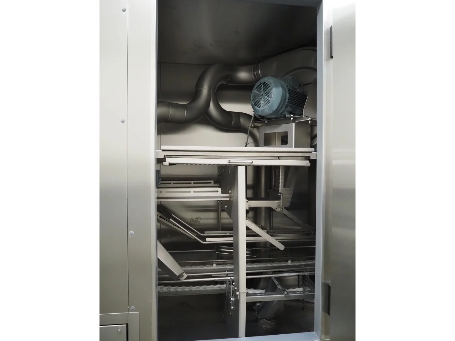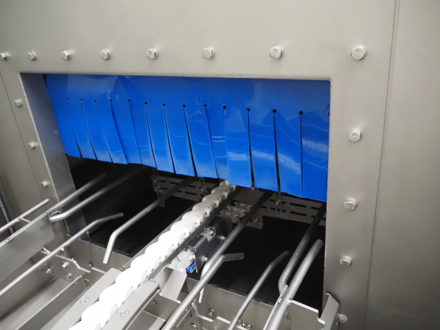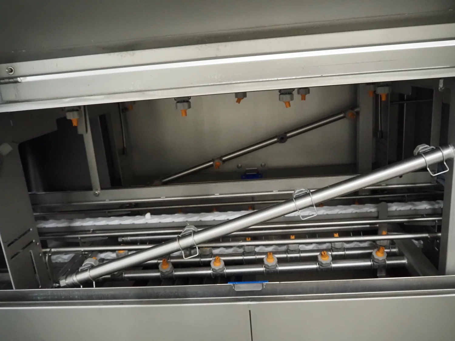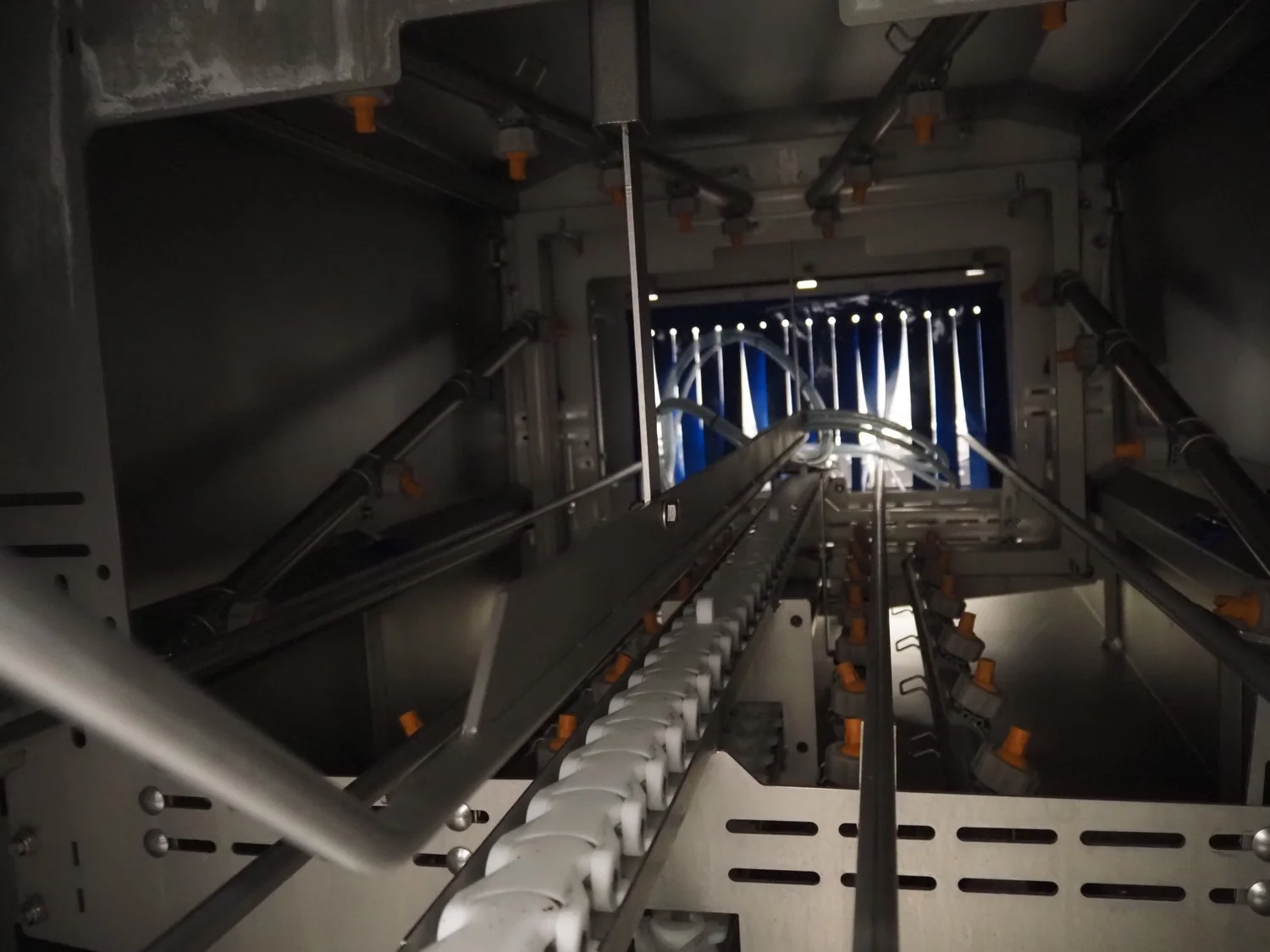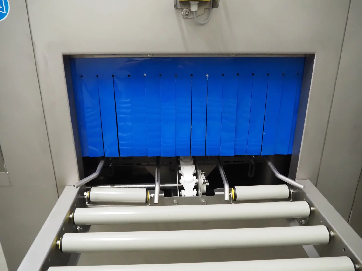 Elpress crate washing and drying machine with infeed and outfeed roller conveyors, type: 83101150, serial number: 43729, year of construction: 2023-8, 400 V, 3 Ph, 50 Hz, 32 A, 12 kW, maximum temperature: 70°C, plastic rollers, roller width: 700 mm, clearance: 750 mm x 470 mm, dimensions crate washer: 2500 mm x 1000 mm x 1650 mm, dimensions crate dryer: 1950 mm x 1450 mm x 2800 mm.