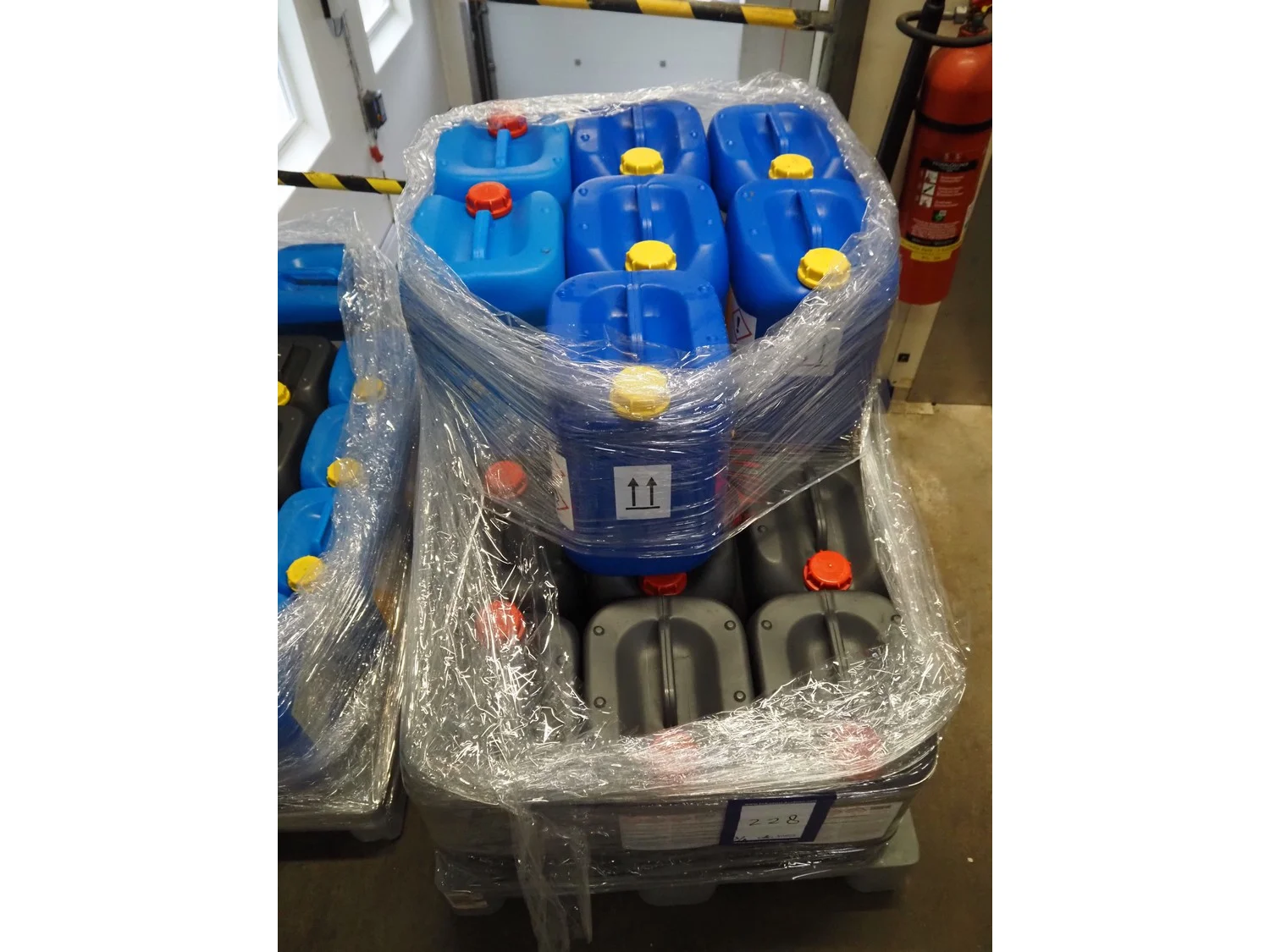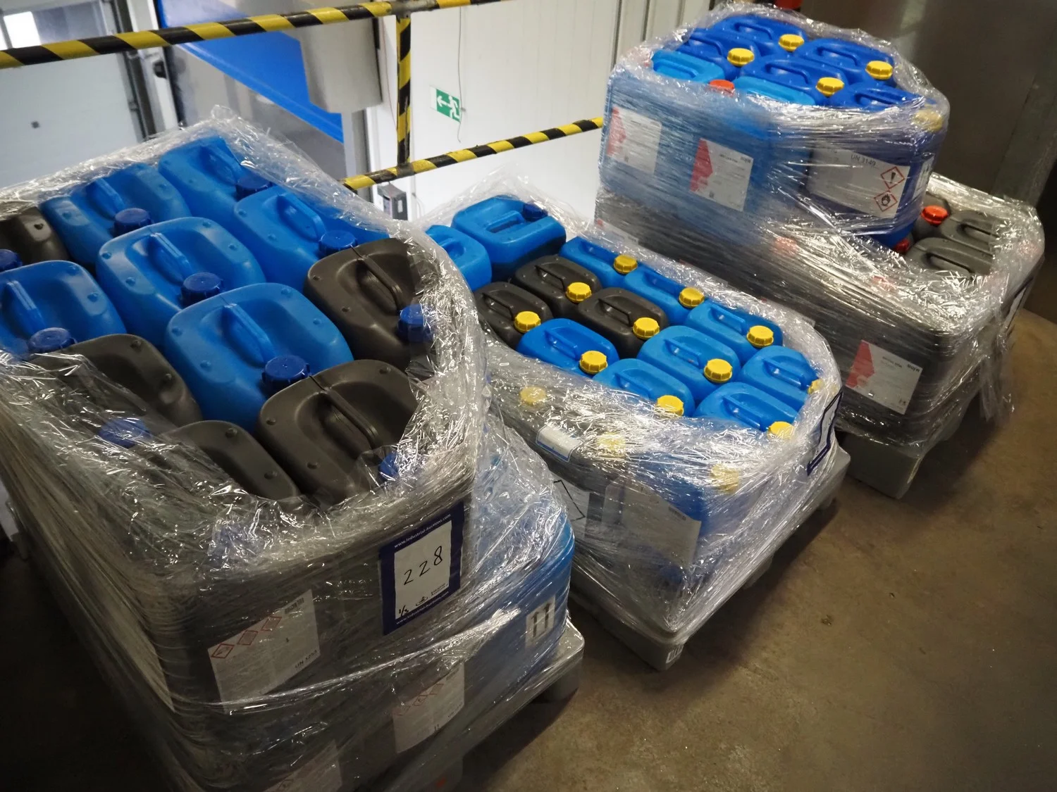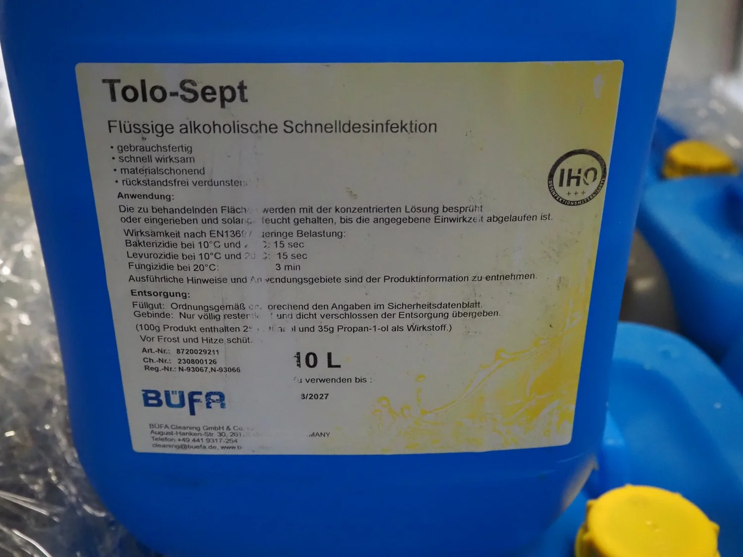 3 plastic pallets with 59 Büfa jerry cans with cleaning chemicals, dimensions: (3x) 1200 mm x 800 mm x 700 mm.