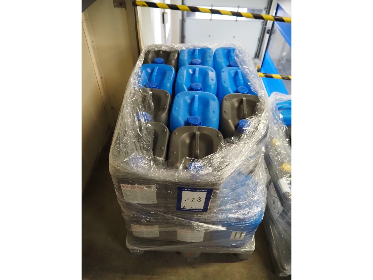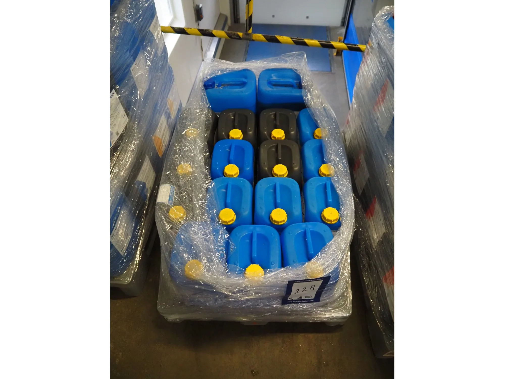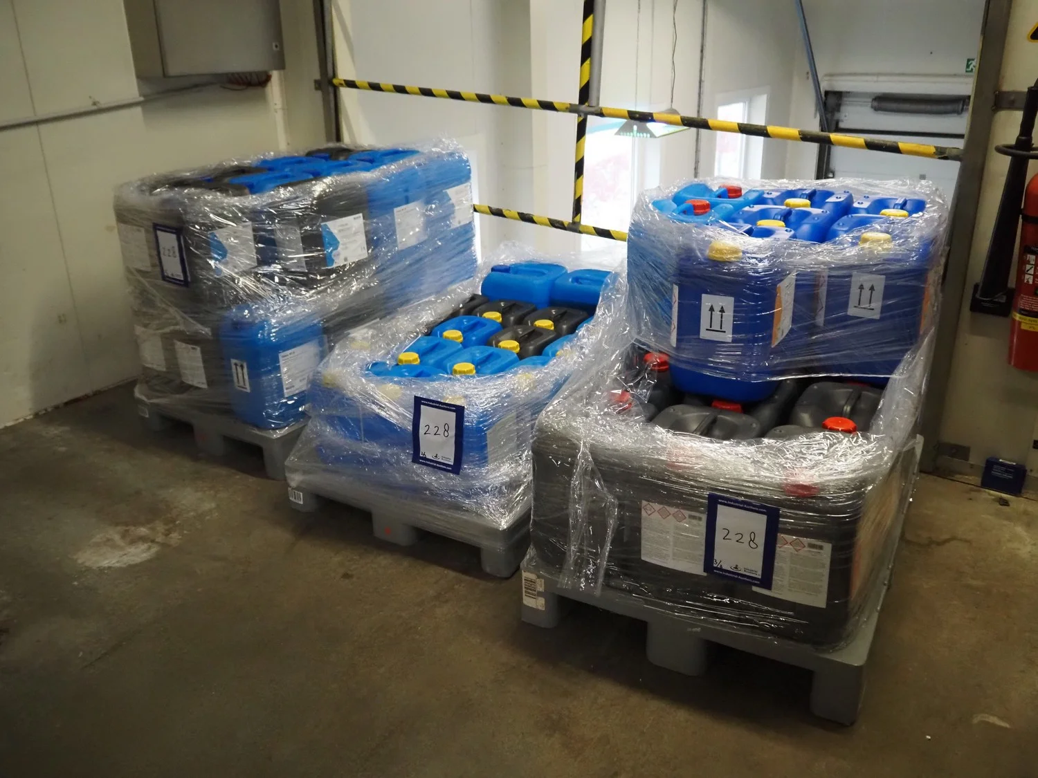 3 plastic pallets with 59 Büfa jerry cans with cleaning chemicals, dimensions: (3x) 1200 mm x 800 mm x 700 mm.