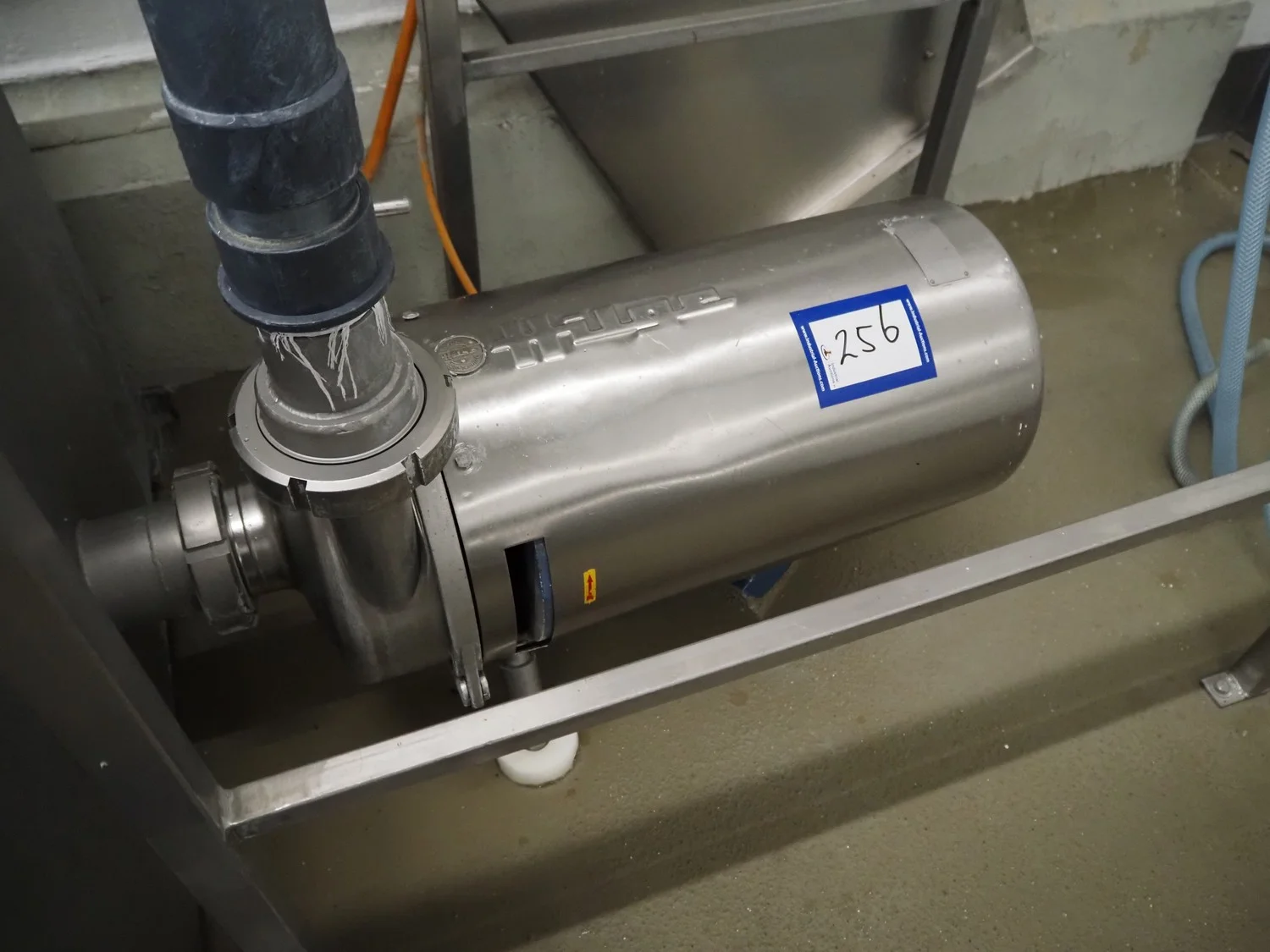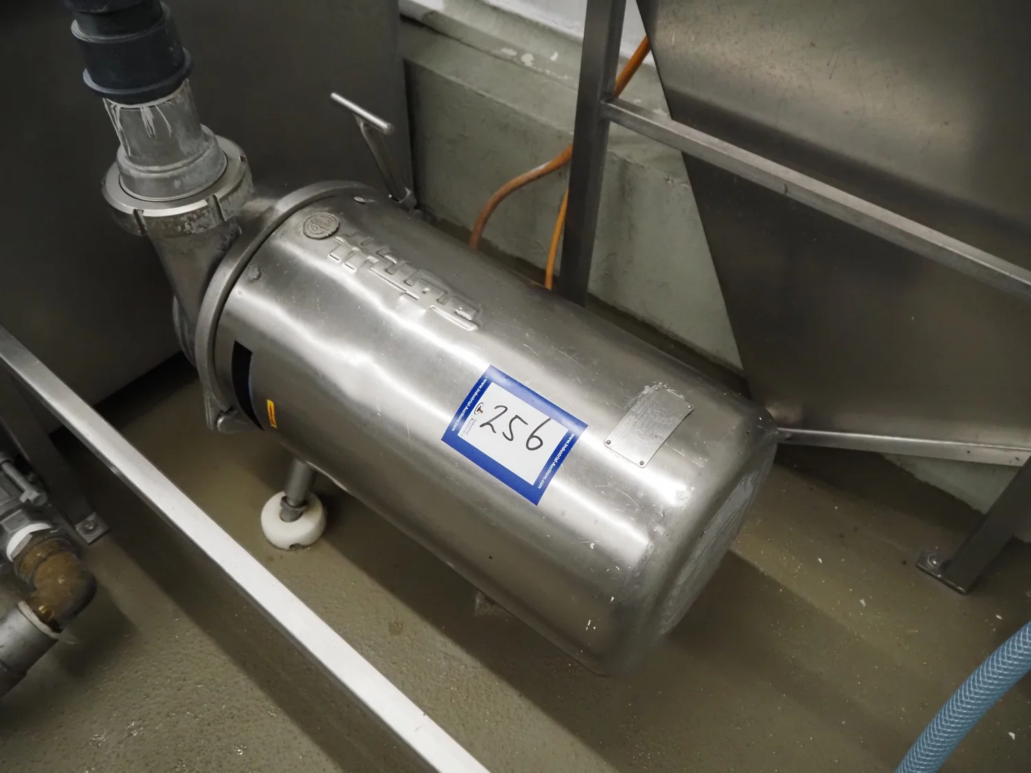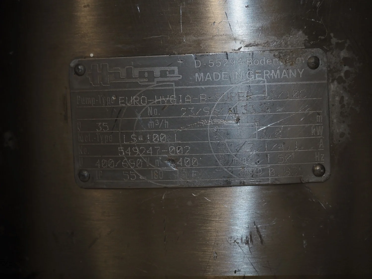 Hilge centrifugal pump, type: EURO-HYGIA-B-SUPER-II/10C, number: 23/96/113335, 400/690 V, 50 Hz, 7.1/4.1 A, 3 kW, capacity: 35 m³ per hour, dimensions: 600 mm x 300 mm x 450 mm.