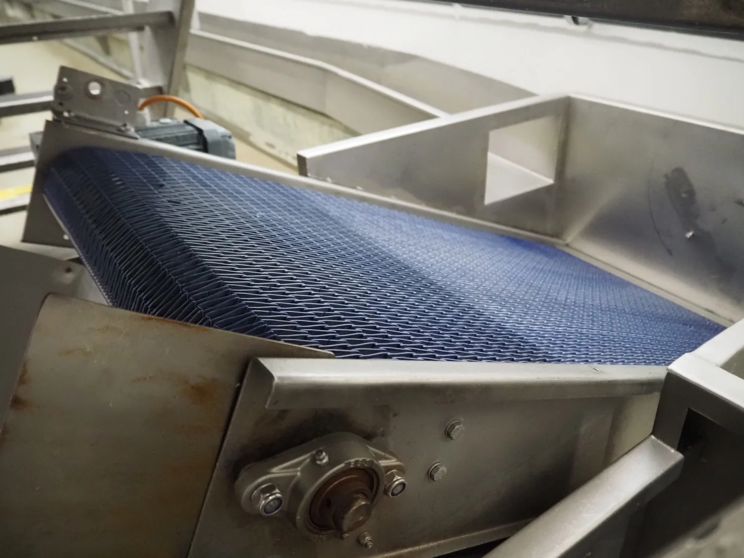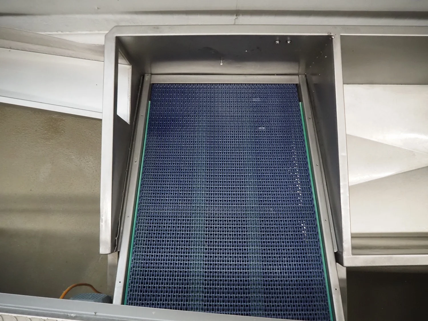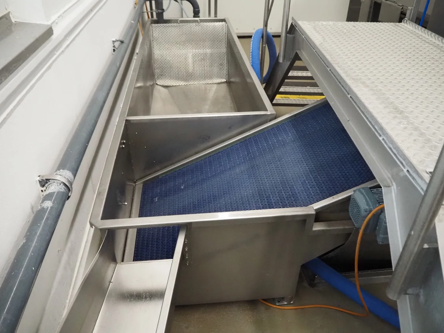 S/s tub with plastic outfeed belt, inside dimensions: 2300 mm x 750 mm x 530 mm, plastic mesh belt, belt width: 670 mm, total dimensions: 3200 mm x 830 mm x 900 mm.