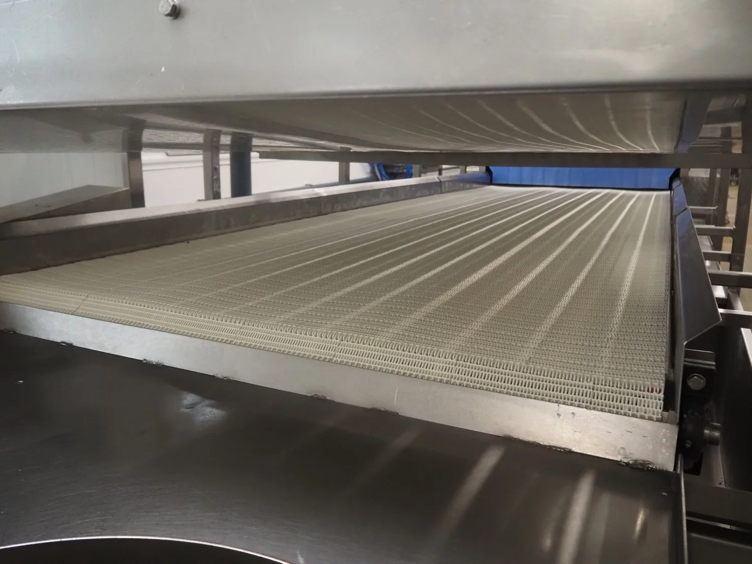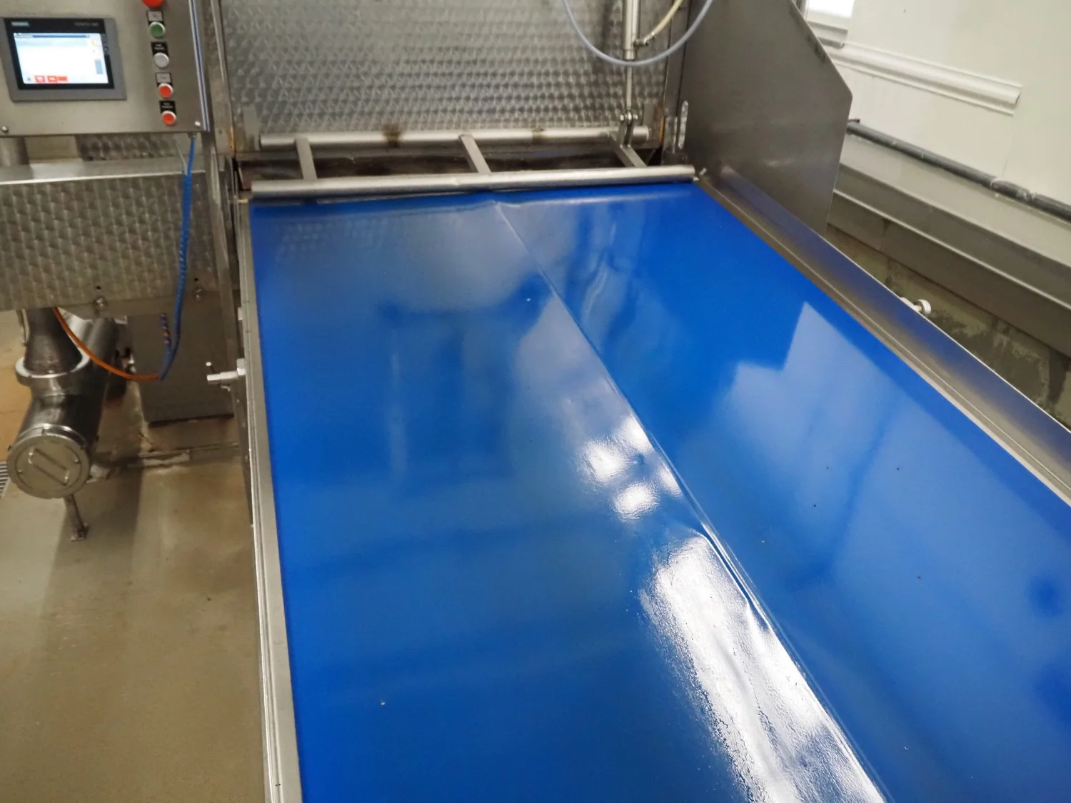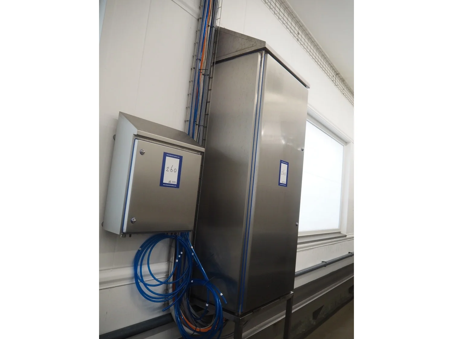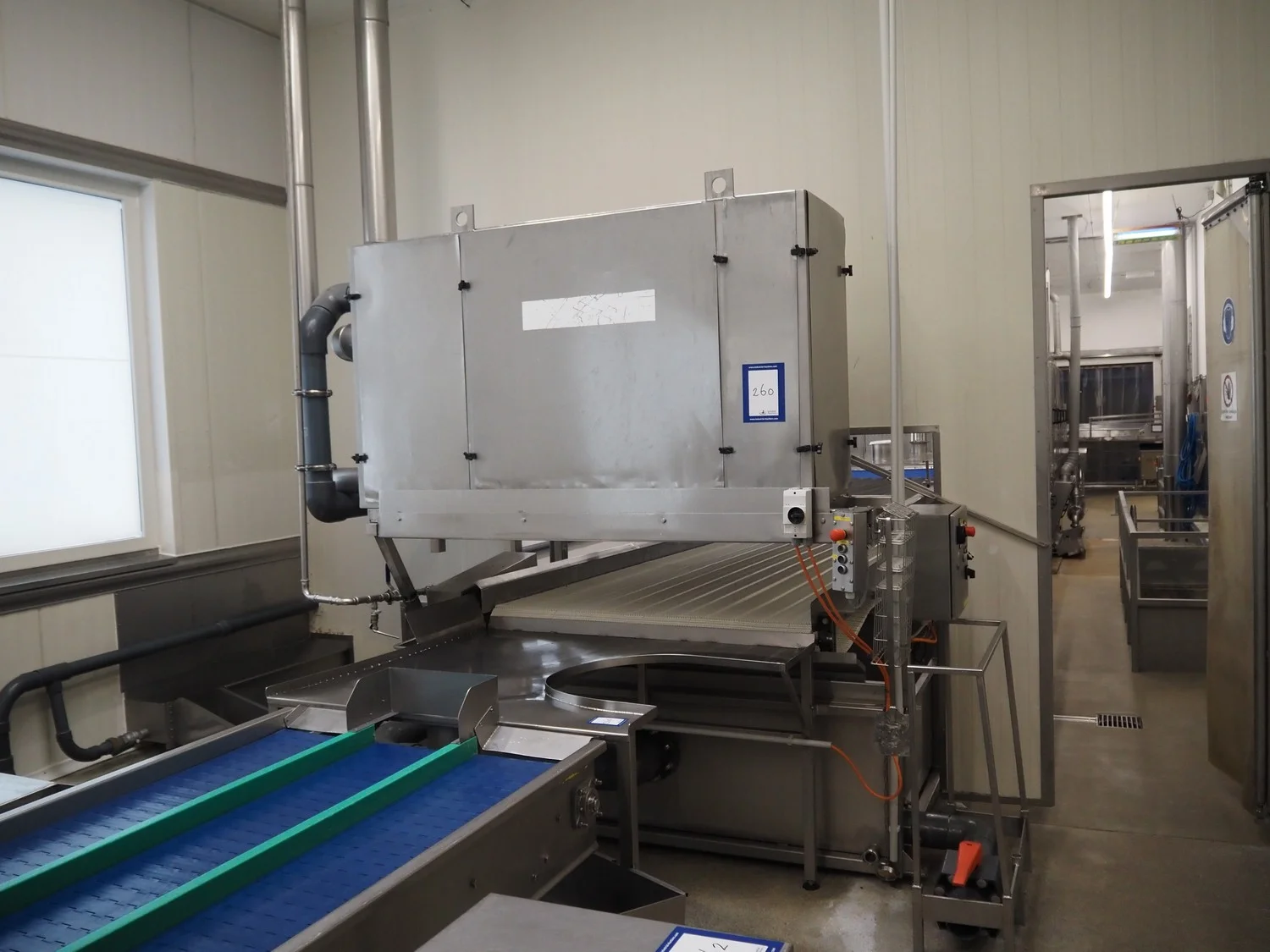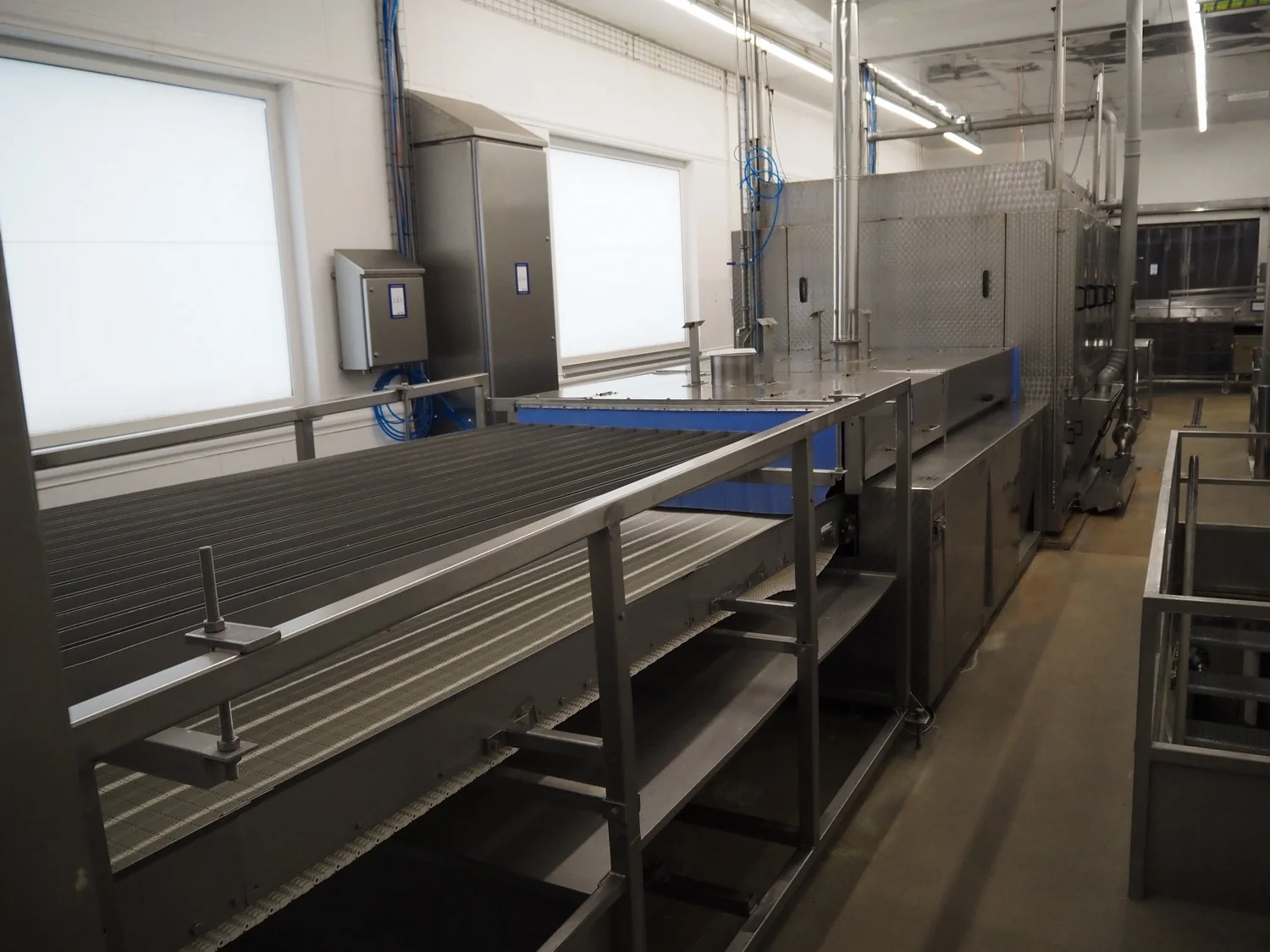 Cabbage cooking line consisting of: infeed belt, s/s frame, plastic belt, belt width: 1420 mm, total dimensions: 3100 mm x 1600 mm x 1050 mm. cooking belt with pricking system, s/s mesh belt, belt width: 1460 mm, total dimensions: 4100 mm x 2600 mm x 3600 mm and 3400 mm x 2200 mm x 1700 mm. outfeed belt, plastic mesh belt, belt width: 1420 mm, total dimensions: 4700 mm x 2000 mm x 2570 mm. outfeed table, dimensions: 1450 mm x 1300 mm x 1100 mm. 4 circulation pumps 3 s/s switch cabinets.