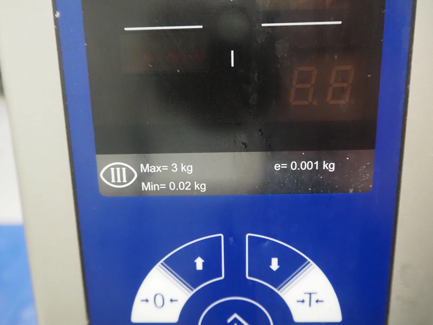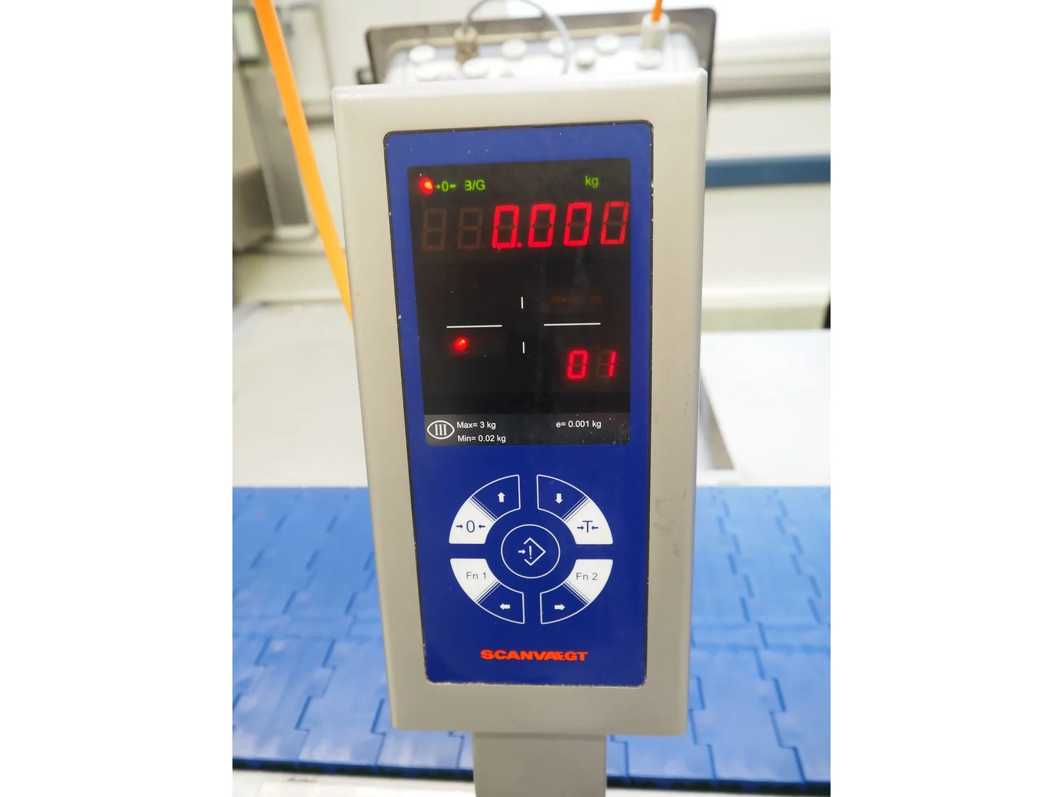 Scanvaegt weighing scale, maximum weight: 3 kg, minimum weight: 0.02 kg, e= 0.001 kg, dimensions: 300 mm x 300 mm x 450 mm.