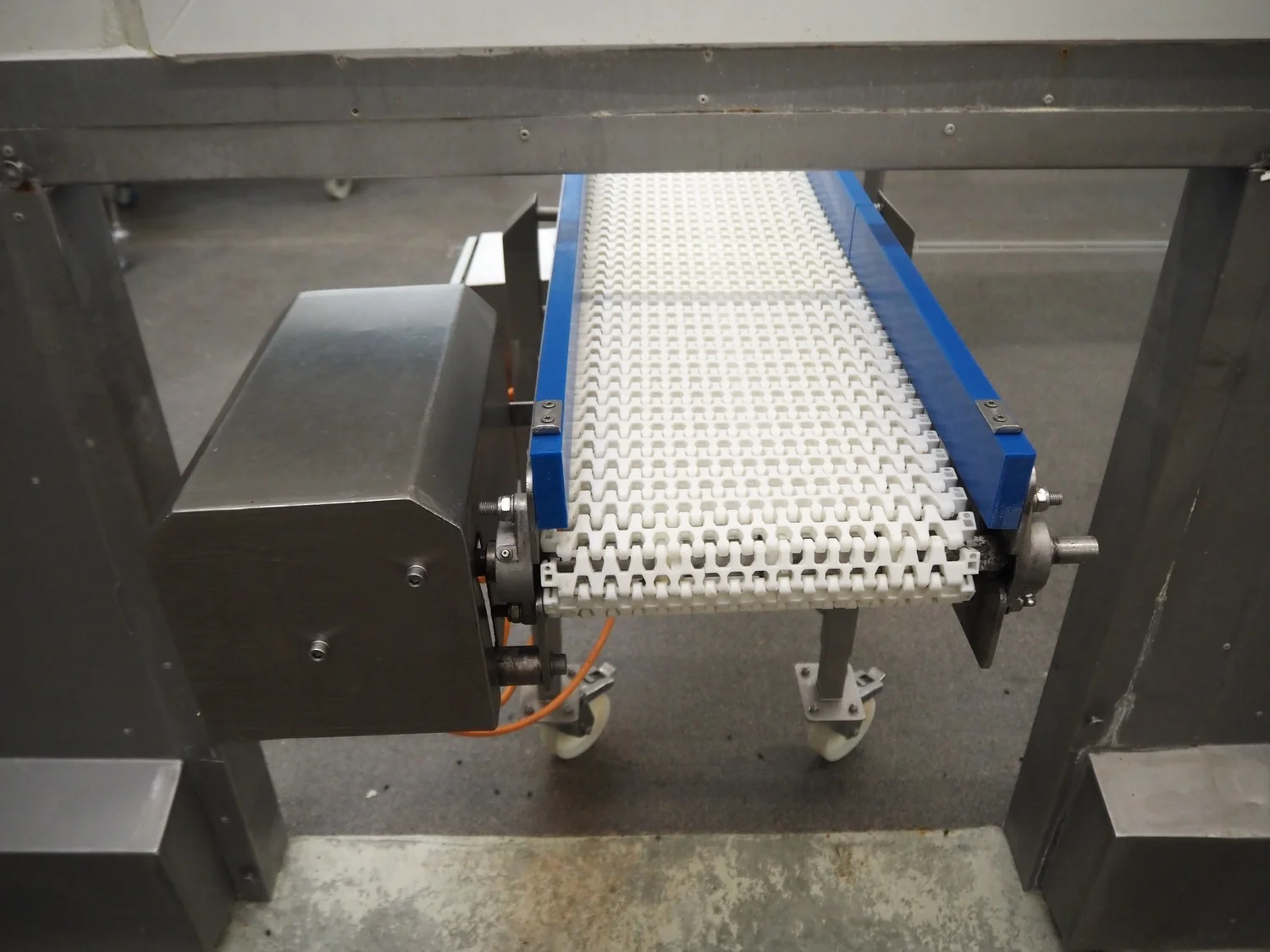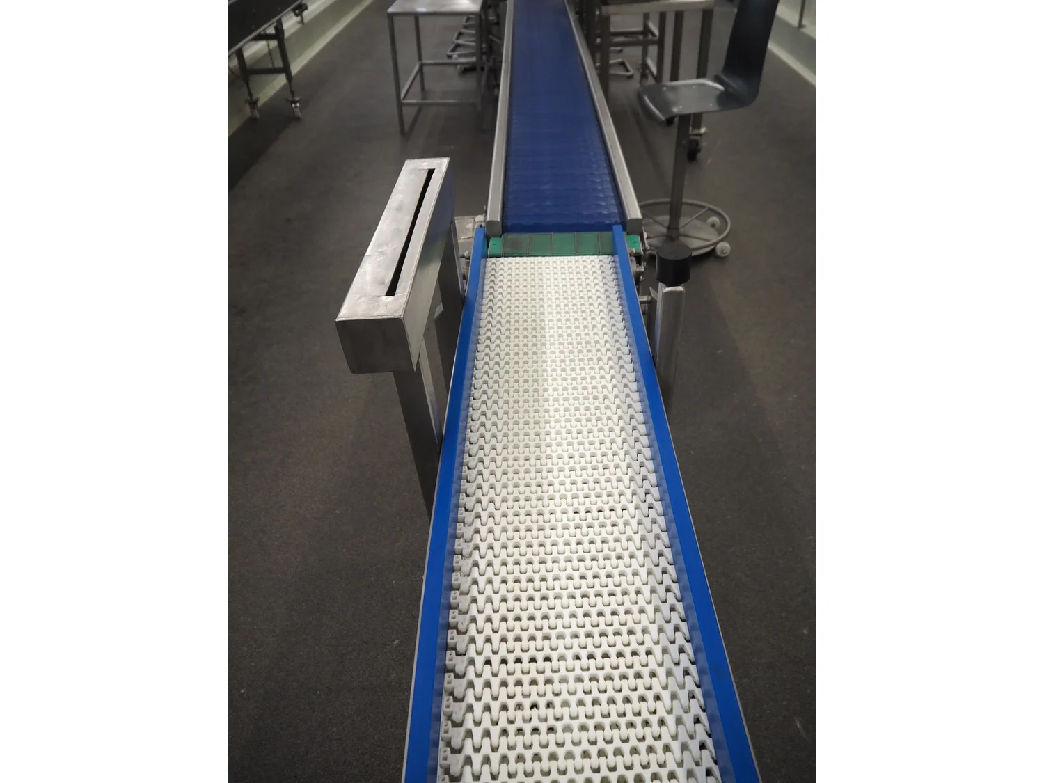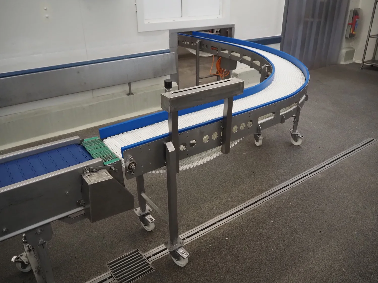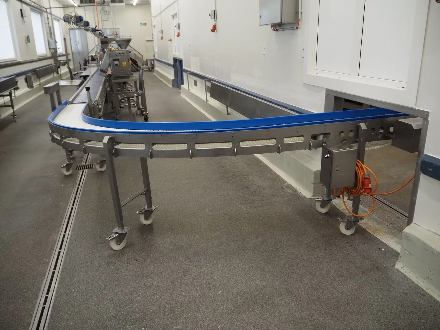 90° mobile curve conveyor, s/s frame, plastic mesh belt, belt width: 270 mm, total dimensions: 3100 mm x 2800 mm x 1150 mm.