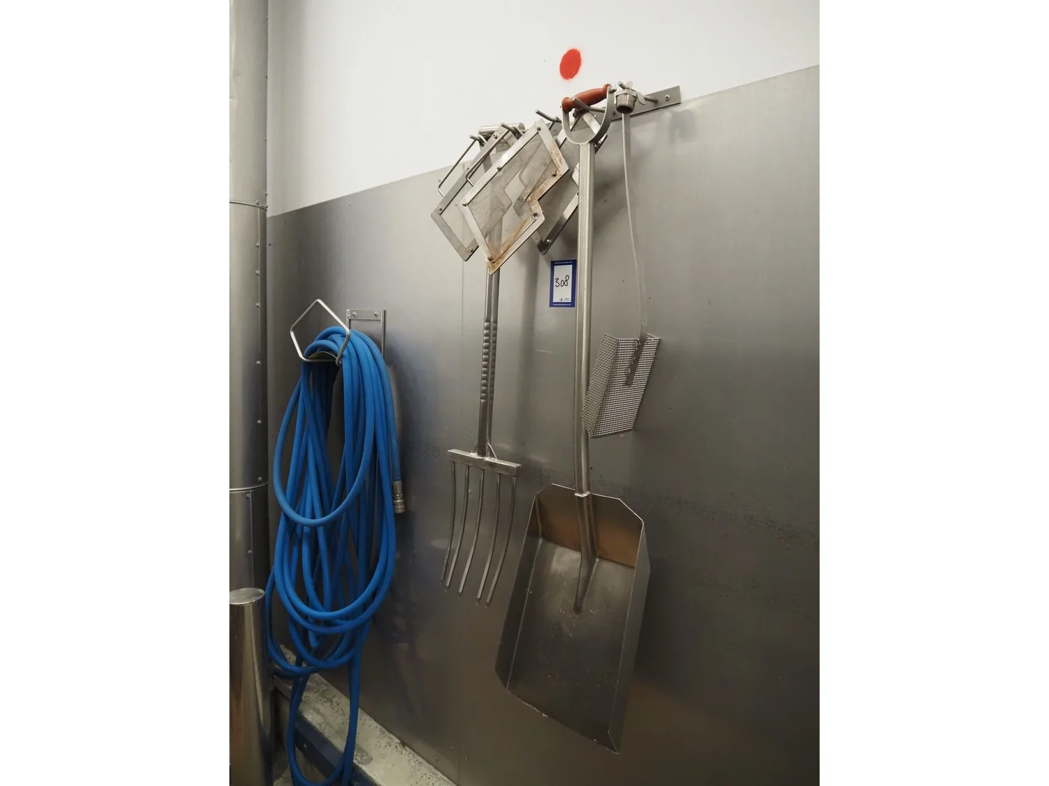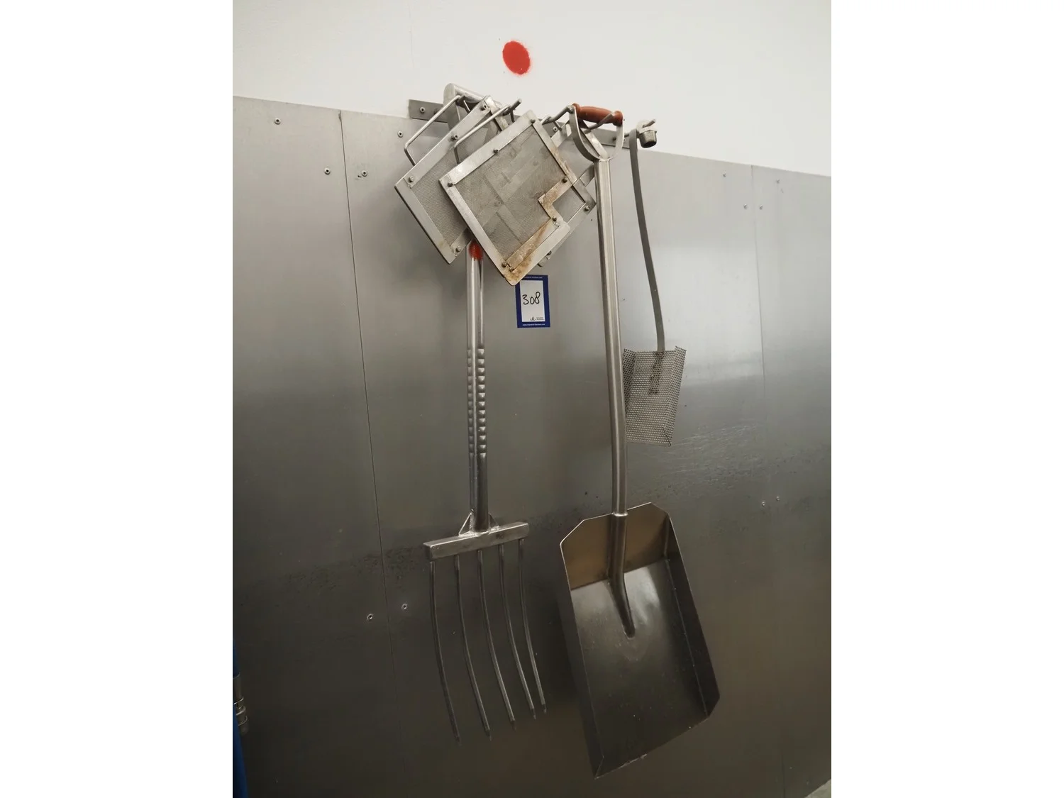 S/s peg with s/s pitchfork and s/s shovel, length peg: 500 mm.