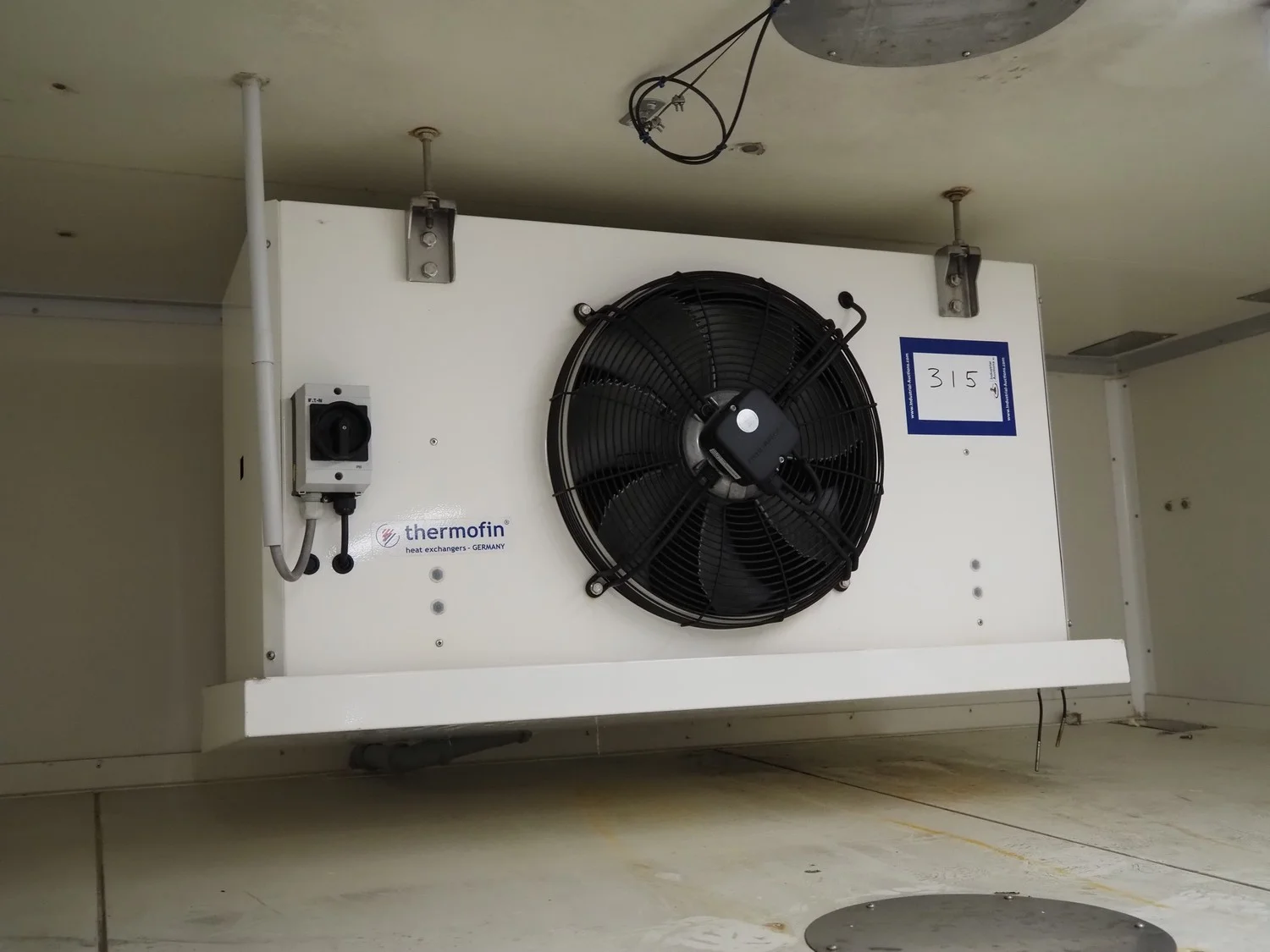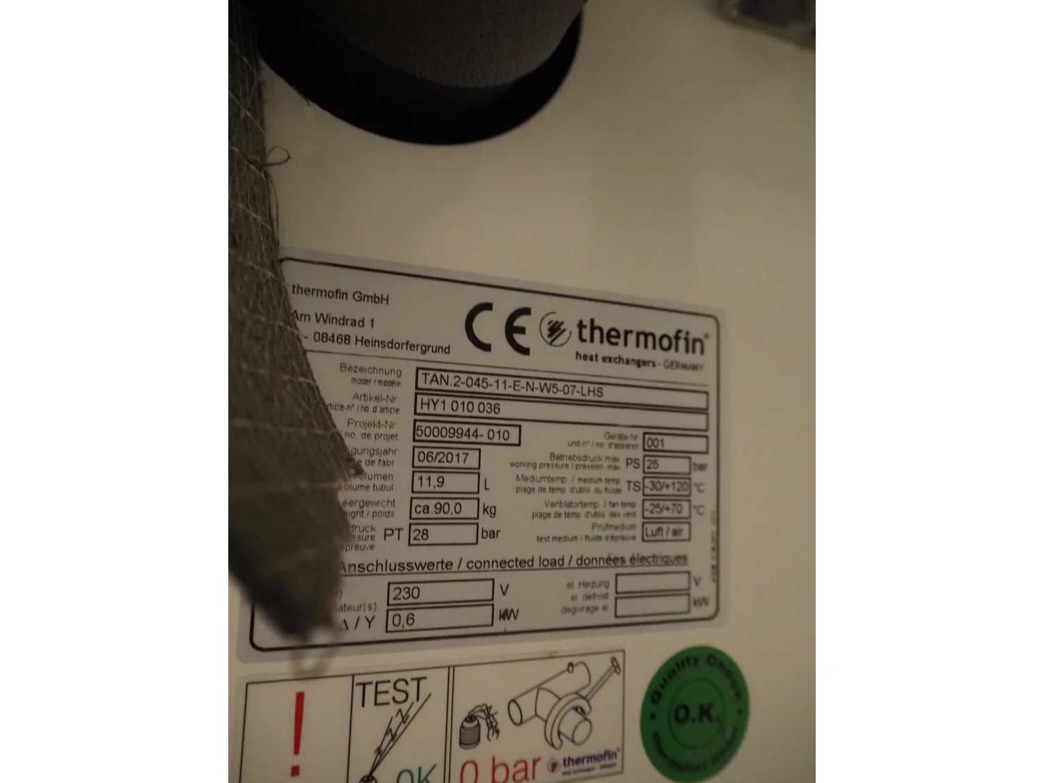 Thermofin GmbH evaporator, model: TAN.2-045-11-E-N-W5-07-LHS, article number: HY1 010 036, year of construction: 2017, 230 V, 0.6 kW, tube volume: 11.9 liter, medium temperature: -30˚ / + 120˚C, empty weight: 90 kg, 1 fan, dimensions: 1300 mm x 700 mm x 900 mm.