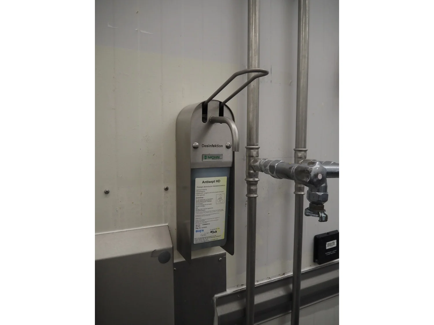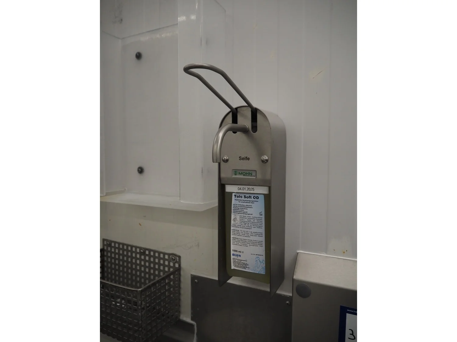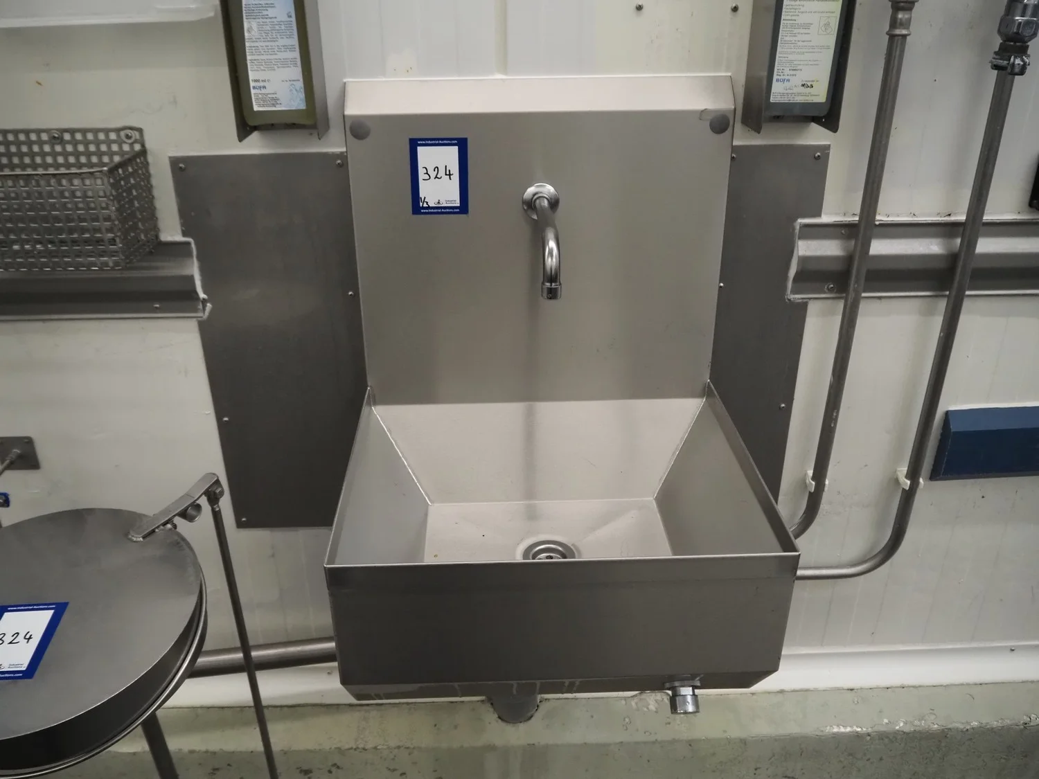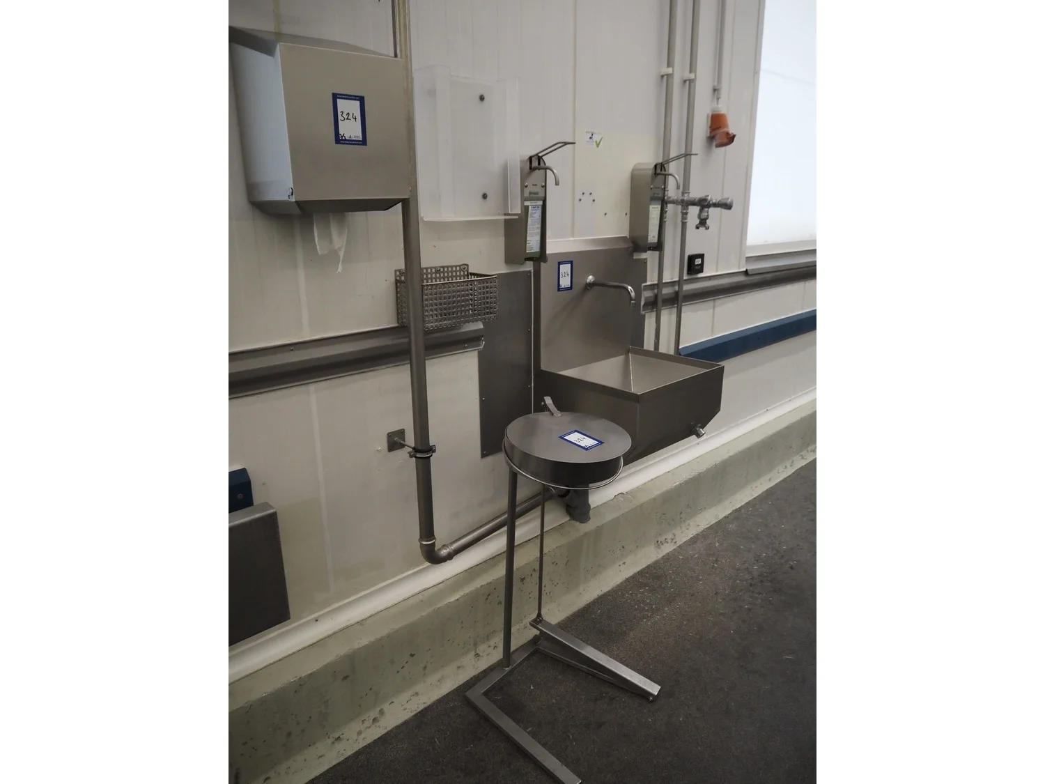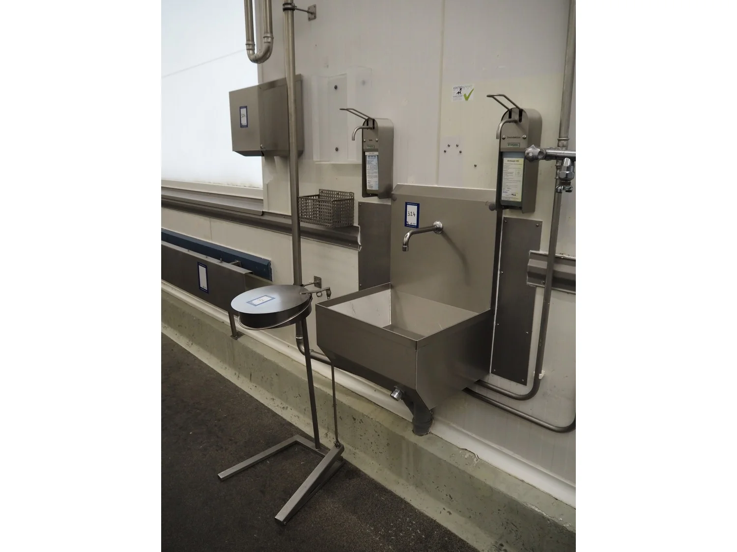 S/s sink with 1 faucet, knee control, dimensions sink: 500 mm x 450 mm x 690 mm, 2 Mohn s/s soap dispensers and s/s paper dispenser, dimensions: 300 mm x 250 mm x 400 mm and s/s waste bag holder, foot control, dimensions: 500 mm x 400 mm x 900 mm.