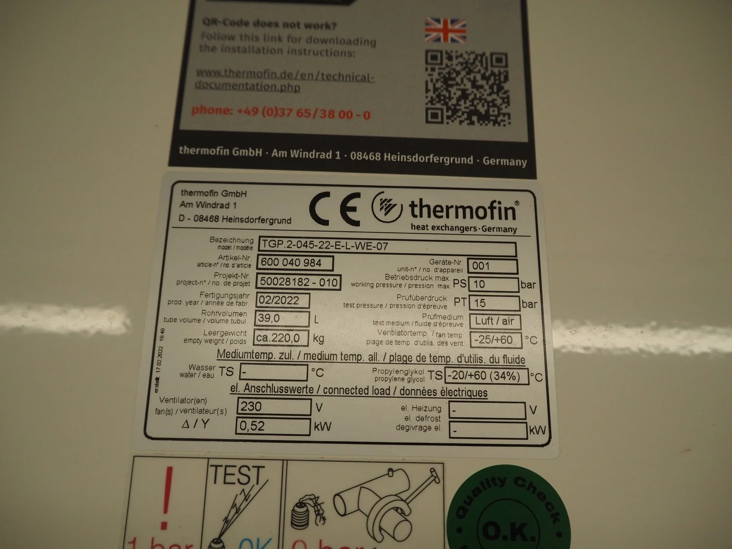 Thermofin GmbH evaporator, model: TGP.2-045-22-E-L-WE-07, unit number: 001, year of construction: 2022, 230 V, 0.52 kW, maximum working pressure: 15 bar, medium temperature allowable - propylene glycol: TS - 20/+60 (34%) 60˚C, empty weight: 220 kg, dimensions: 2400 mm x 2000 mm x 800 mm.