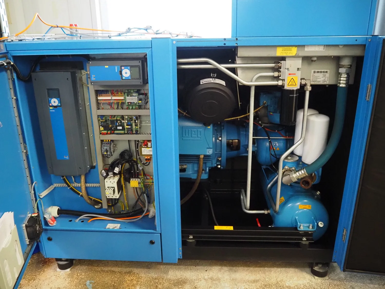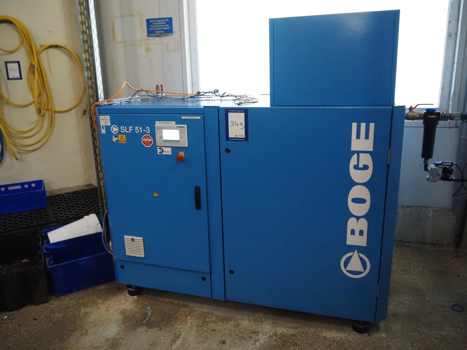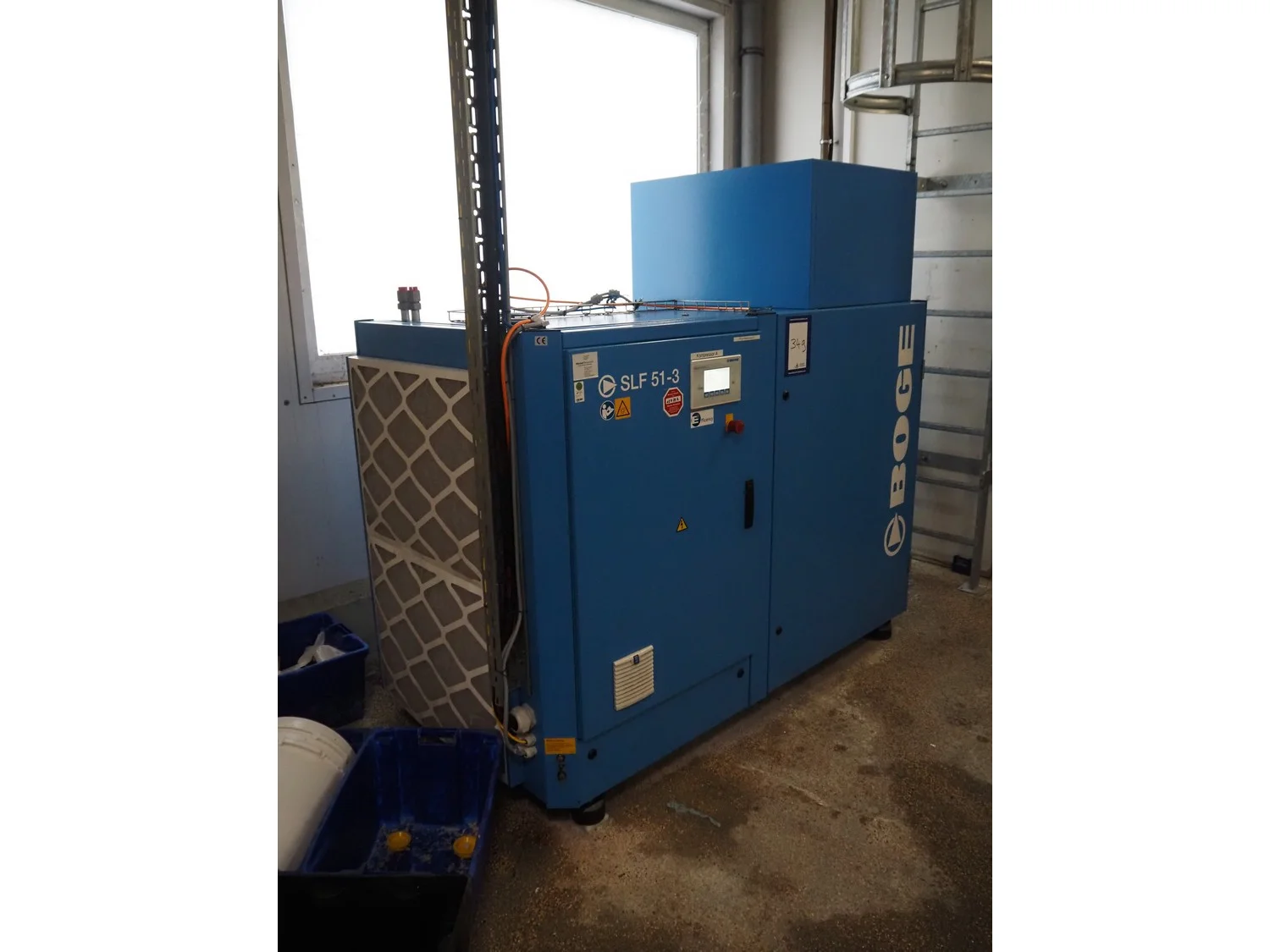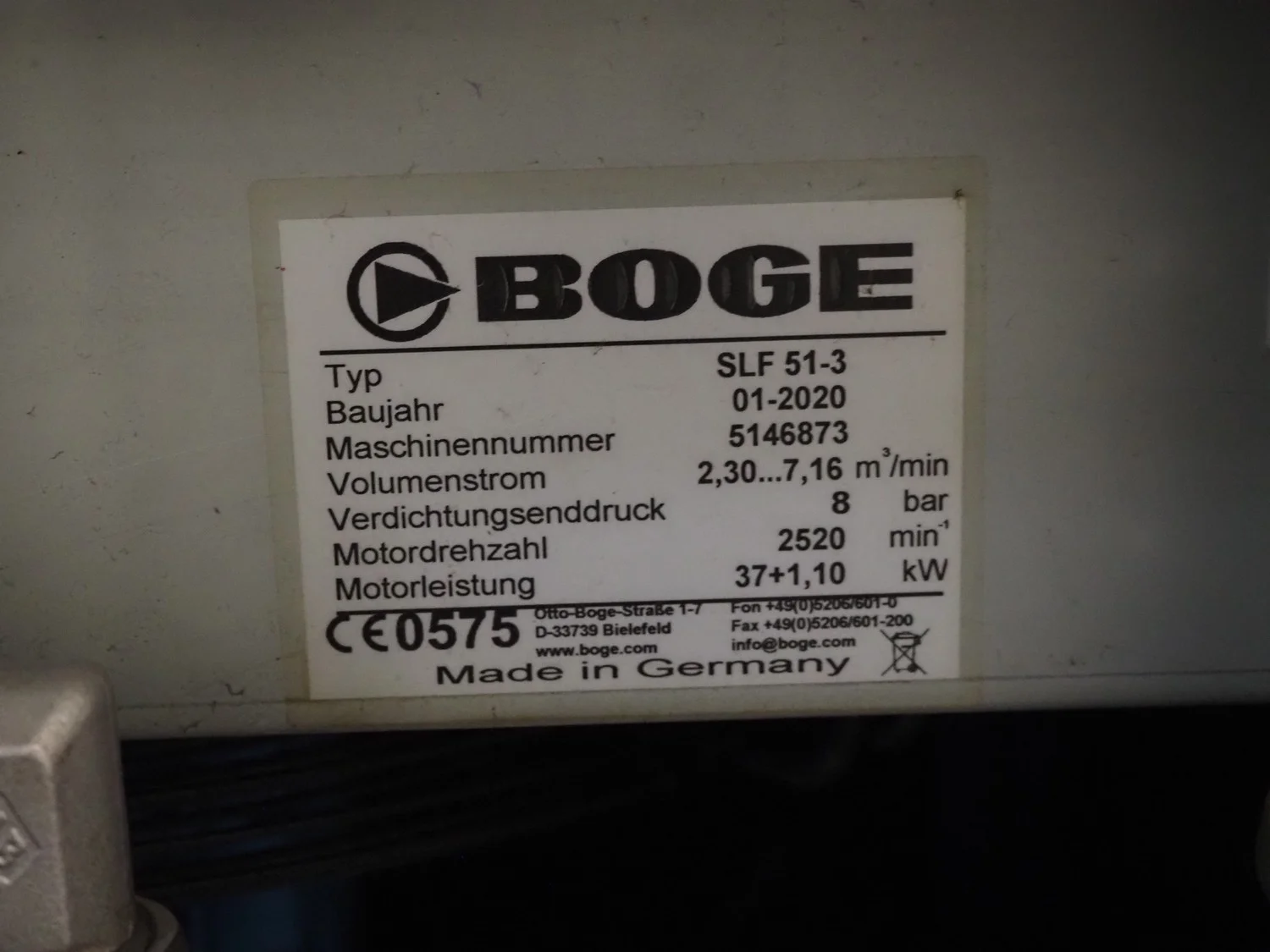 Boge Kompressoren screw air compressor, type: SLF 51-3, machine number: 5146873, year of construction: 01-2020, volume: 2.30 - 7.16 m³ / minute, 8 bar, 2520 rates per minute, motor power: 37 + 1.10 kW, total dimensions: 2000 mm x 1100 mm x 1950 mm.