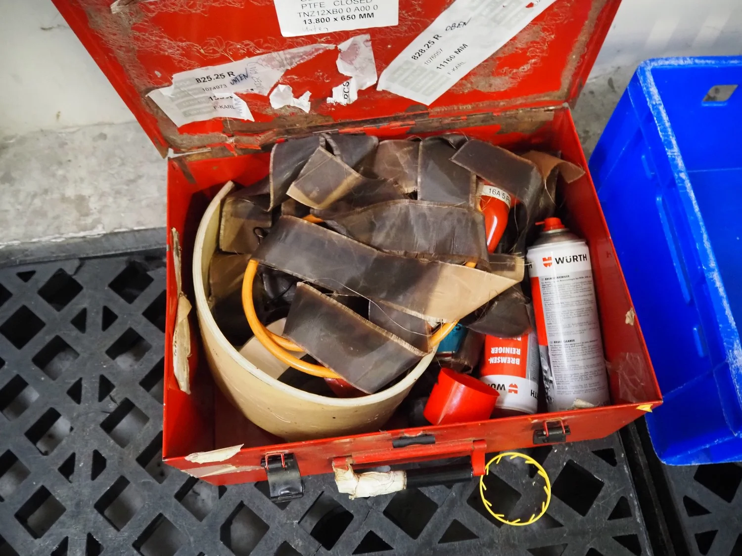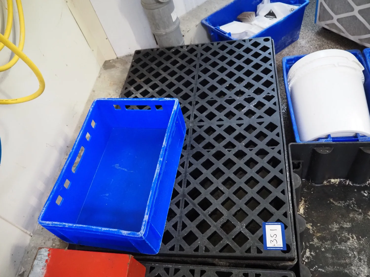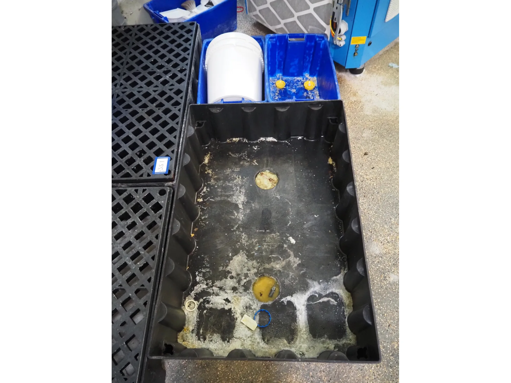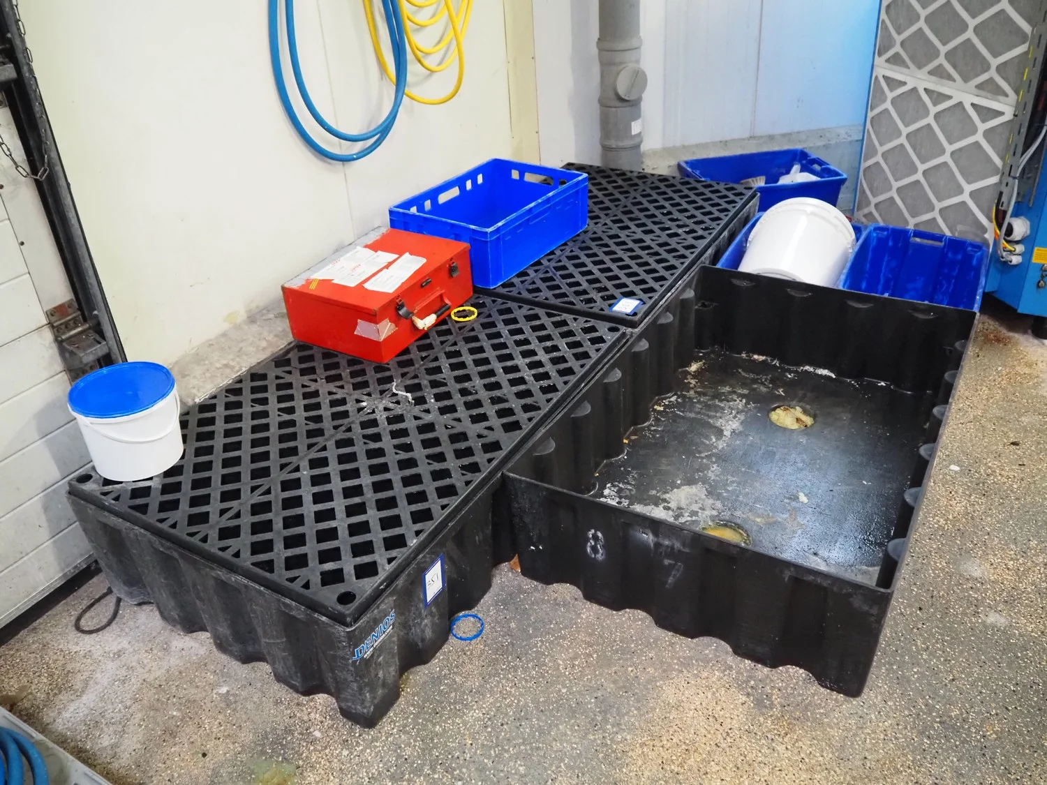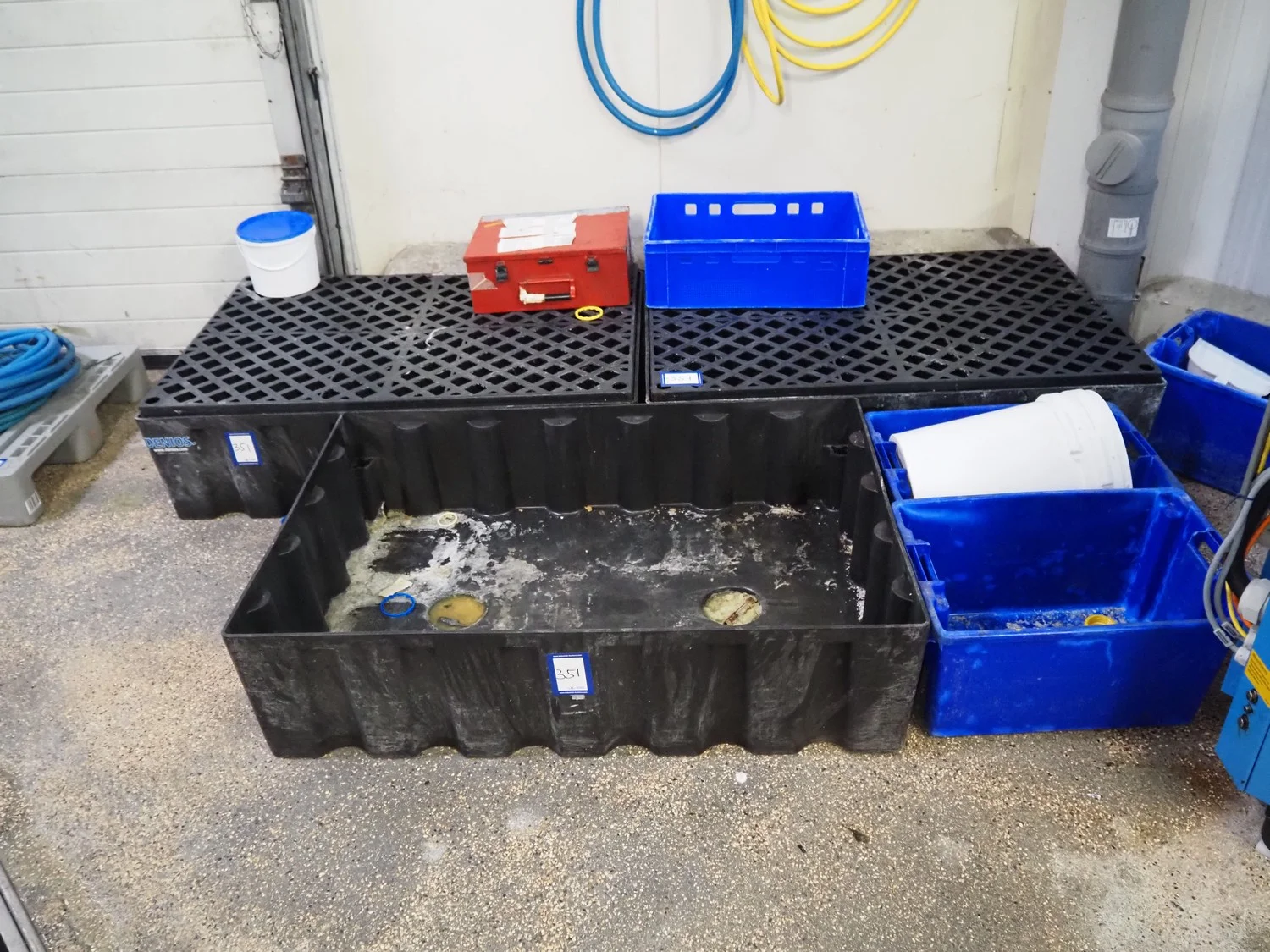 3 Denios plastic drip trays, dimensions: (3x) 1200 mm x 830 mm x 350 mm. 1 is missing top cover.