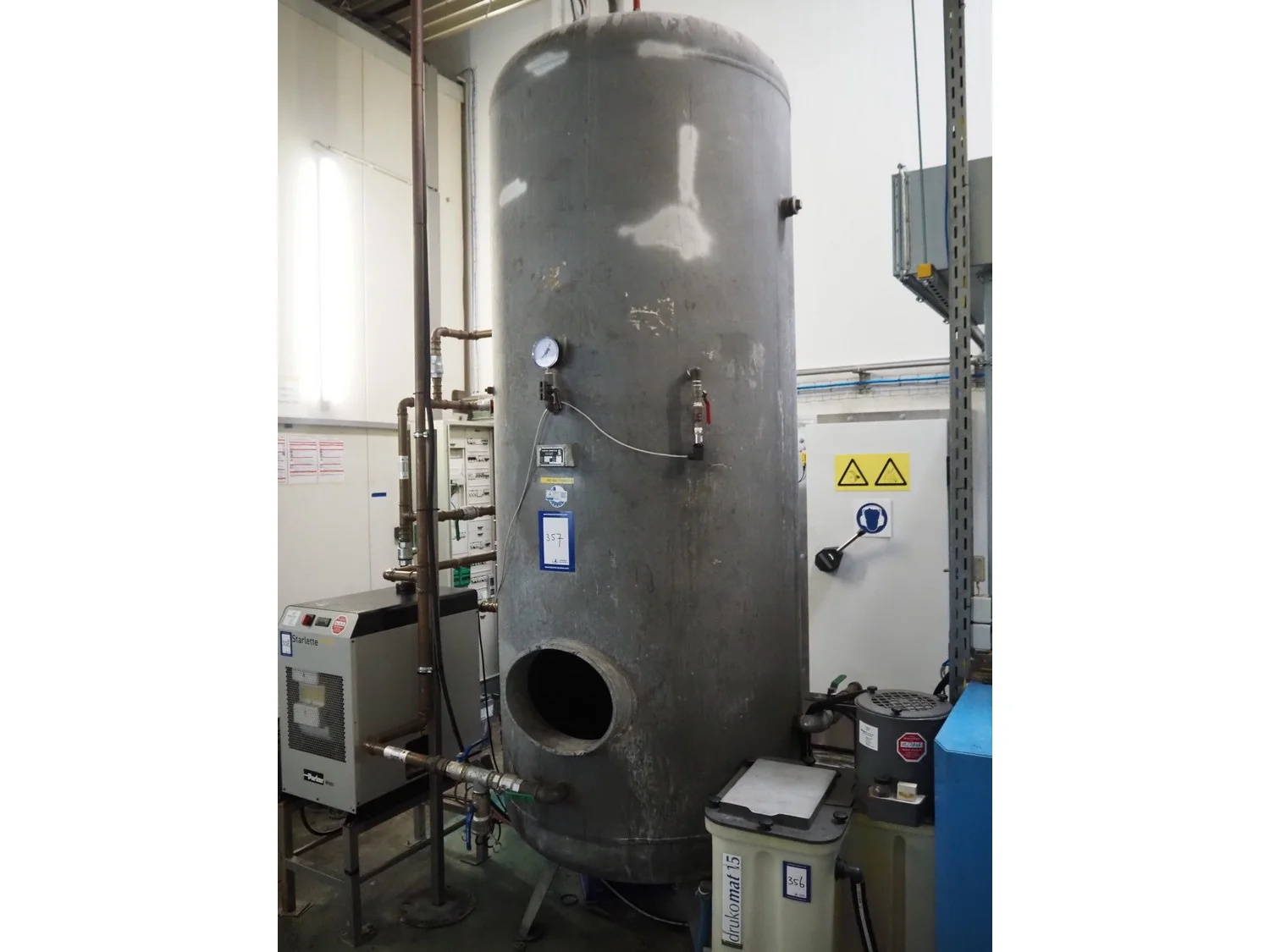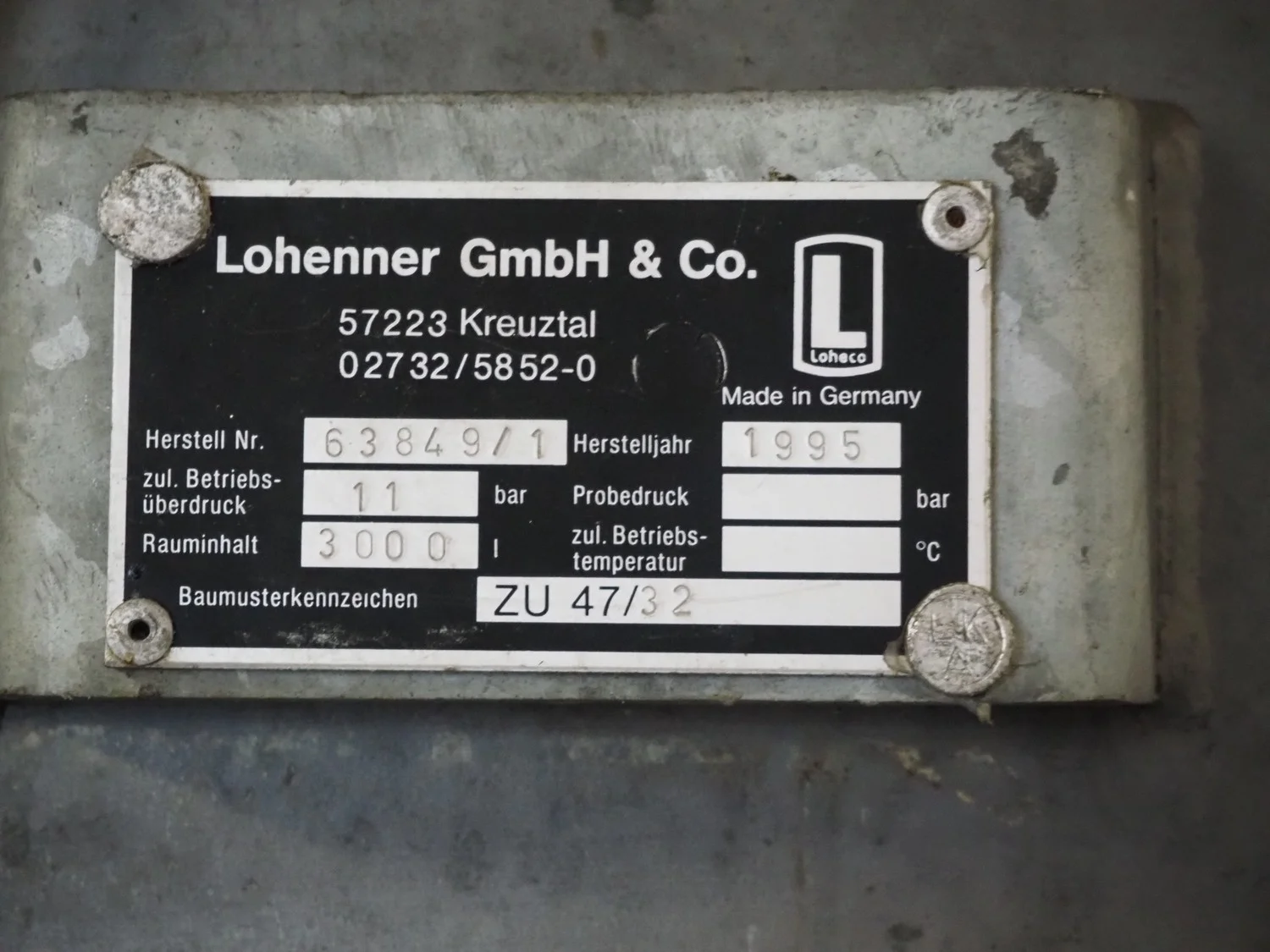 Lohenner GmbH & Co. pressure vessel, production number: 63849/1, year of construction: 1995, maximum working pressure: 11 bar, volume: 3000 liter, diameter: 1200 mm, height: 3400 mm.