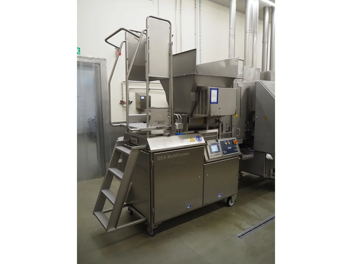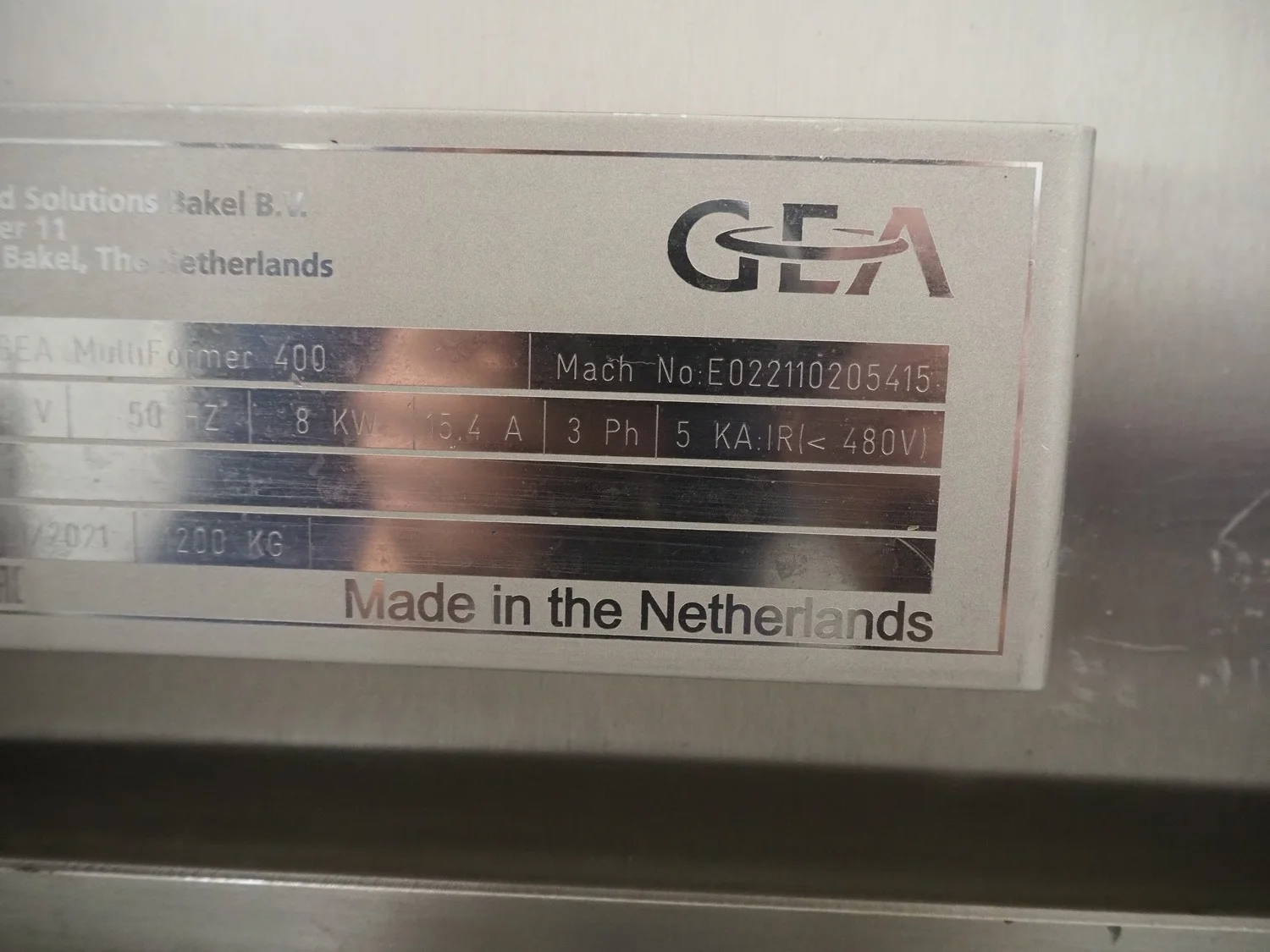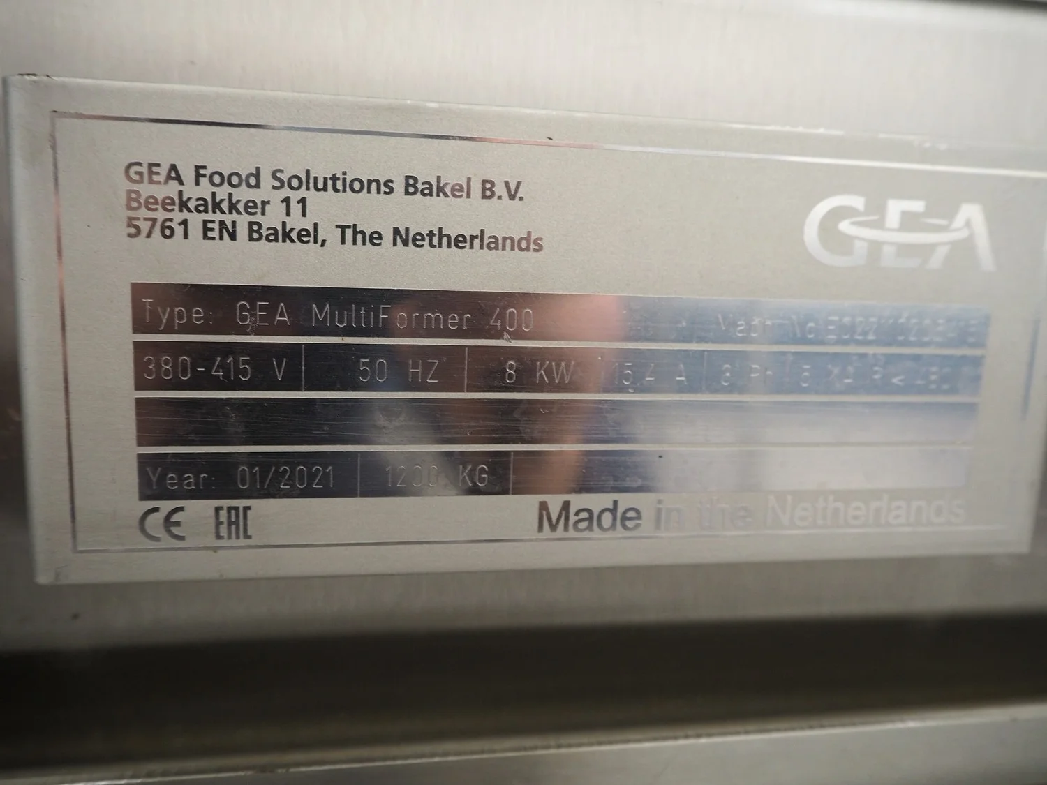GEA Food Solutions Bakel B.V. forming machine, type: GEA MultiFormer 400, machine number: E022110205415, year of construction: 2021, 380-415 V, 3 Ph, 50 Hz, 15.4 A, 8 kW, s/s mesh belt, belt width: 400 mm, dimensions forming machine: 3100 mm x 1000 mm x 2700 mm, including 2 pallets with forming plates, s/s rack with 2 additional outfeed belts, belt widths: 400 mm, dimensions rack: 1350 mm x 600 mm x 2100 mm, GEA tool trolley, dimensions: 1200 mm x 700 mm x 950 mm.