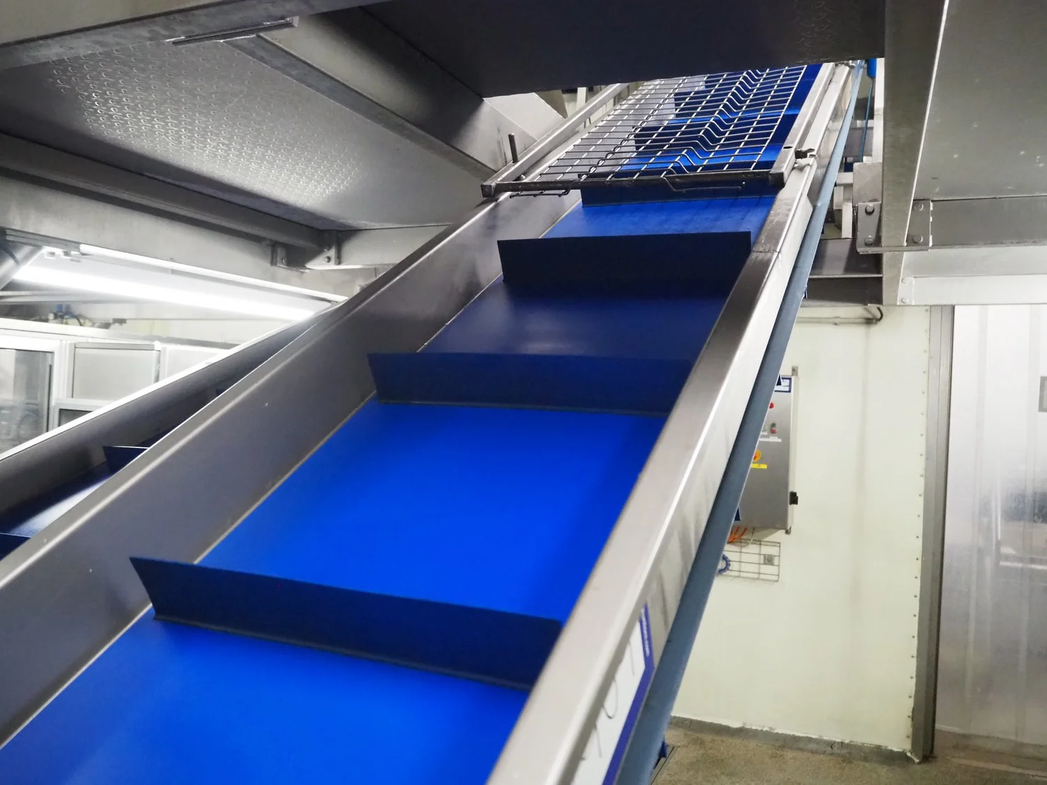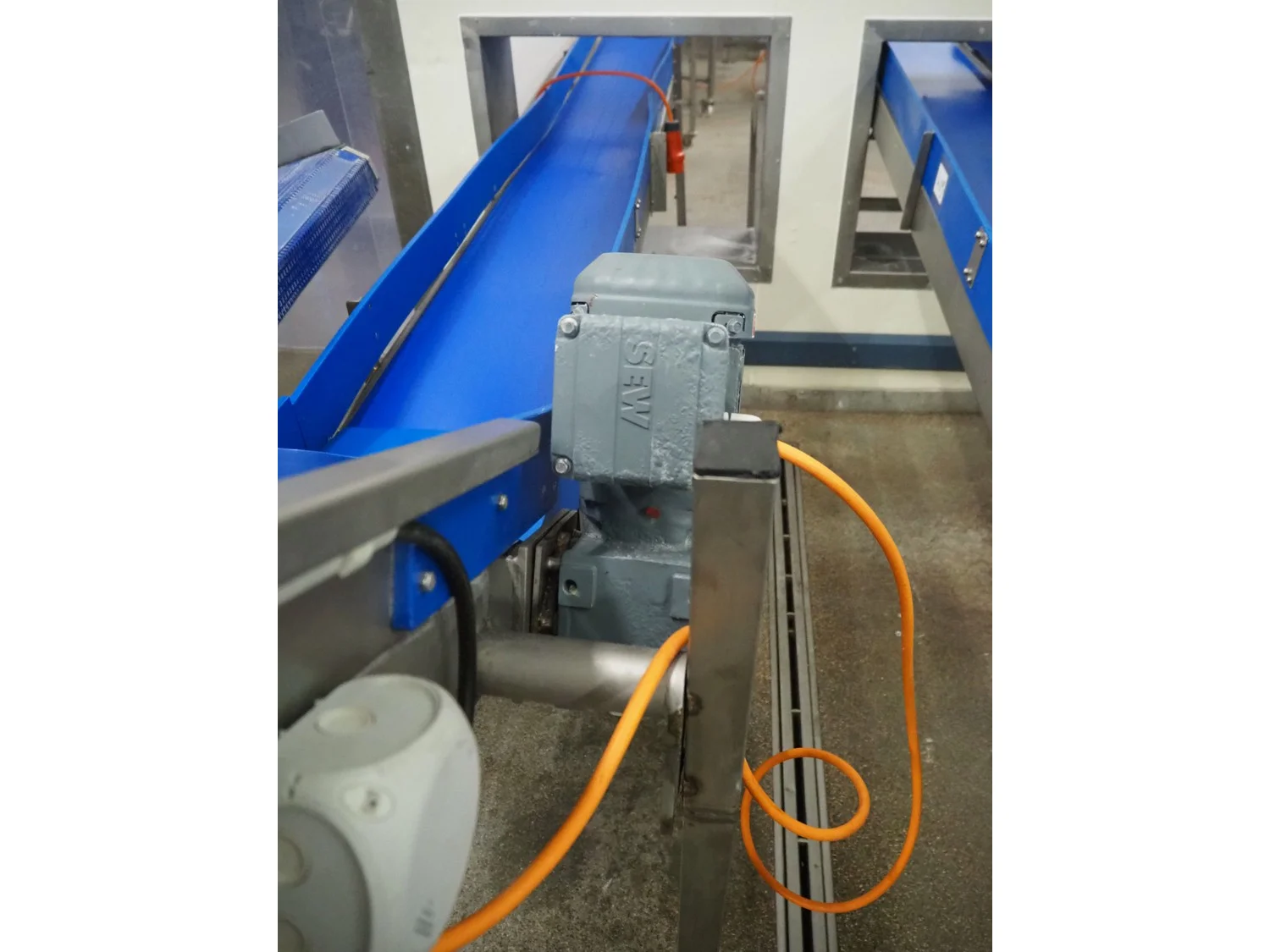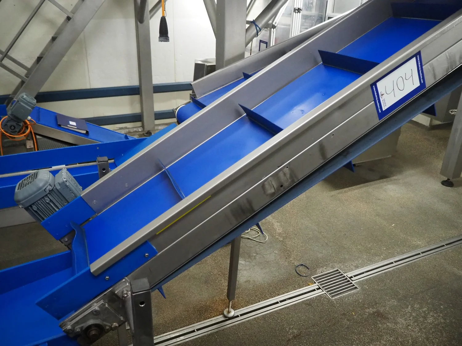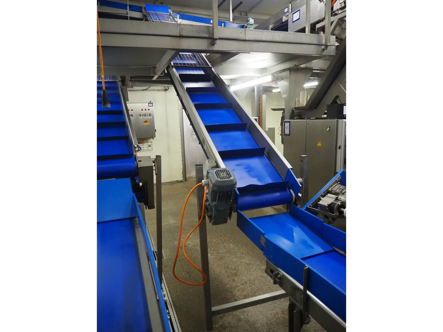 Elevating belt, s/s frame, plastic belt with dividers, belt width: 380 mm, dividers height: 60 mm, distance between dividers: 350 mm, elevating height: 3400 mm, total dimensions: 4500 mm x 800 mm x 3600 mm.