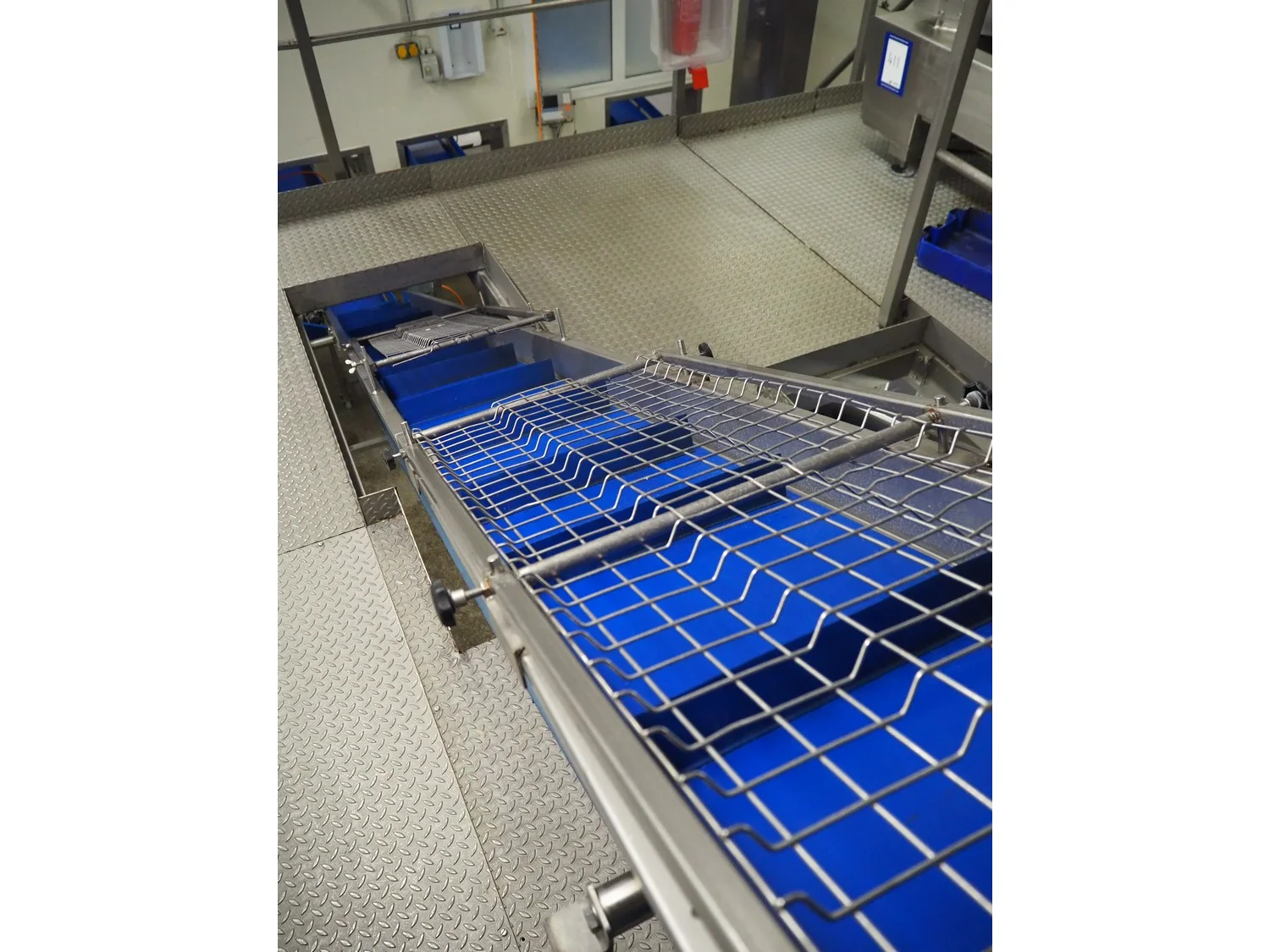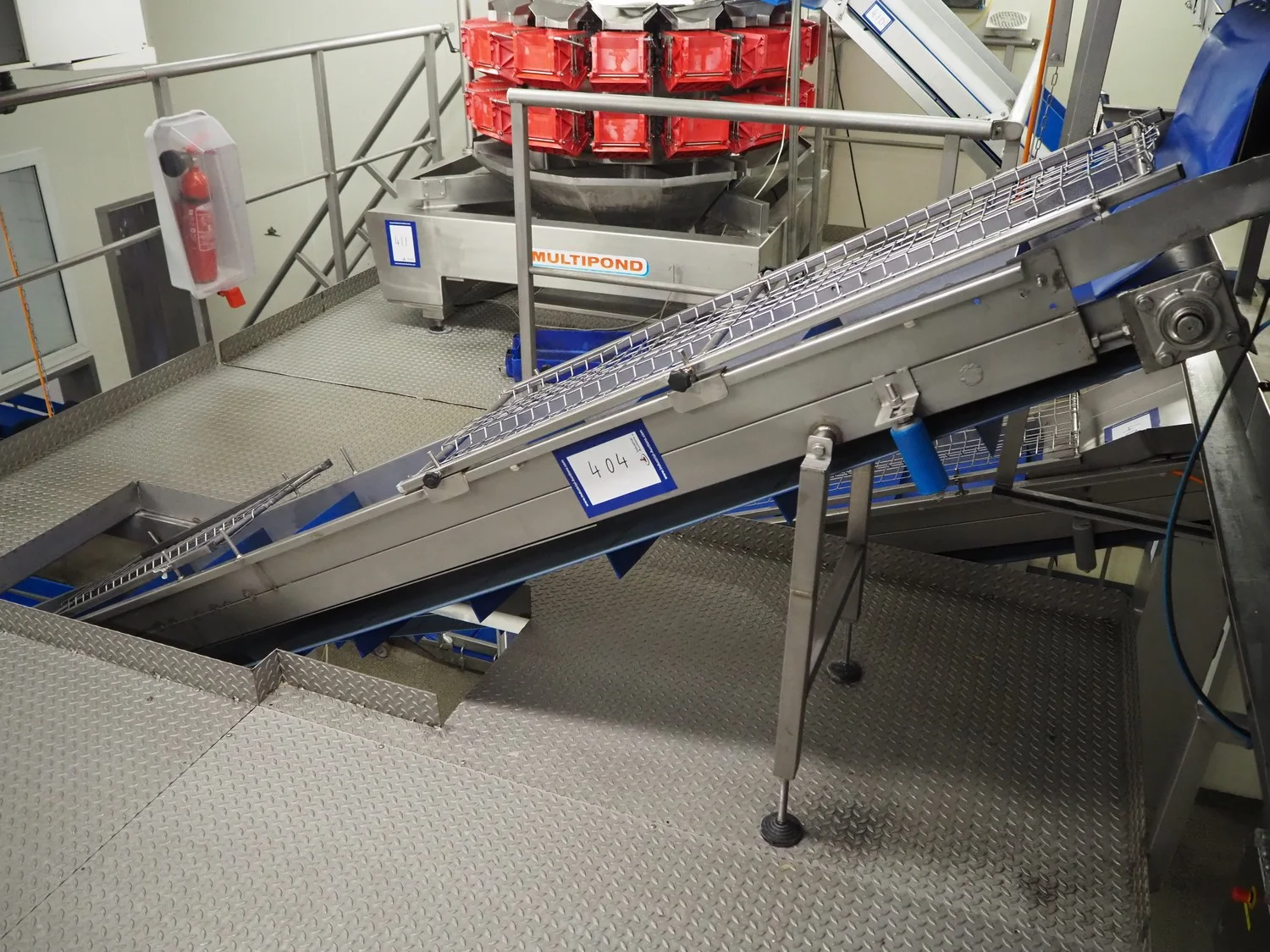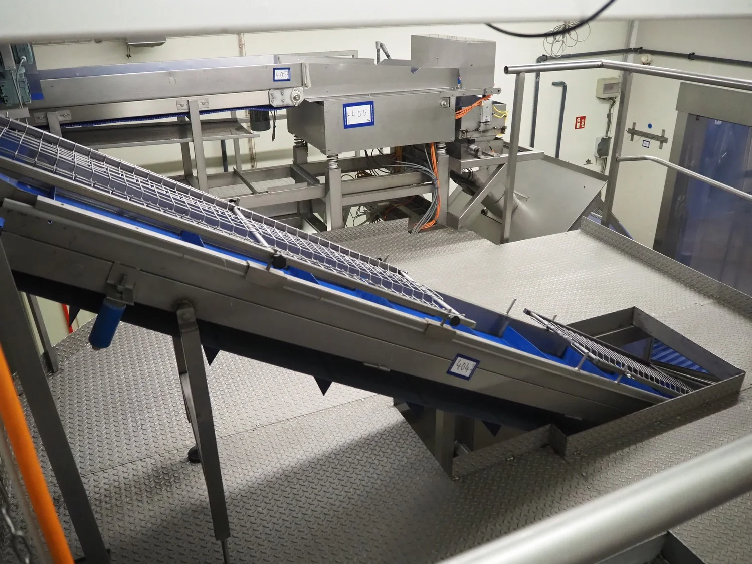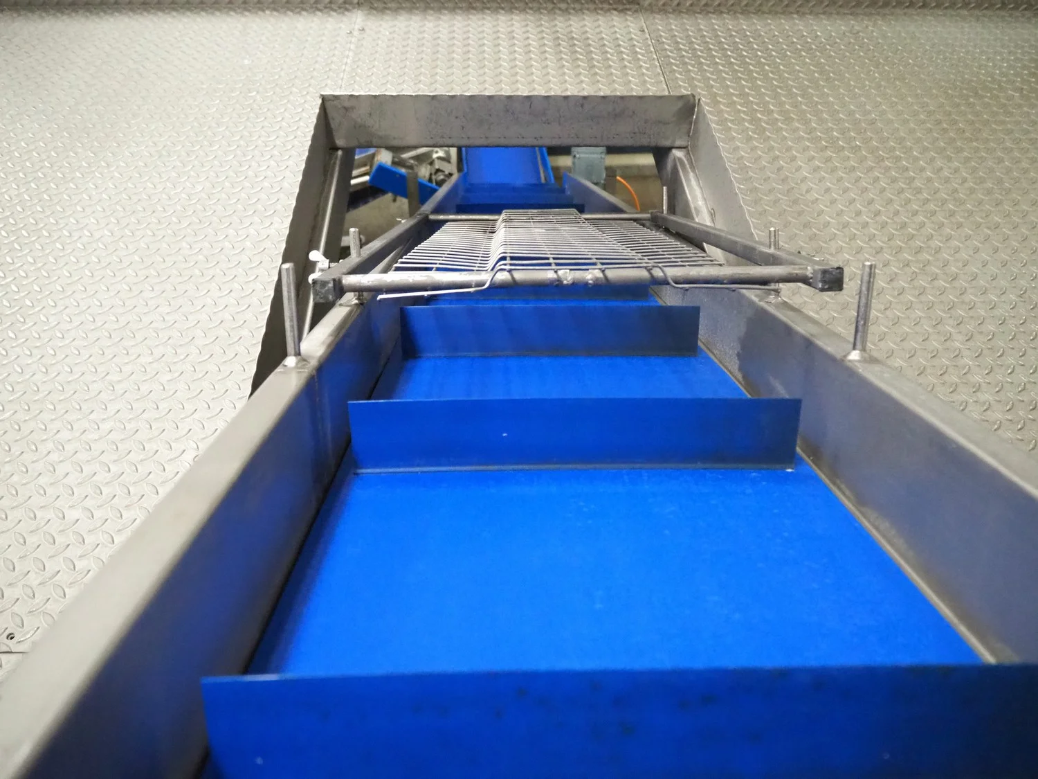 Elevating belt, s/s frame, plastic belt with dividers, belt width: 380 mm, dividers height: 60 mm, distance between dividers: 350 mm, elevating height: 3400 mm, total dimensions: 4500 mm x 800 mm x 3600 mm.