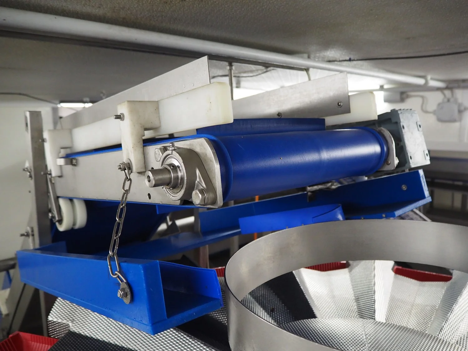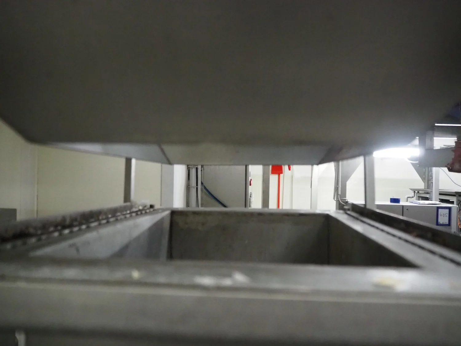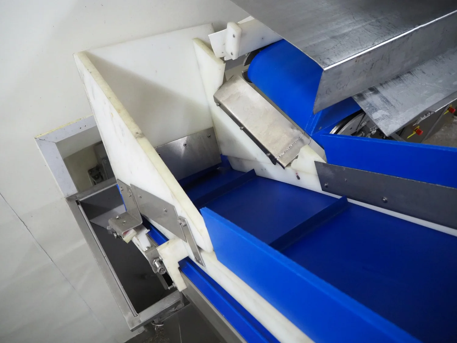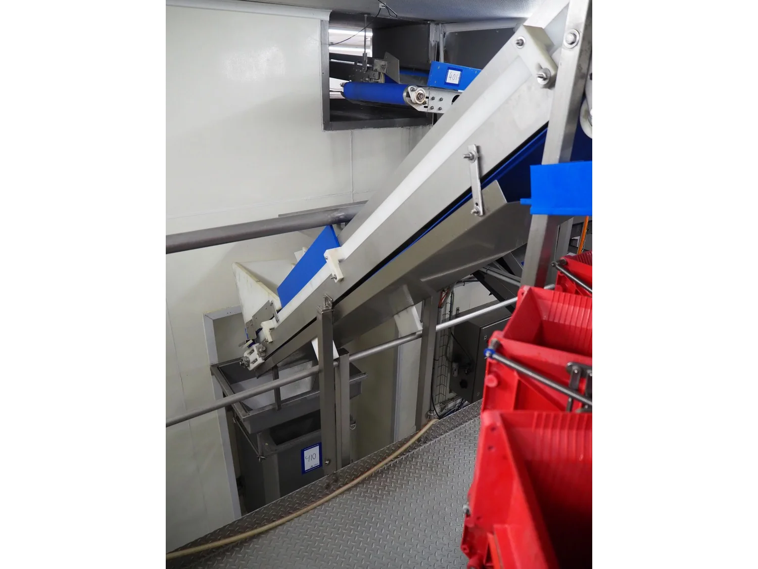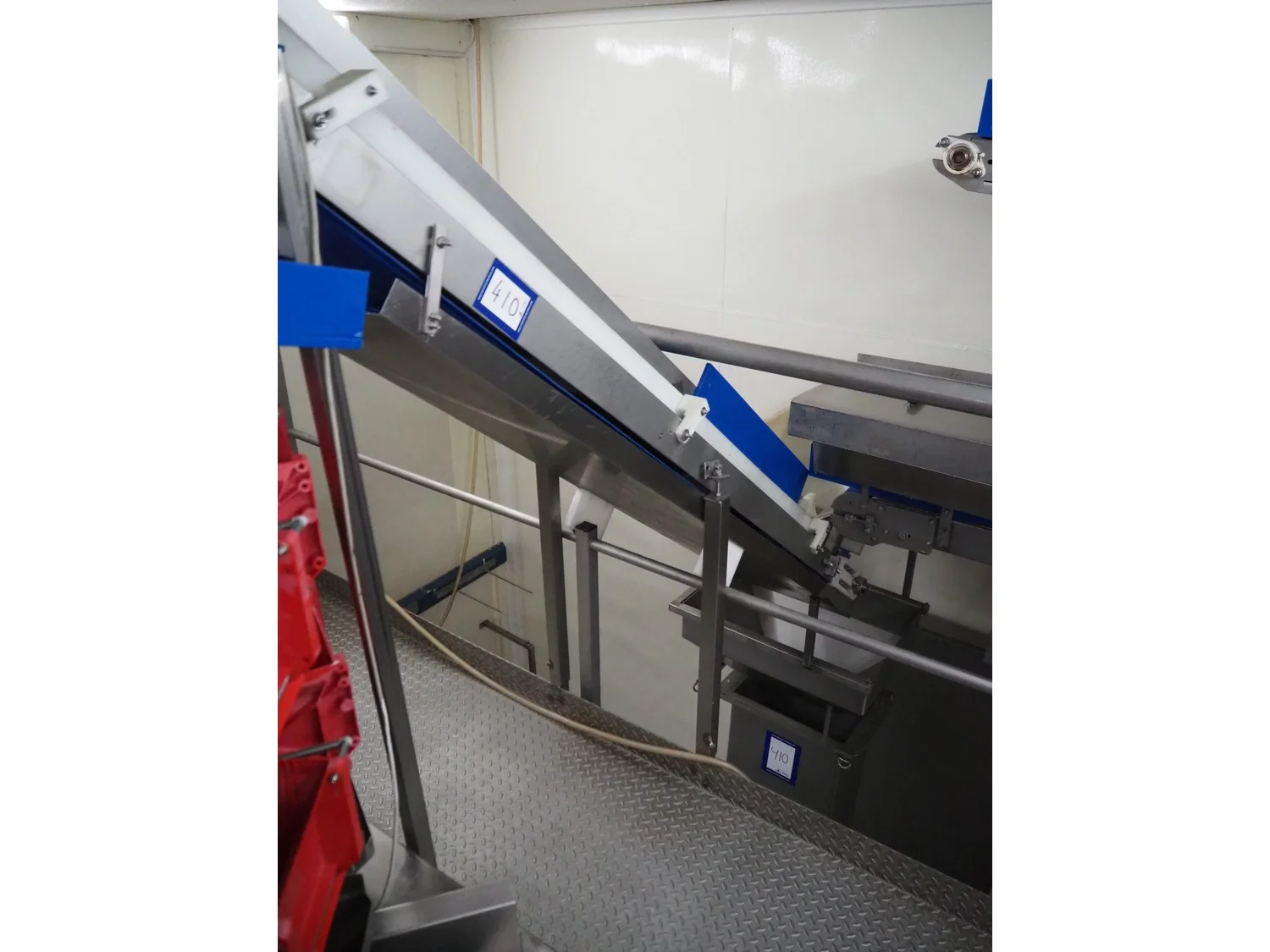 Elevating belt, s/s frame, plastic belt with dividers, belt width: 310 mm, dividers height: 30 mm, distance between dividers: 370 mm, total dimensions: 2750 mm x 650 mm x 1900 mm. Including funnel, dimensions: 800 mm x 600 mm x 2130 mm.