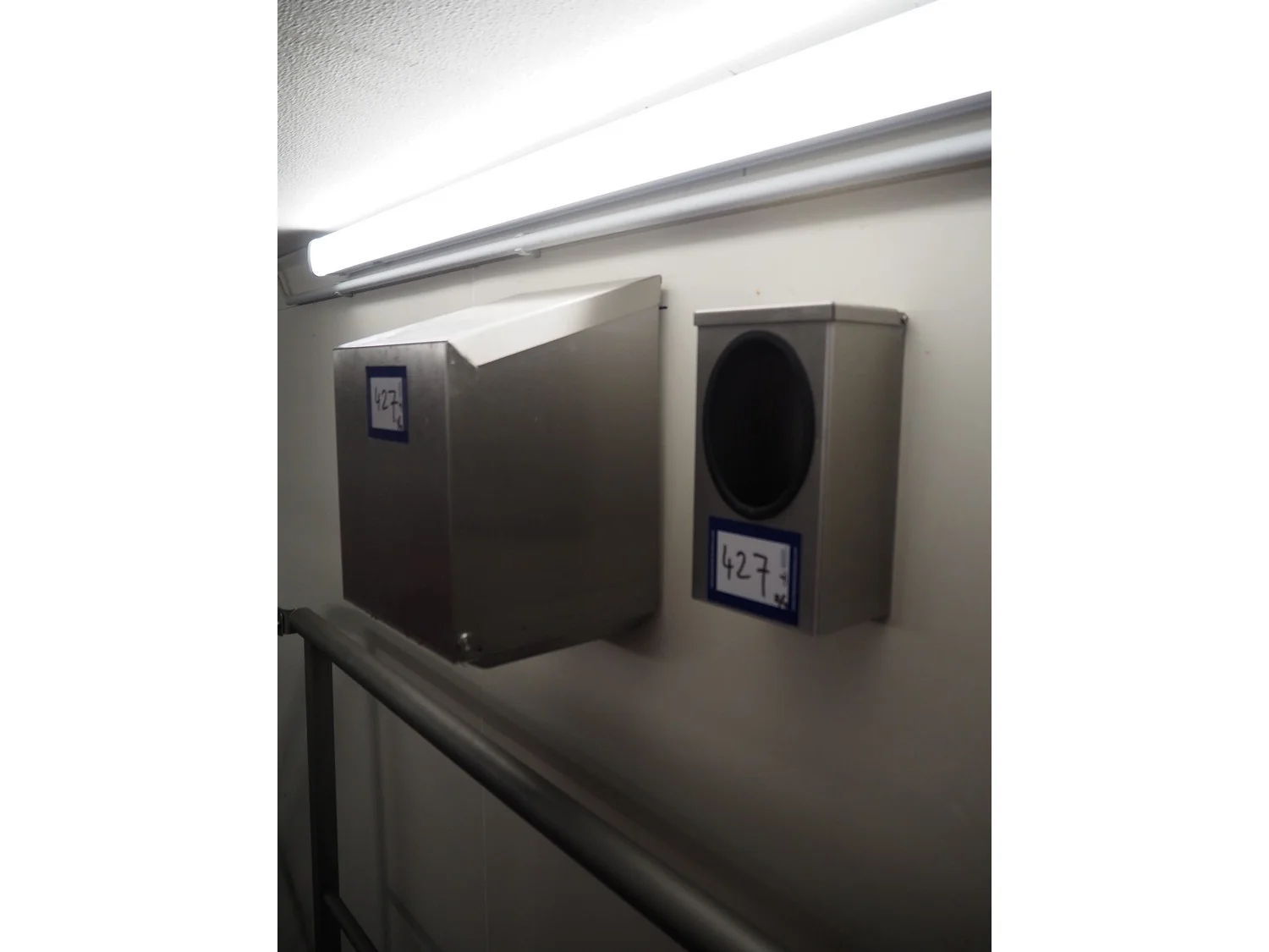 S/s paper dispenser, dimensions: 470 mm x 290 mm x 420 mm and 140 mm x 100 mm x 250 mm.