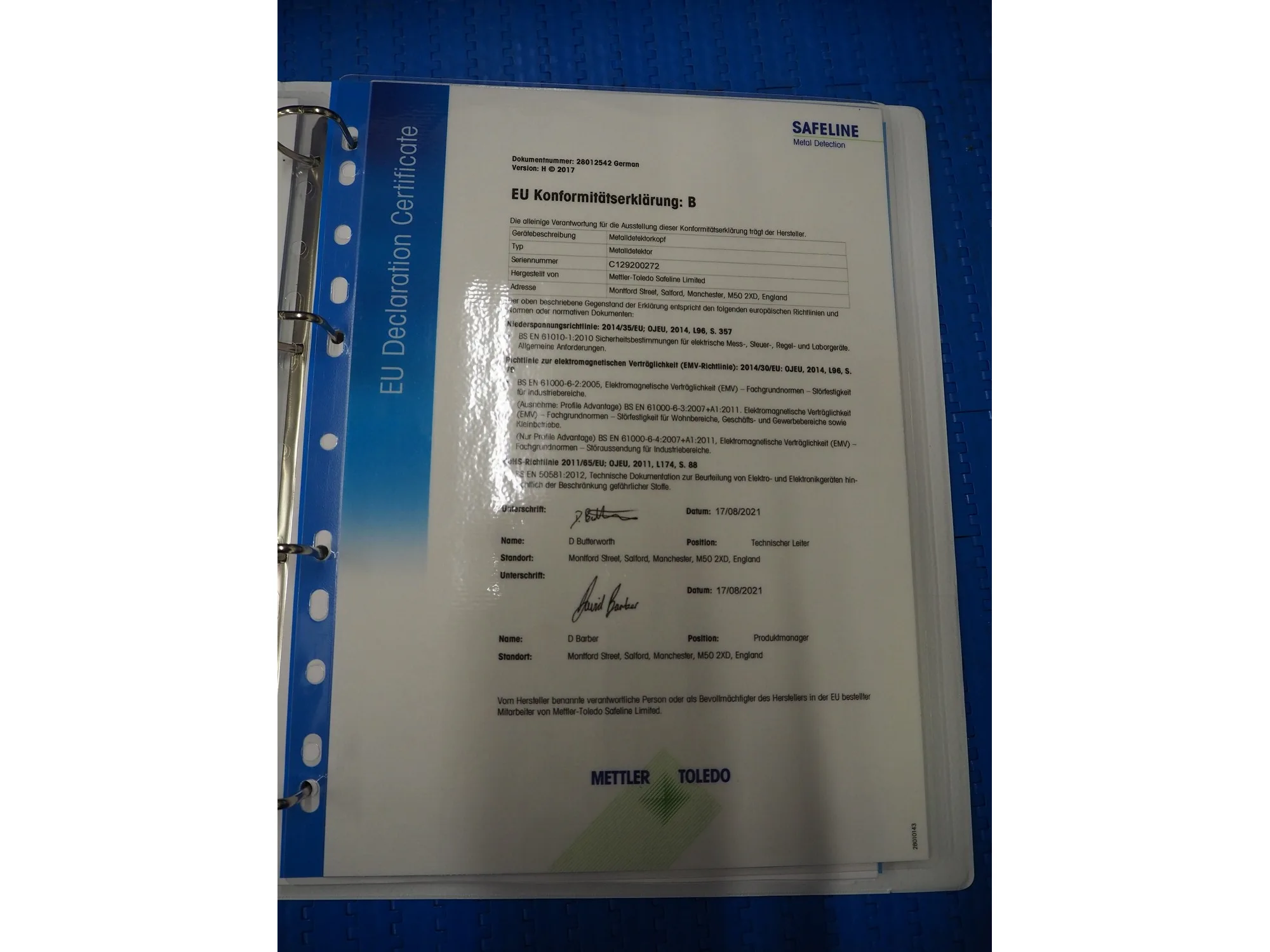 Mettler Toledo GmbH mobile metal detector, type: Metalldetektor, serial number: C129200272, year of construction: 09-2021, plastic belt, belt width: 500 mm, clearance: 550 mm x 170 mm, total dimensions: 1600 mm x 1200 mm x 1430 mm.