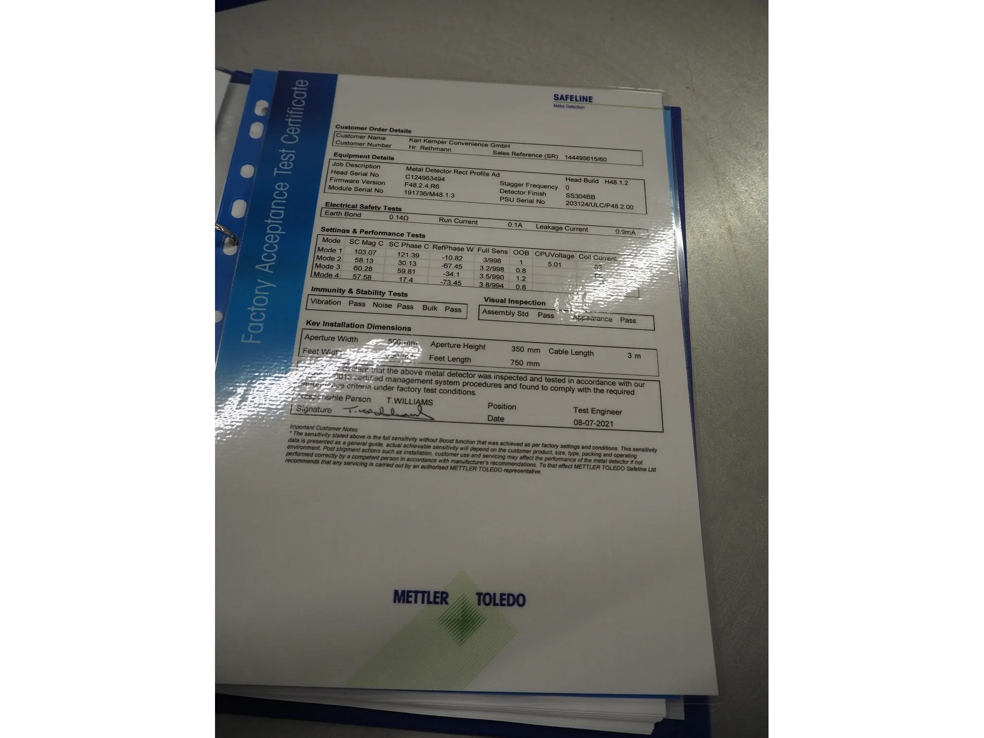 Mettler Toledo GmbH mobile metal detector, type: Metalldetektor, serial number: C124963494, year of construction: 08-2021, plastic belt, belt width: 490 mm, clearance: 550 mm x 310 mm, total dimensions: 1750 mm x 1150 mm x 1500 mm.