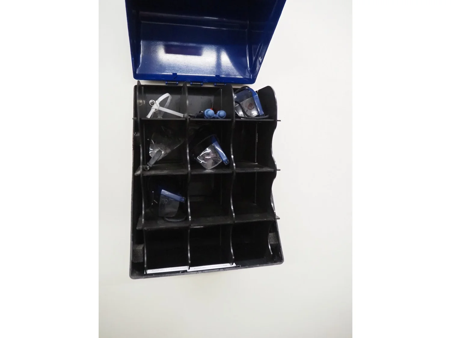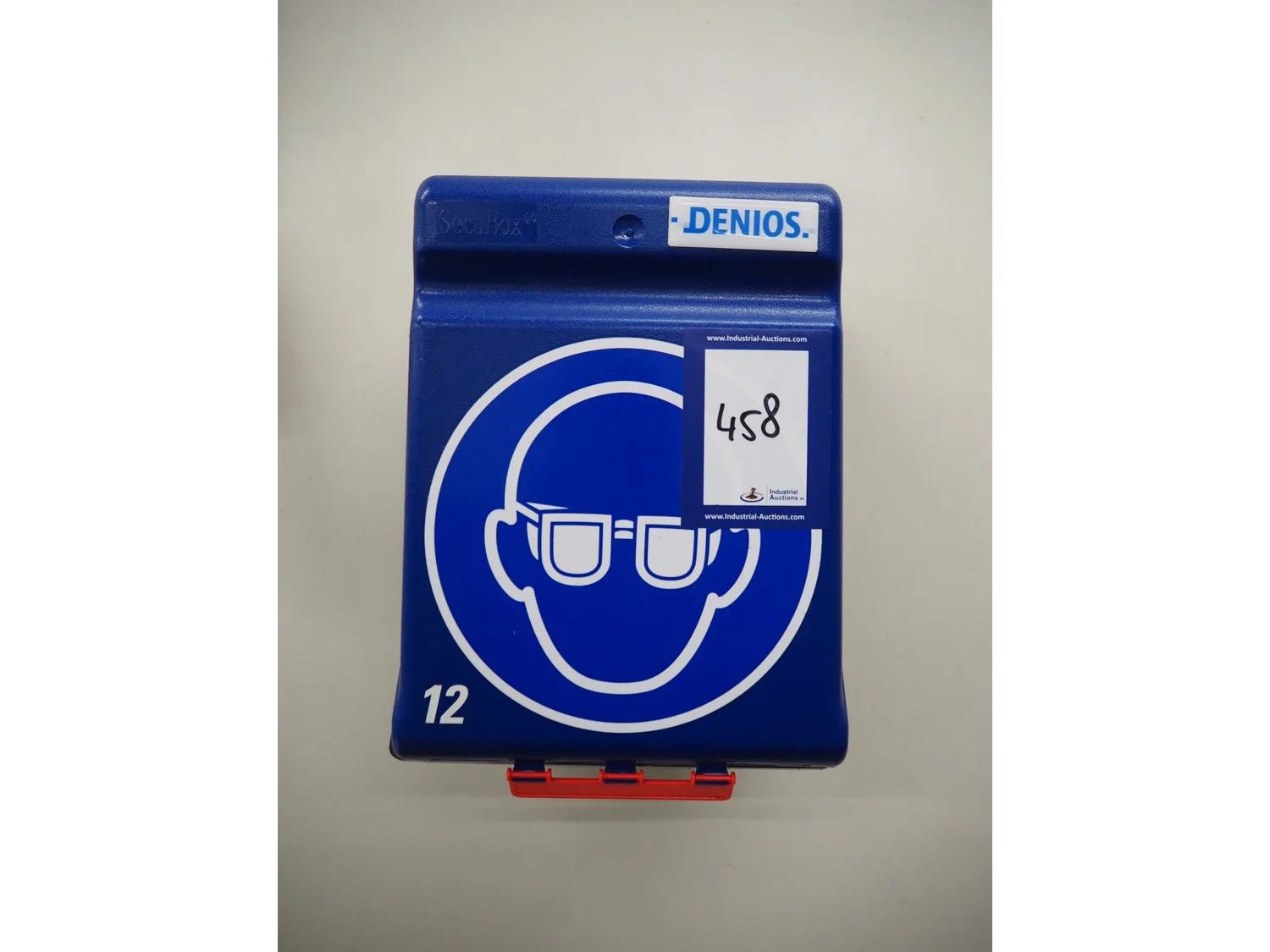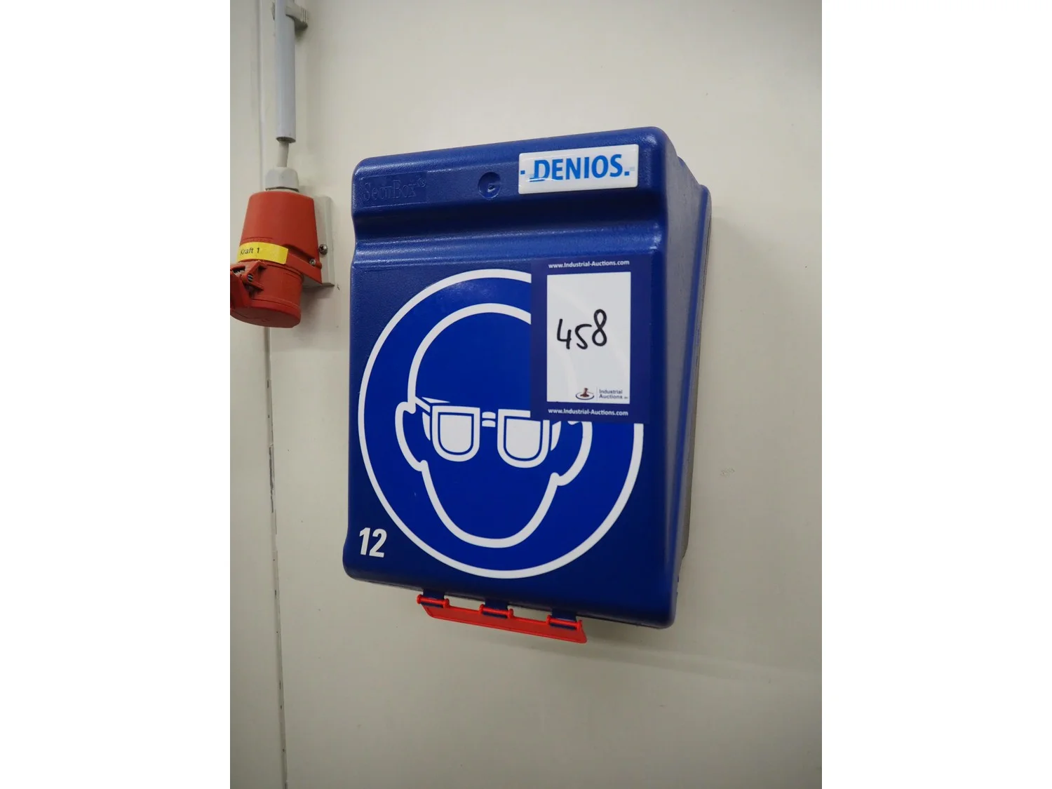 Denios plastic eye protection cabinet with 12 places, dimensions: 240 mm x 200 mm x 300 mm. Including 5 safety glasses.
