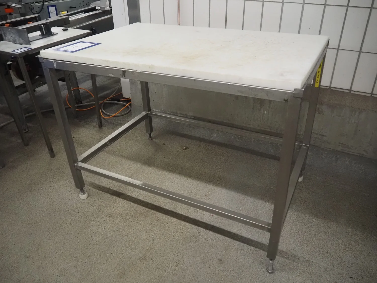 S/s table with plastic worktop, dimensions: 1200 mm x 800 mm x 910 mm.