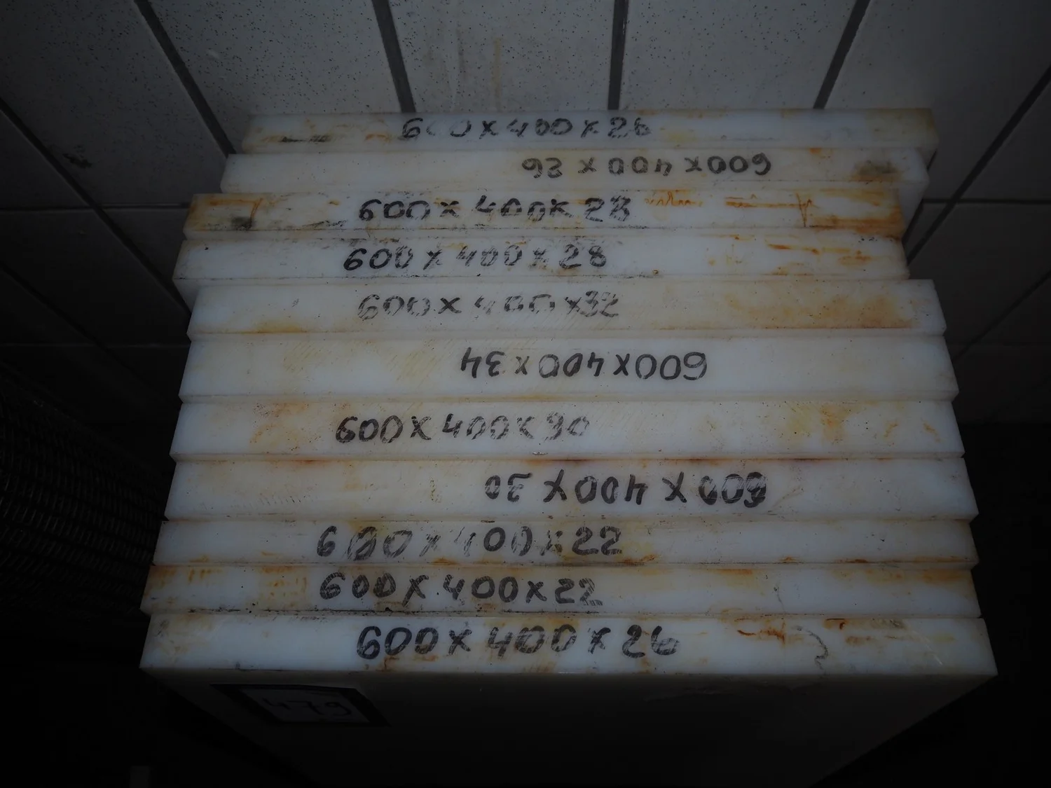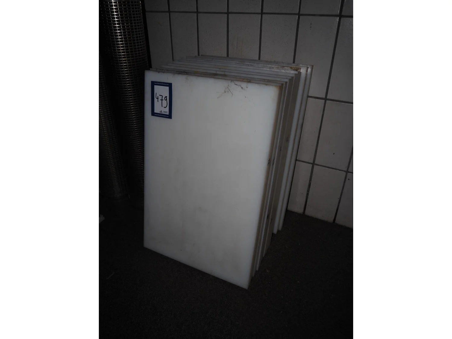 11 plastic worktops, dimensions: (2x) 600 mm x 400 mm x 22 mm, (2x) 600 mm x 400 mm x 26 mm, (2x) 600 mm x 400 mm x 28 mm, (2x) 600 mm x 400 mm x 30 mm, (1x) 600 mm x 400 mm x 320 mm, (1x) 600 mm x 400 mm x 34 mm, (1x) 600 mm x 400 mm x 36 mm.