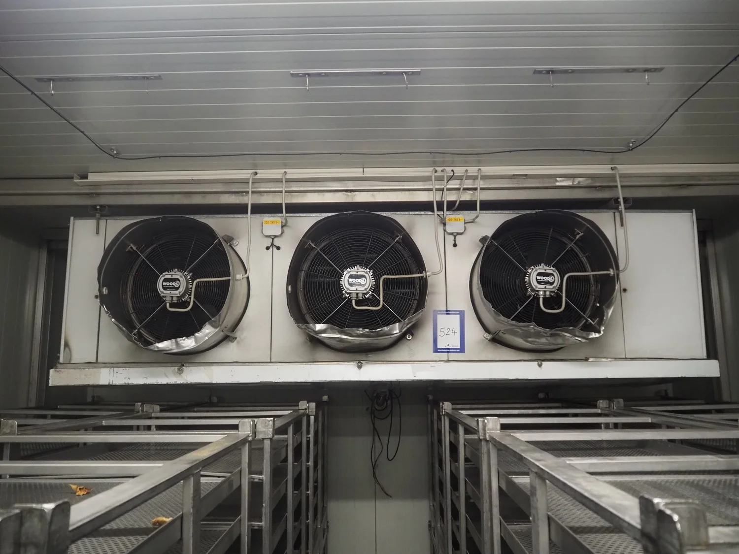 Goedhart evaporator, type: ZFS 135012, number: 97-4589-010, year of construction: 1997, refrigerant: NH3, maximum temperature: 50°C, minimum temperature: -40°C, tube volume: 90 dm³, 3 fans, dimensions: 2950 mm x 1200 mm x 780 mm.