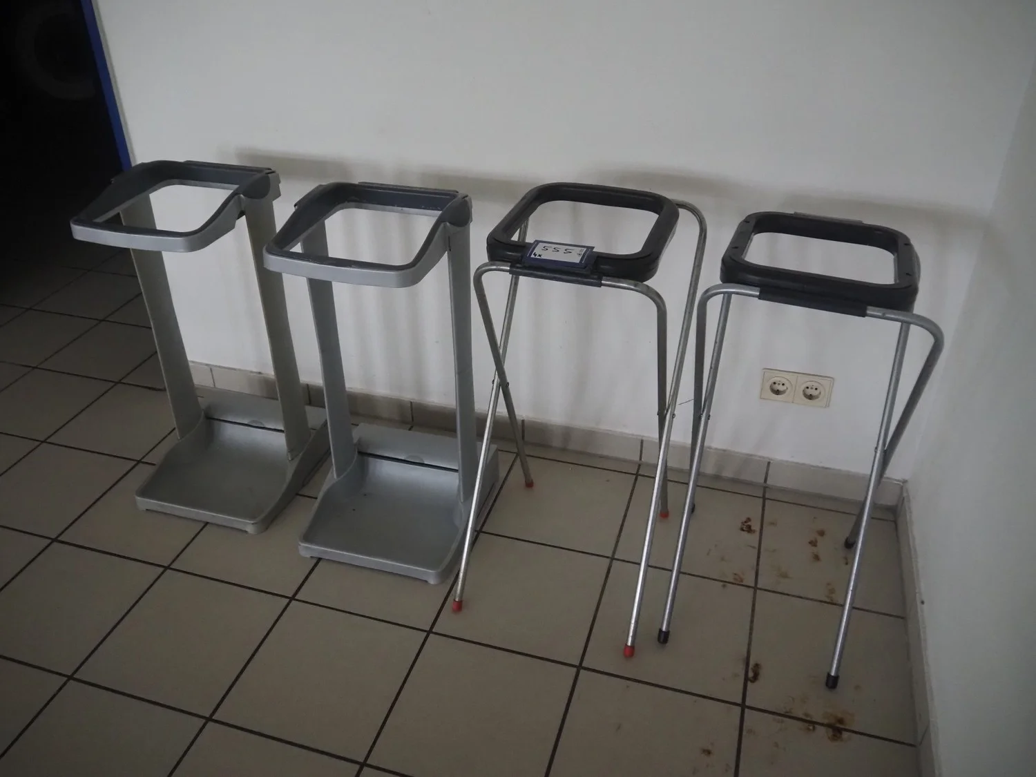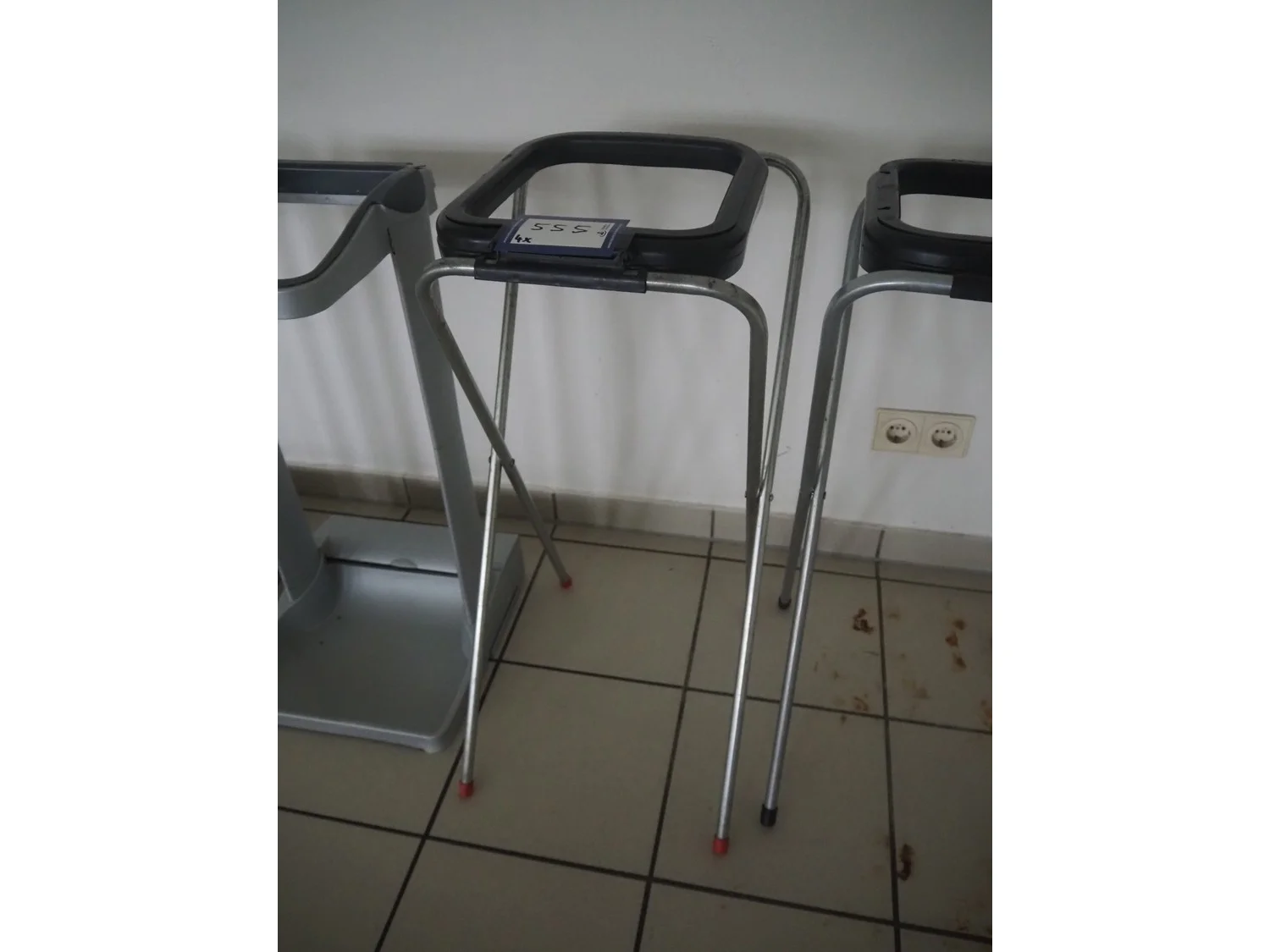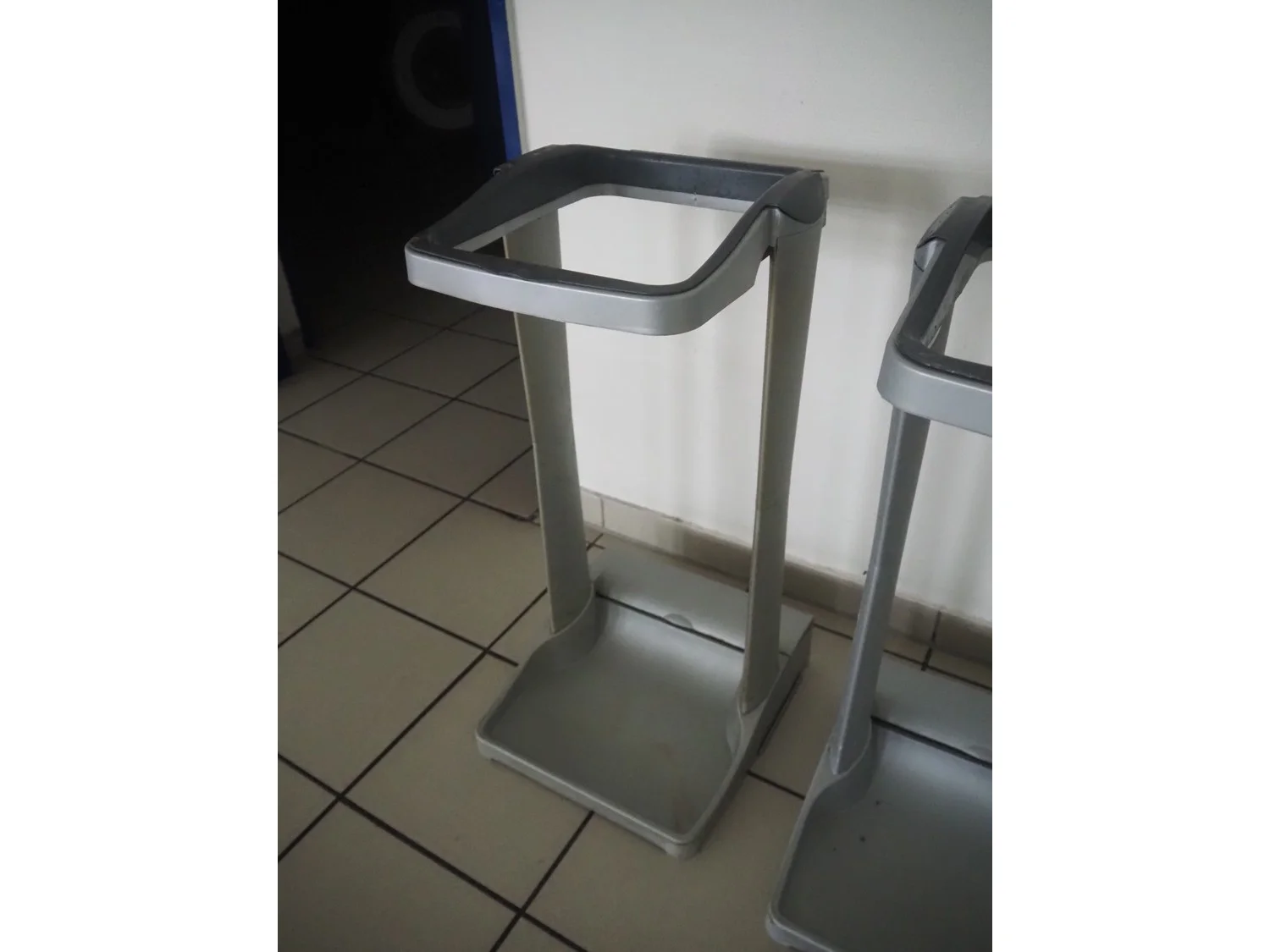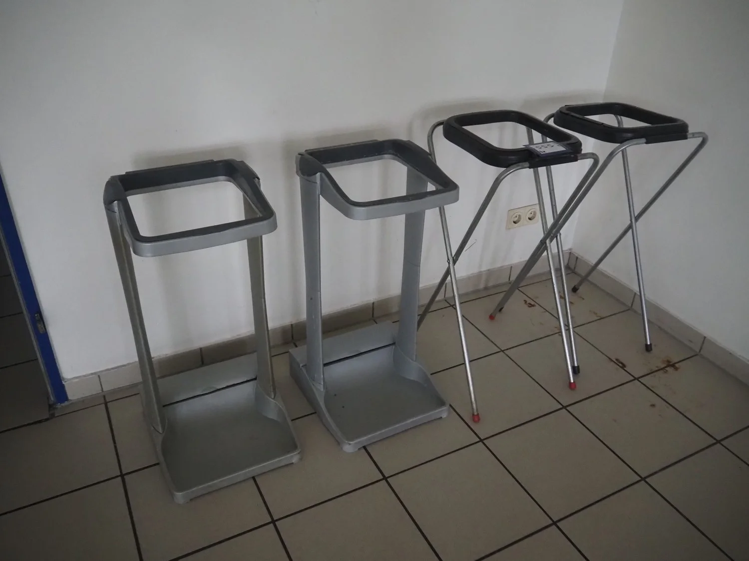 4 plastic waste bag holders, dimensions: (2x) 380 mm x 350 mm x 750 mm, (2x) 370 mm x 320 mm x 770 mm.