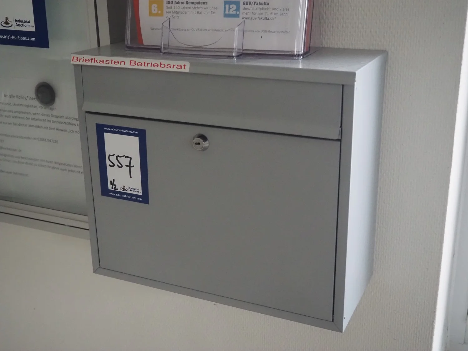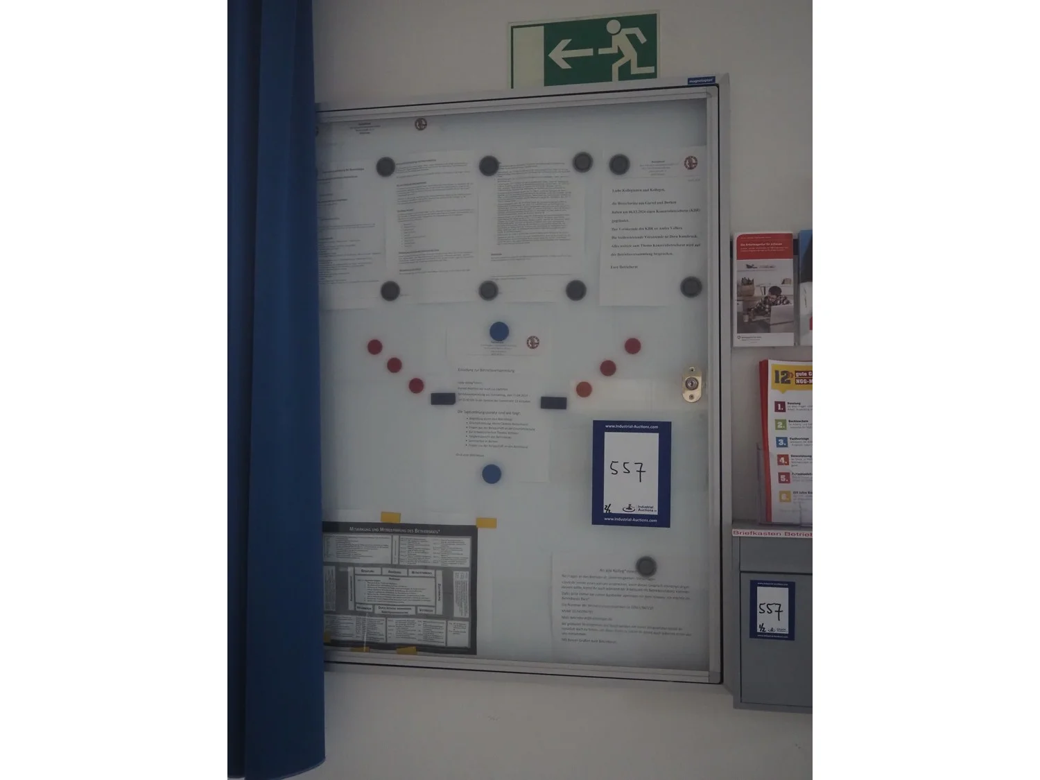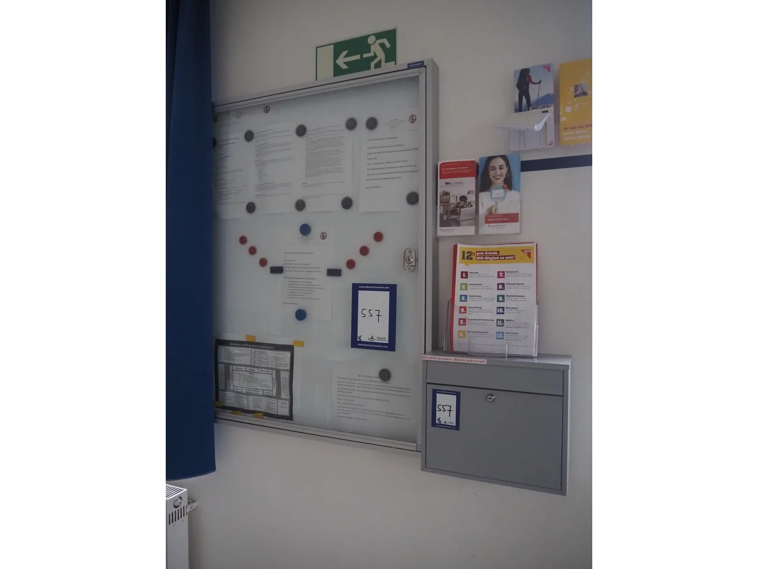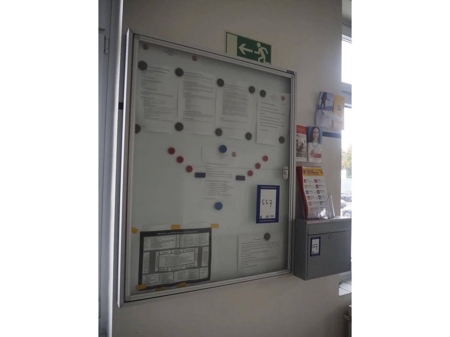 Magnetoplan announcement board with letterbox, dimensions announcement board: 900 mm x 70 mm x 1130 mm, dimensions letterbox: 360 mm x 150 mm x 310 mm.