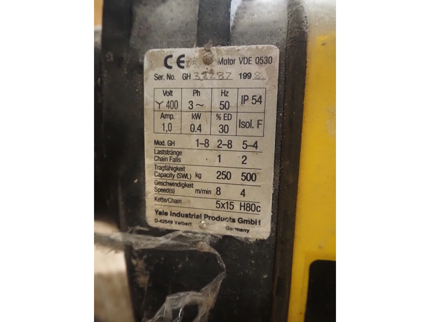 Yale chain hoist, model: GH, serial number: GH 32287, year of construction: 1998, chain falls: 1 / 2, capacity: 250 / 500 kg, dimensions: 480 mm x 170 mm x 250 mm.