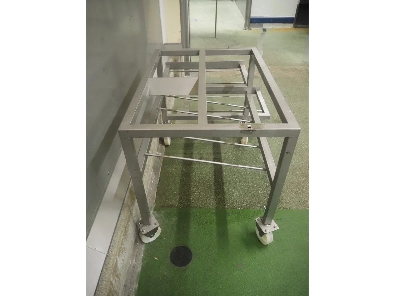 S/s mobile frame with holder for 2x E2-crates, dimensions: 1420 mm x 880 mm x 800 mm. Missing plastic worktop.