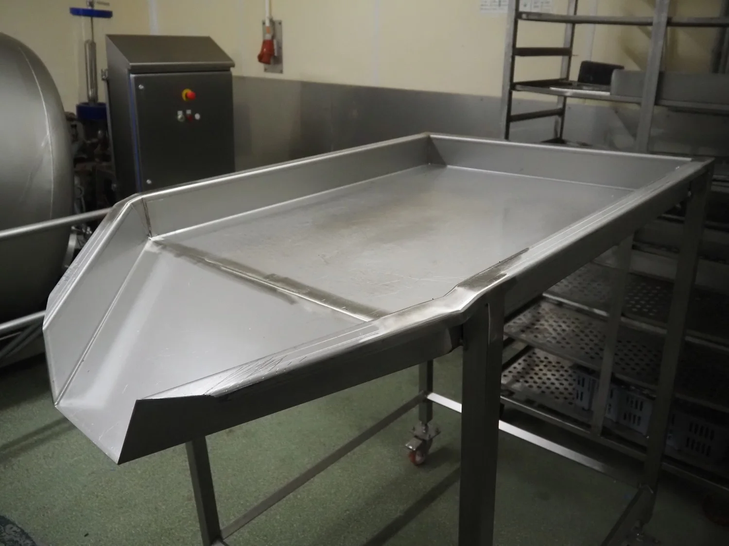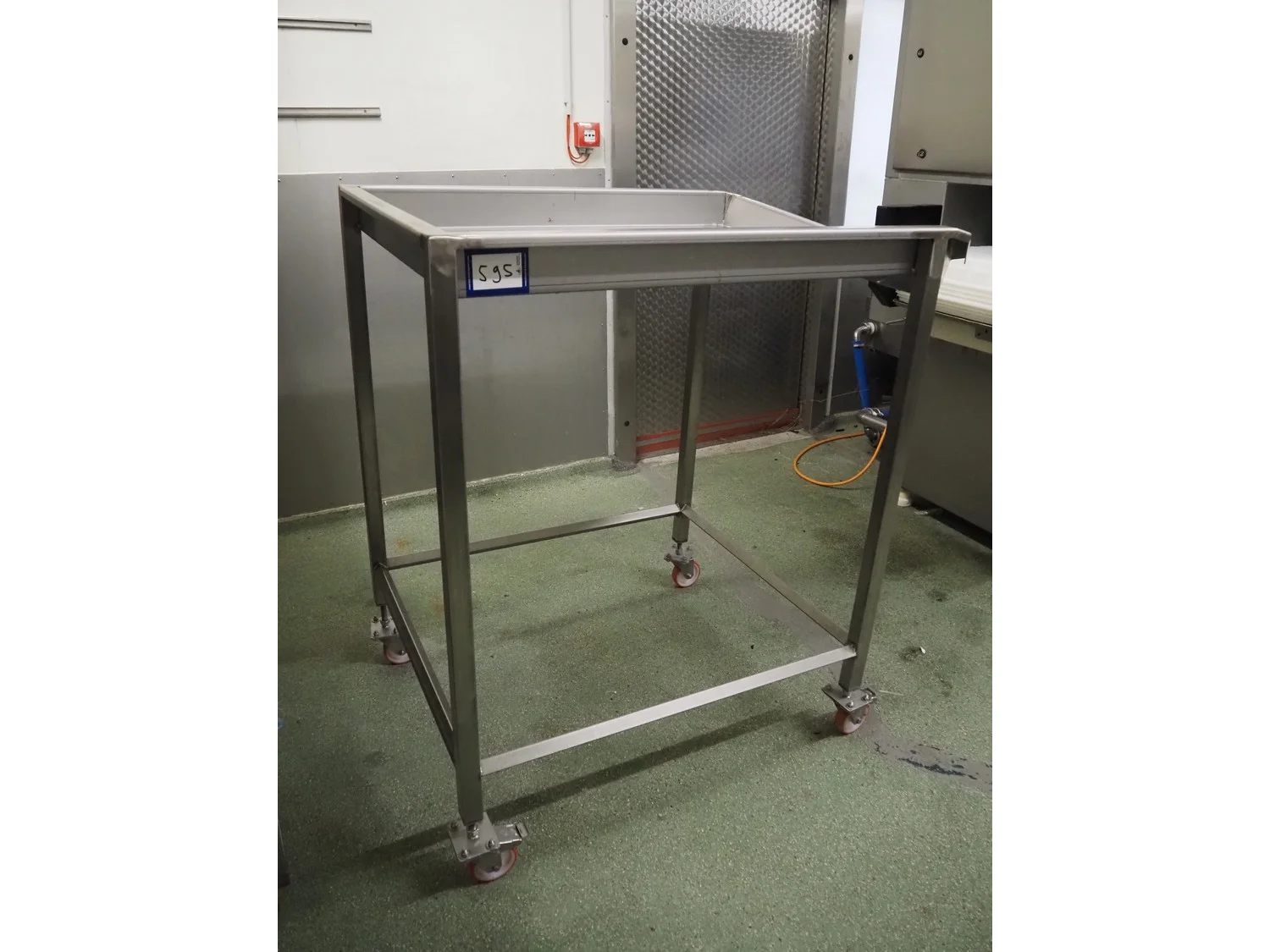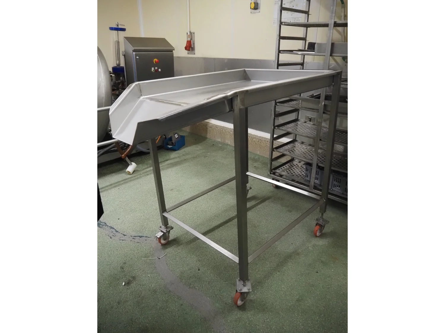 S/s mobile infeed slide, dimensions: 1350 mm x 880 mm x 1300 mm.