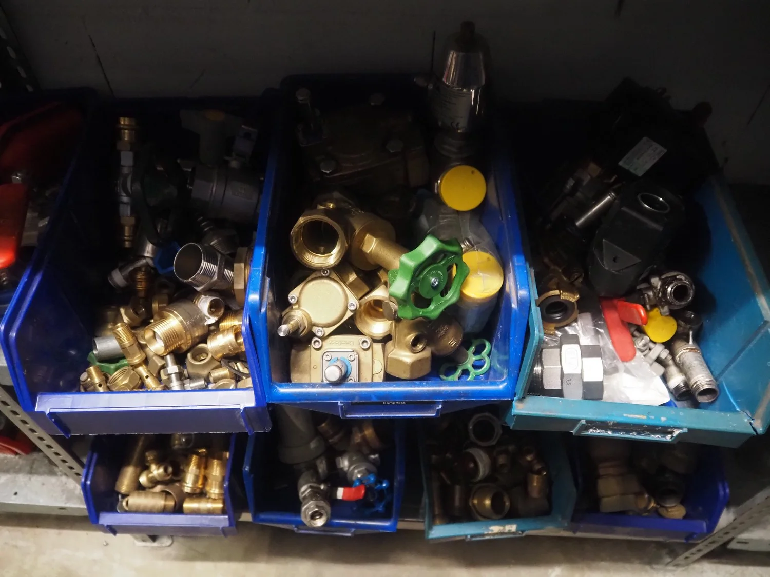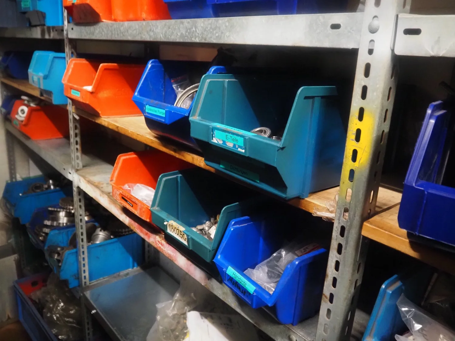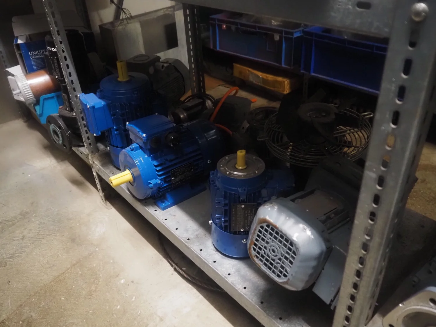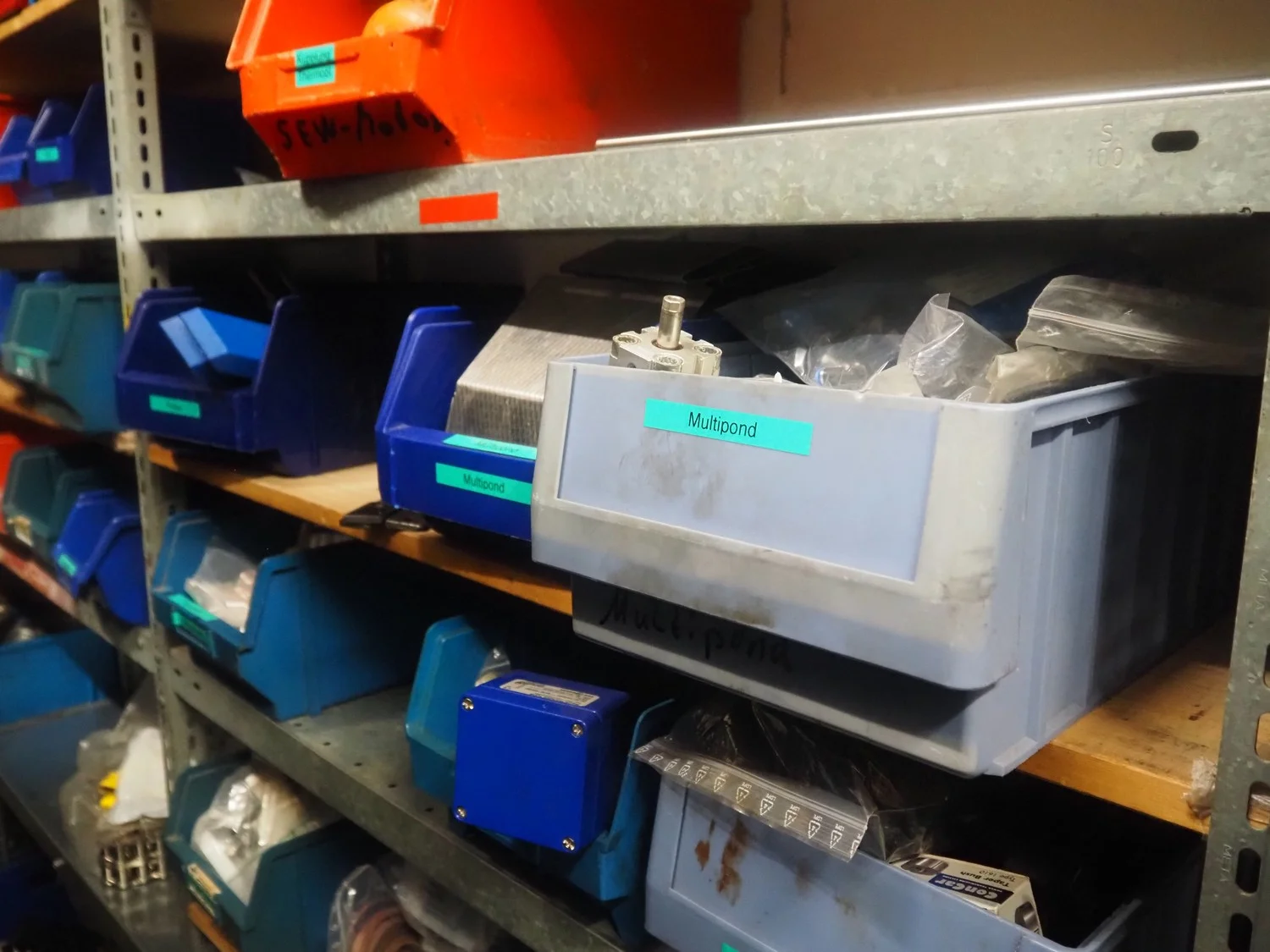 3 racks with large amount of parts, among others: s/s mesh belts, belt width: 620 mm / 600 mm / 500 mm / 400 mm / 320 mm, various electro motors, drum motors, plastic belts, belt width: 400 mm, wheels, gearings, dimensions racks: (2x) 4000 mm x 500 mm x 2000 mm and 4000 mm x 300 mm x 2000 mm.