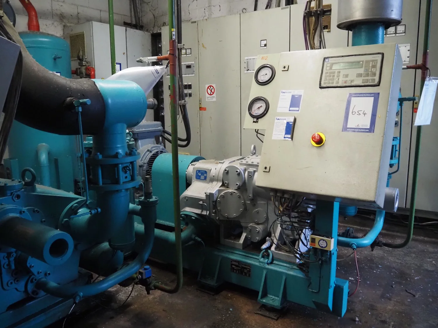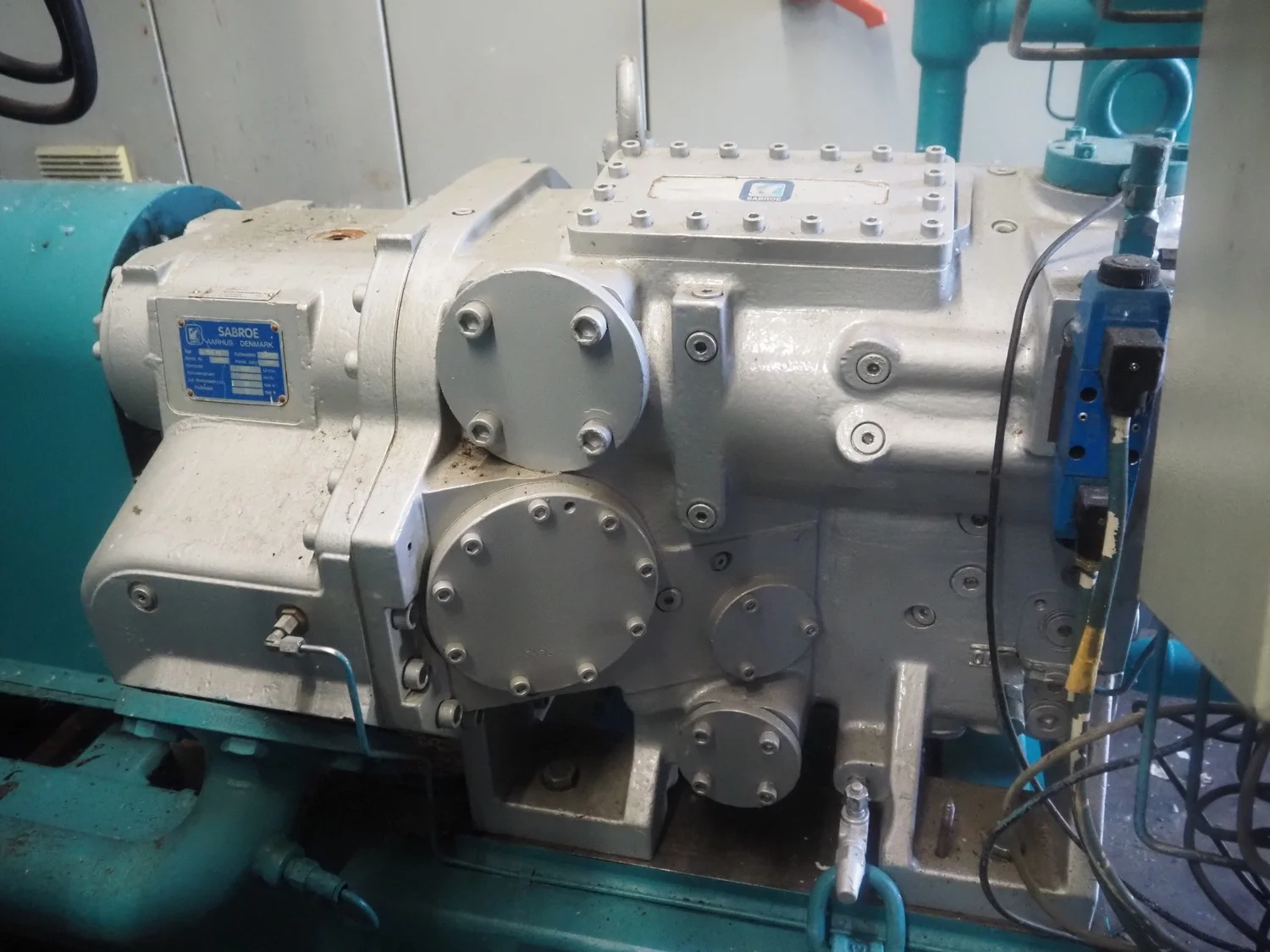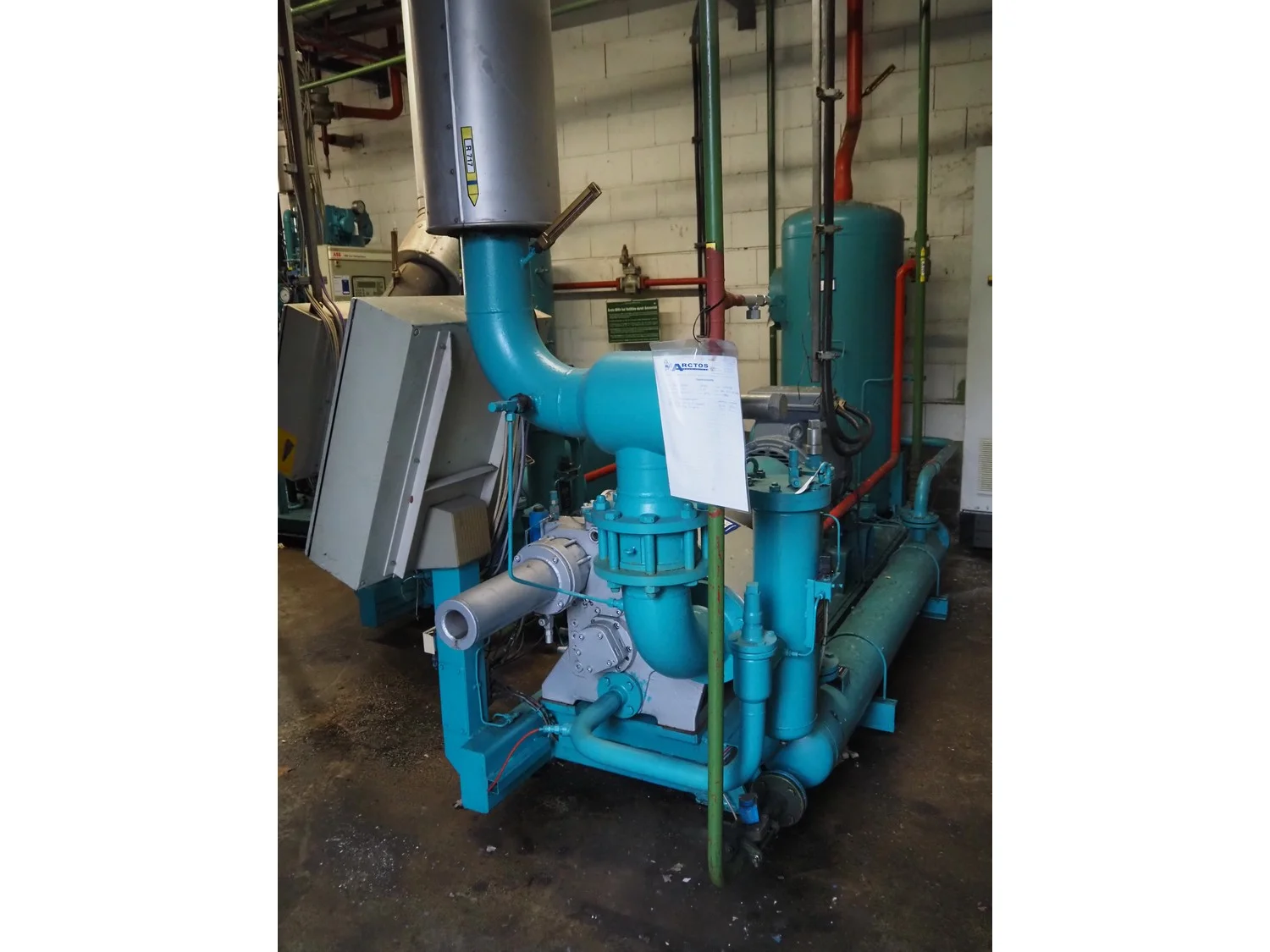 Sabroe screw cooling compressor, type: SAB 83, number: 129957, year of construction: 2004, volume: 1603 m³ per hour, refrigerant: R717 / NH3, nominal speed: 3600 U/min, dimensions: 3900 mm x 1250 mm x 2150 mm.