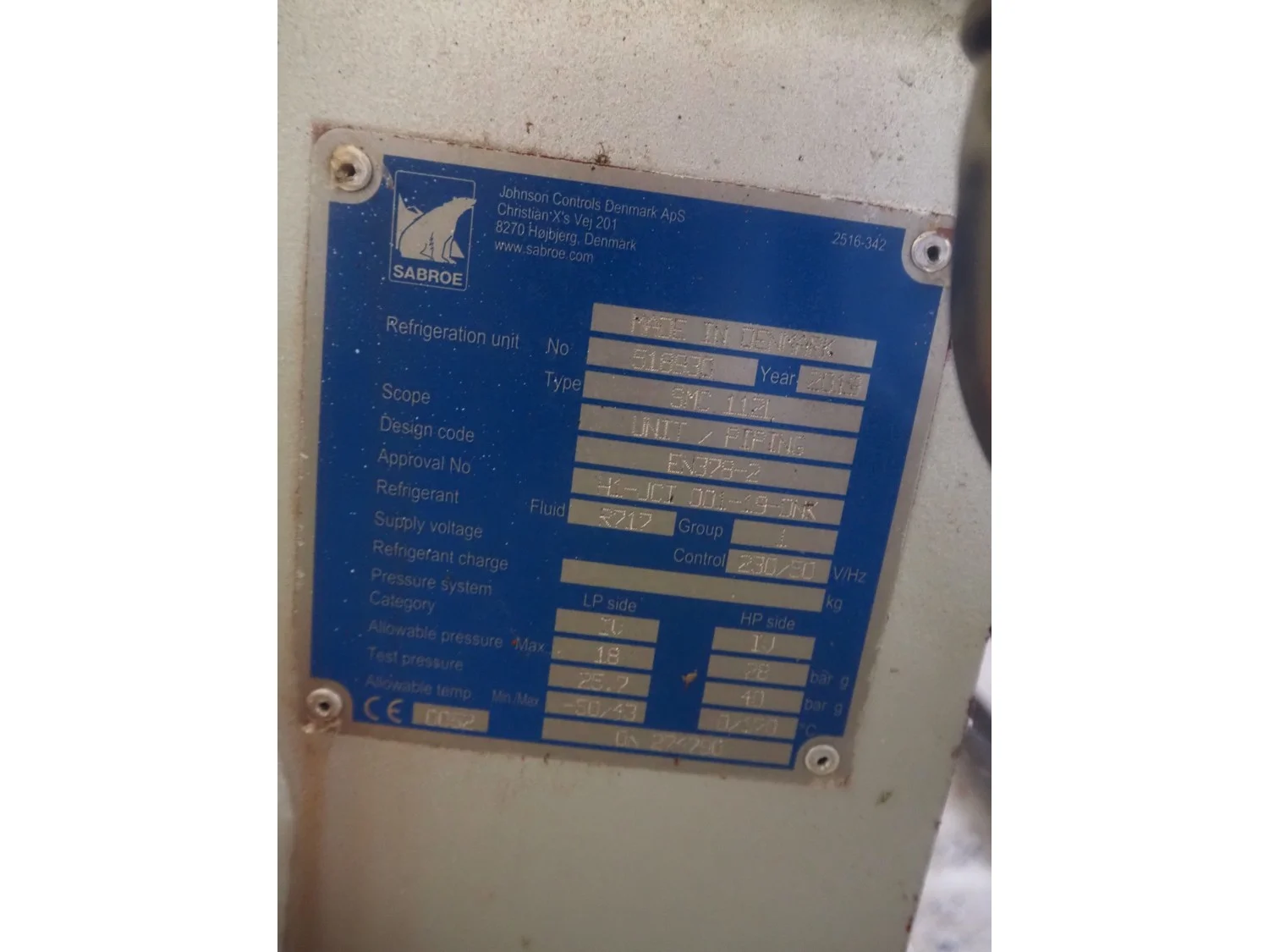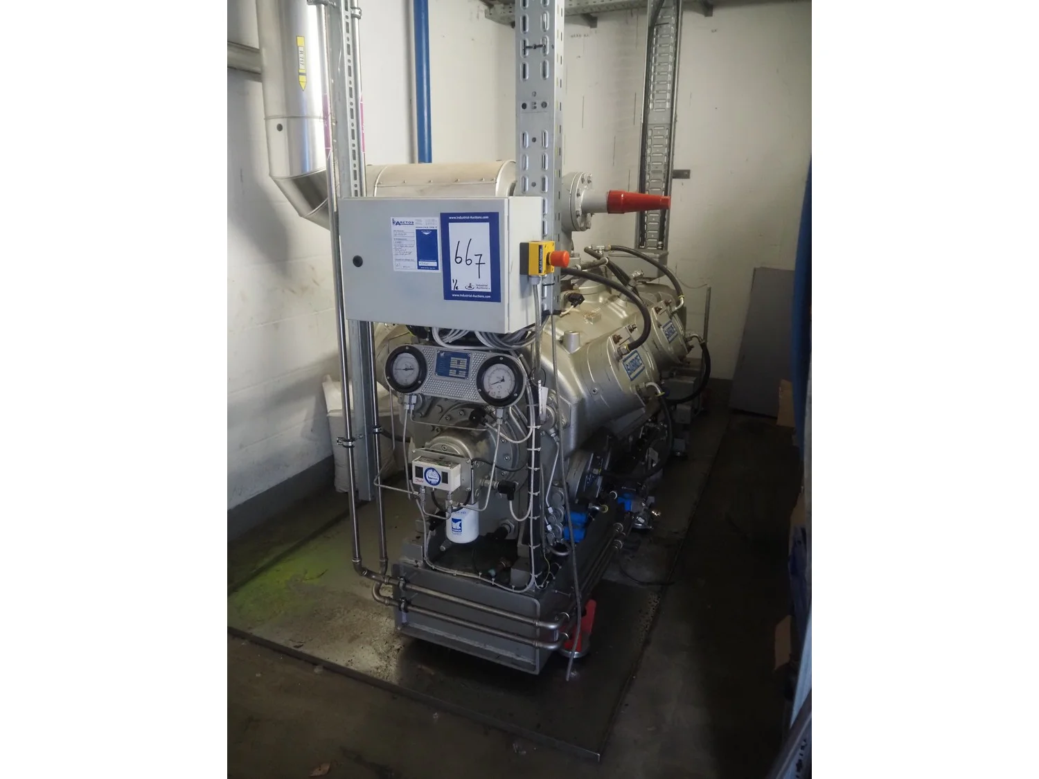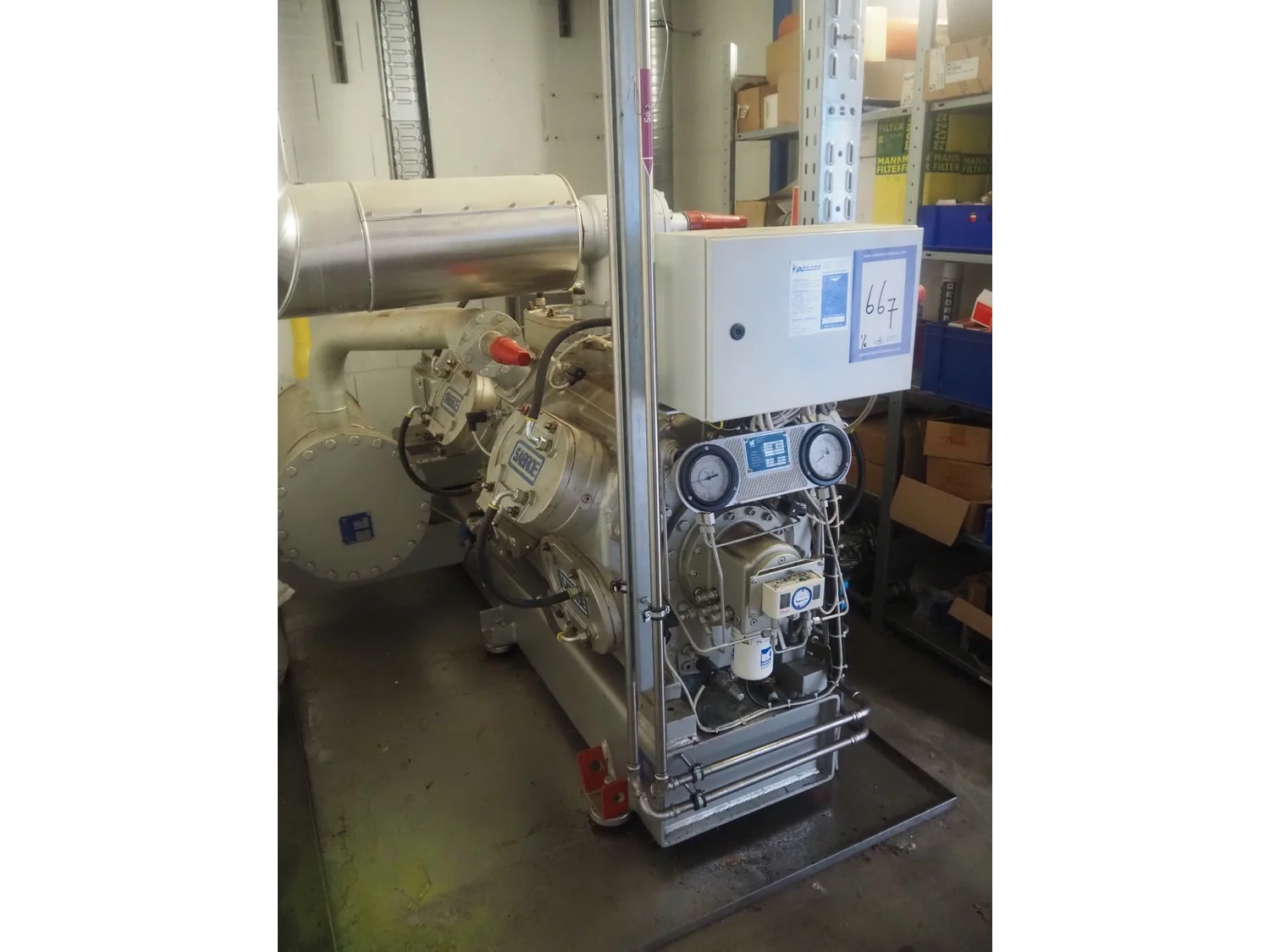 Sabroe reciprocating piston cooling compressor, type: SMC112L, number: 164069, year of construction: 2019, speed: 1500 m³ per hour, volume: 848 m³ per hour, refrigerant: R717, dimensions: 3350 mm x 1300 mm x 1520 mm. Switch cabinet, dimensions: 500 mm x 410 mm x 2180 mm.
