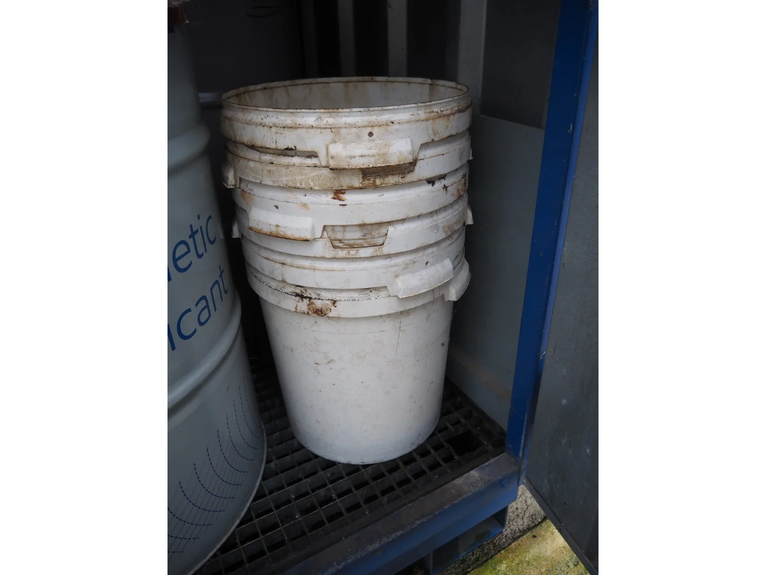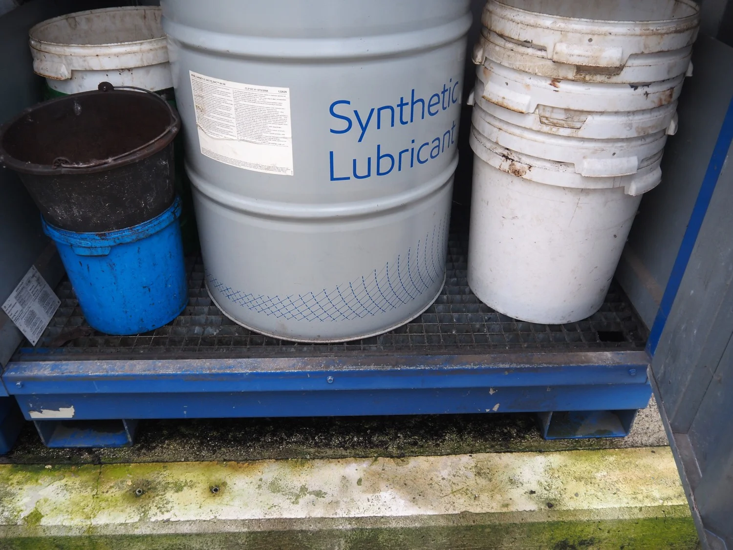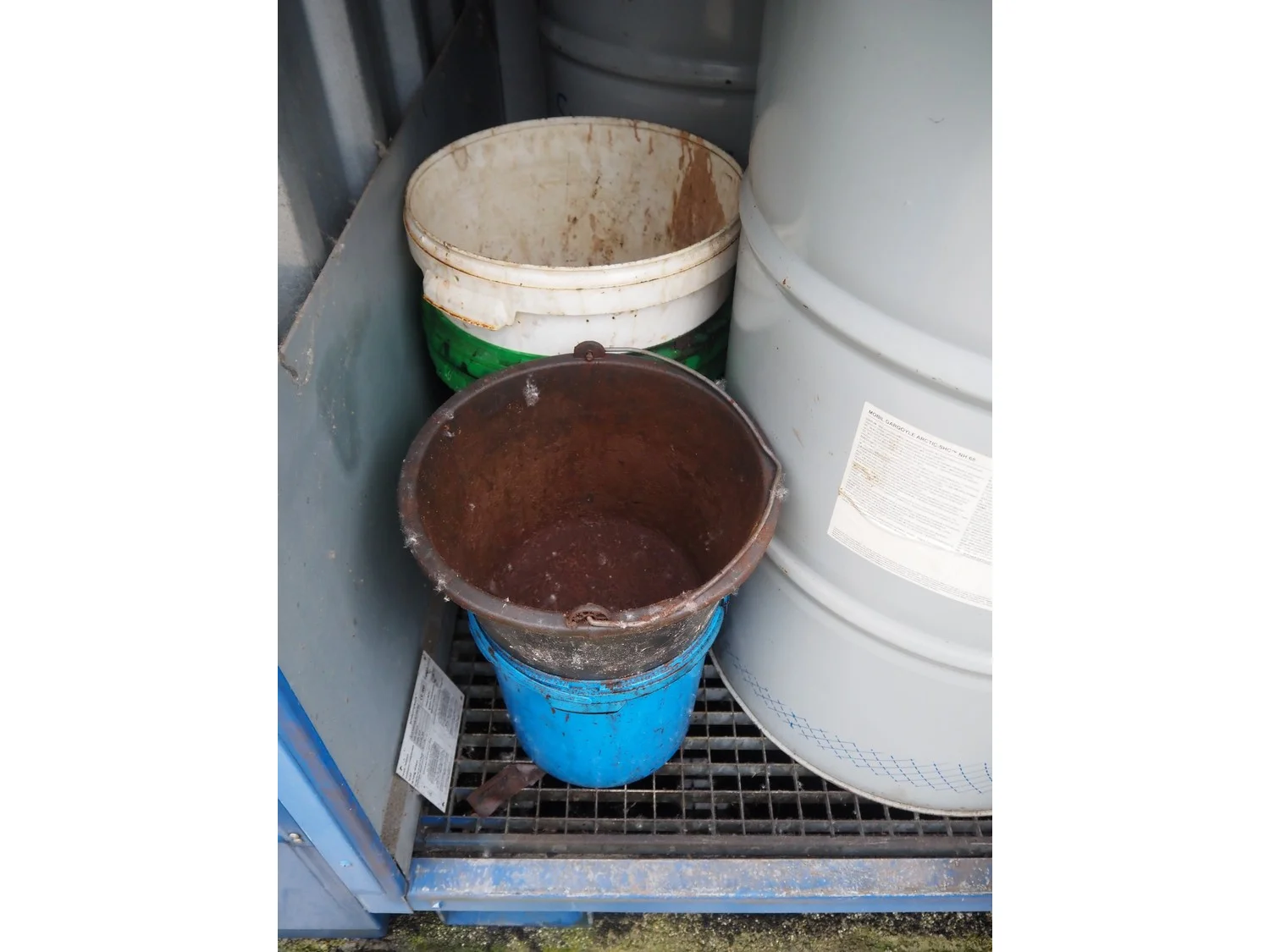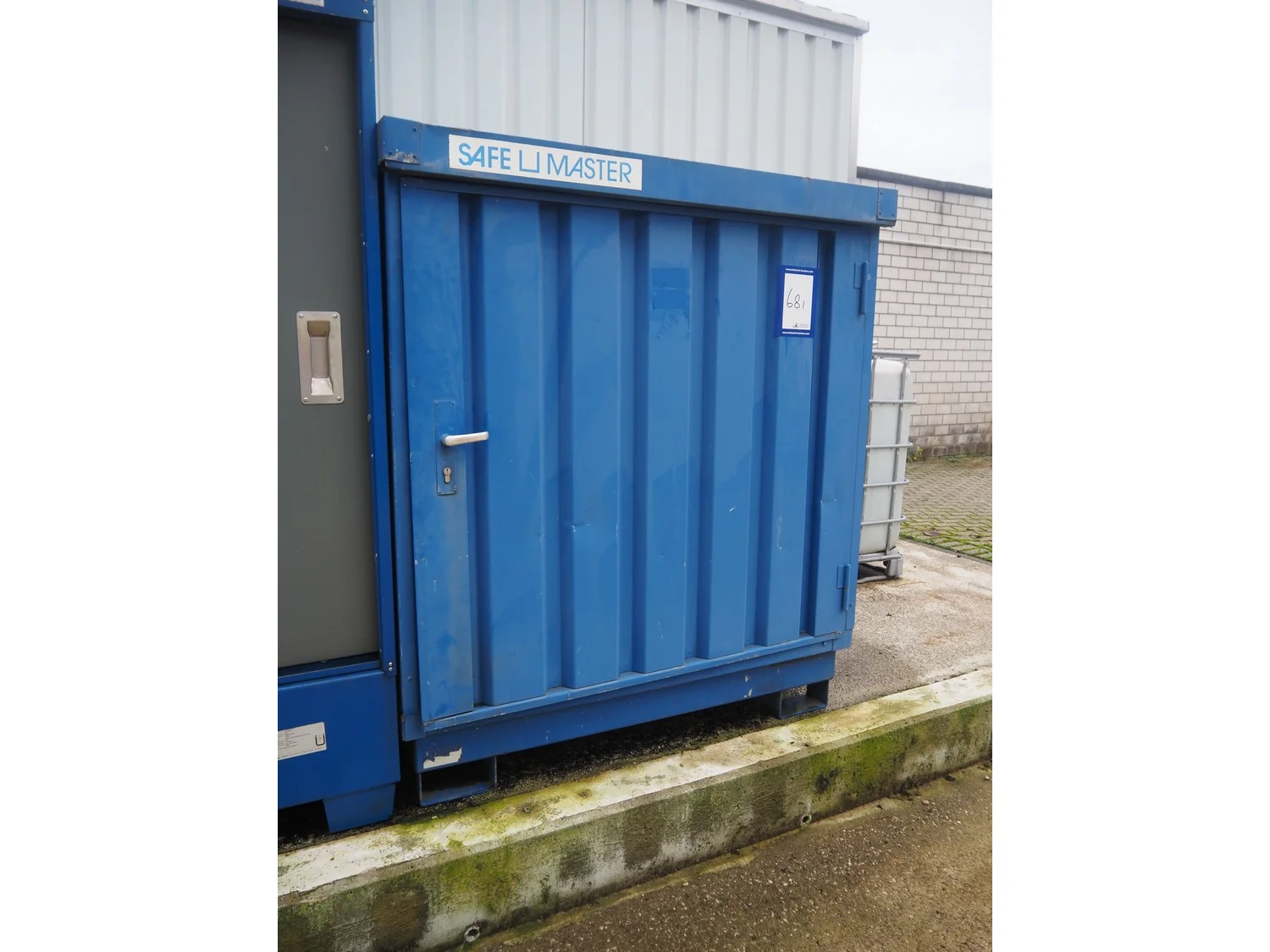 Steel safety cabinet with drip tray, dimensions: 1440 mm x 1420 mm x 1620 mm. Including content.