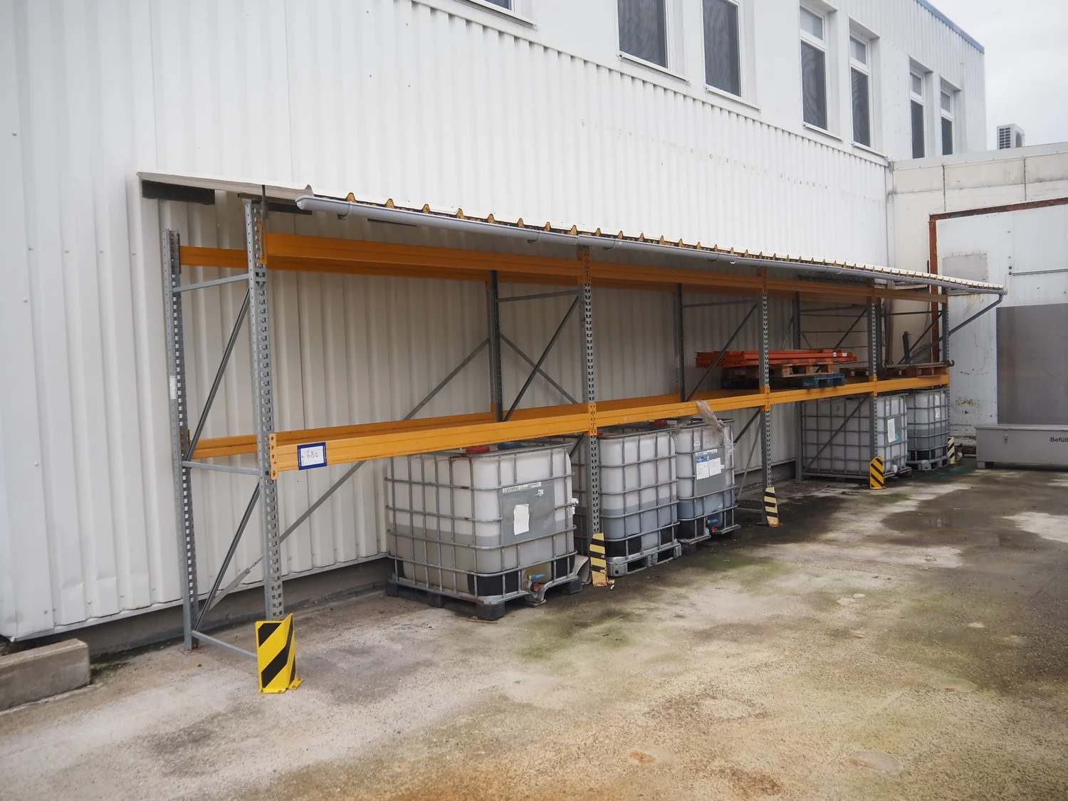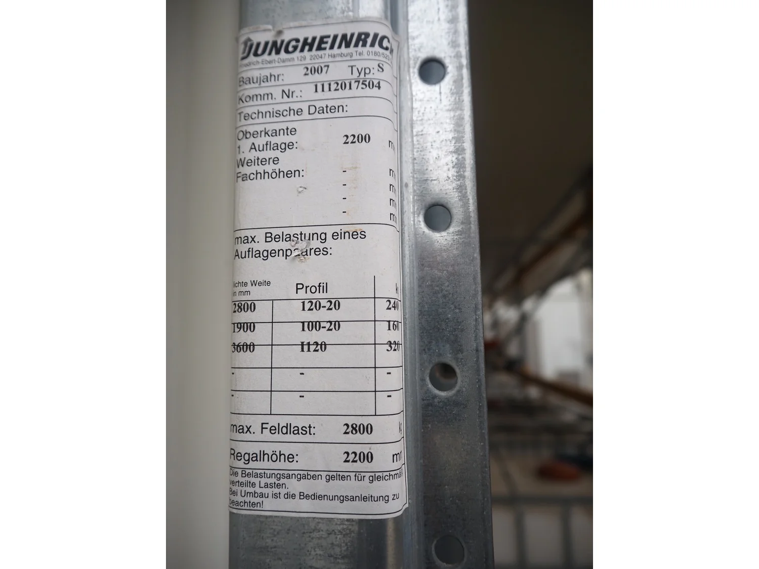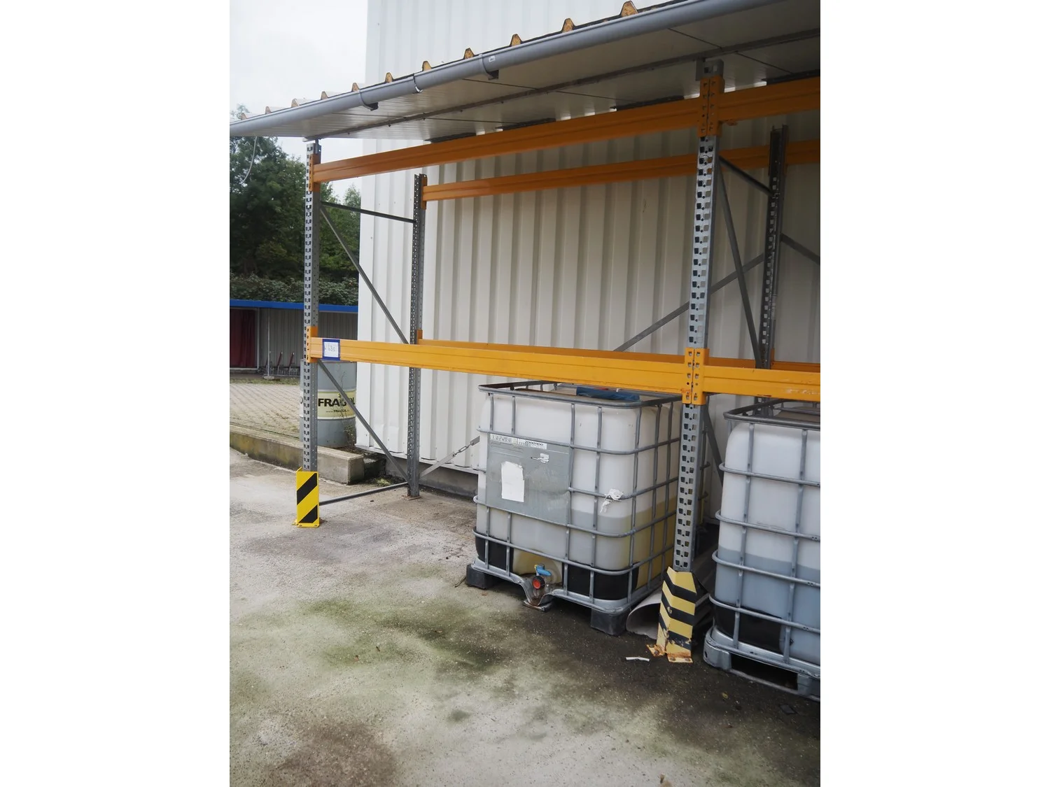 Jungheinrich steel pallet rack, type: S, number: 1112017504, year of construction: 2007, consisting of: 5 uprights, dimensions: (5x) 1100 mm x 90 mm x 2700 mm, 16 beams, beam length: (16x) 2880 mm, total dimensions: 11620 mm x 1100 mm x 2700 mm. IBC tanks not included.