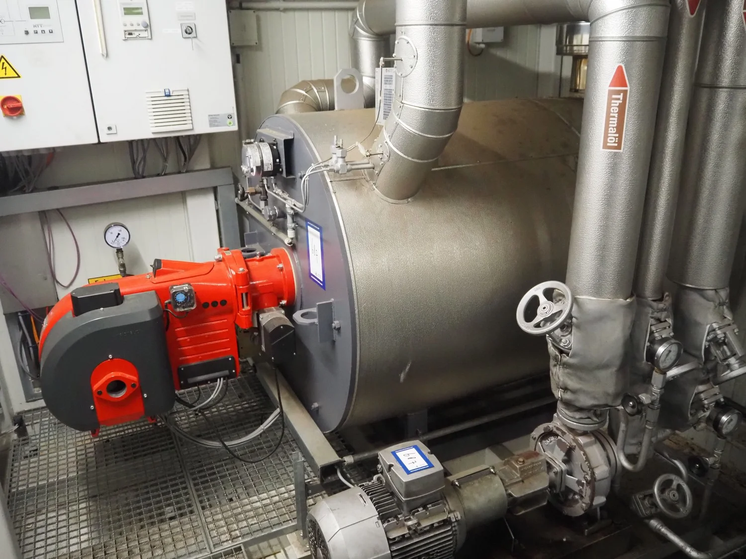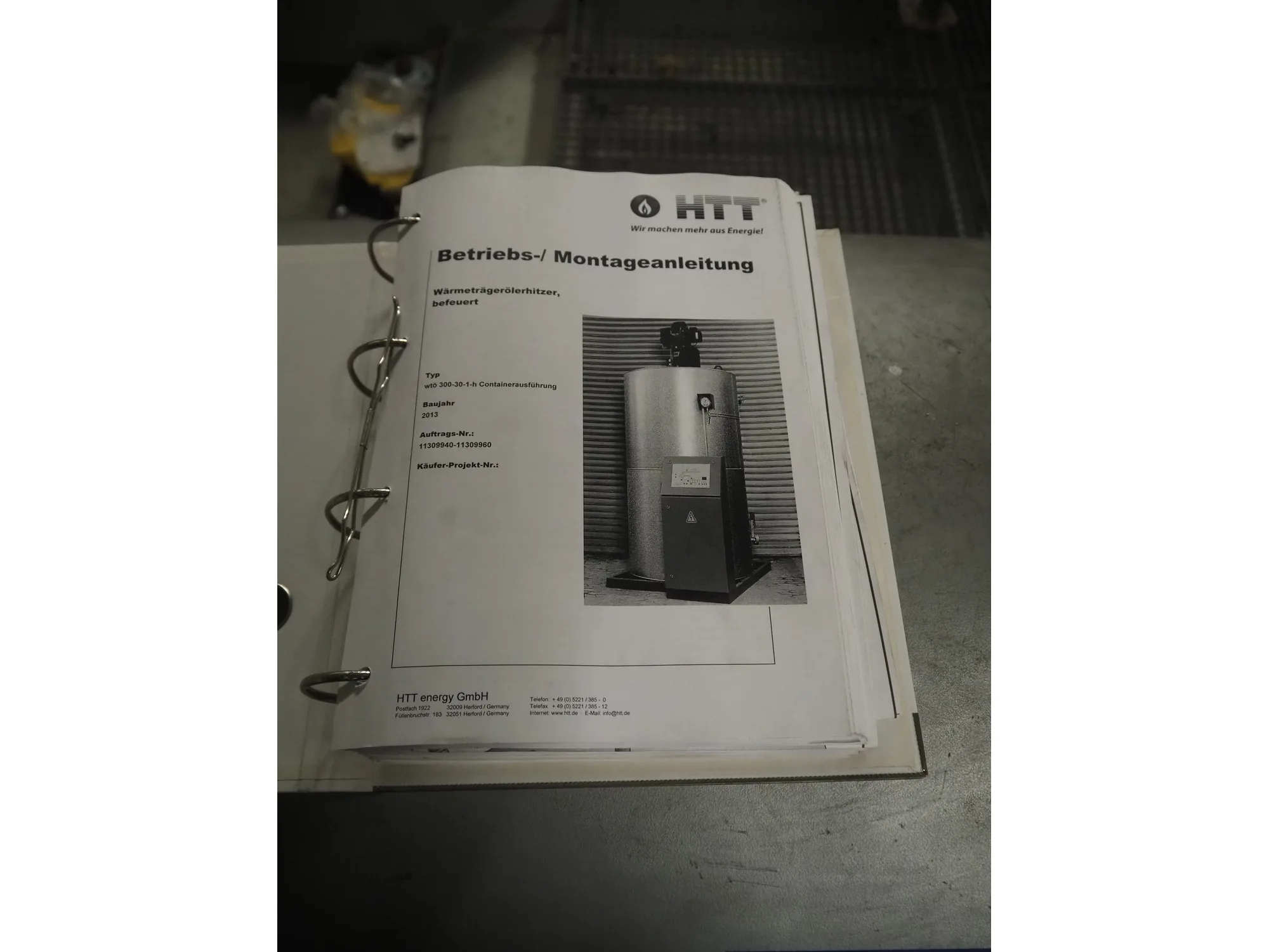 HTT thermic oil installation consisting of: HTT Energy GmbH thermic oil boiler, type: Wtö 300-30-1-H, serial number: 8.1.4456, year of construction: 2013, 300 kW, 15.9m³ per hour, volume: 155 V, maximum temperature: 300°C, maximum operation temperature: 300°C, maximum pressure: 10 bar, Max Weishaupt GmbH burner, burner type: WM-G10/2-A, number: 40192808, year of construction: 2013, capacity: 630 kW, gas: N, dimensions: 2380 mm x 1100 mm x 1350 mm. HTT Energy GmbH thermic oil tank, type: SAB 1000-1-0.5-H, number: 6.5.1514, year of construction: 2013, volume: 1000 liter, maximum temperature: 300°C, maximum operation temperature: 300°C, maximum pressure: 0.5 bar, test pressure: 0.55 bar, dimensions: 1950 mm x 850 mm x 1060 mm. Rittal switch cabinet, dimensions: 1000 mm x 570 mm x 750 mm. KSB circulation pump for thermic oil, type: ETANORM SYT 032-200 SYT8, diameter: 193 mm, dimensions: 920 mm x 300 mm x 380 mm. Batiscaphe Chimney