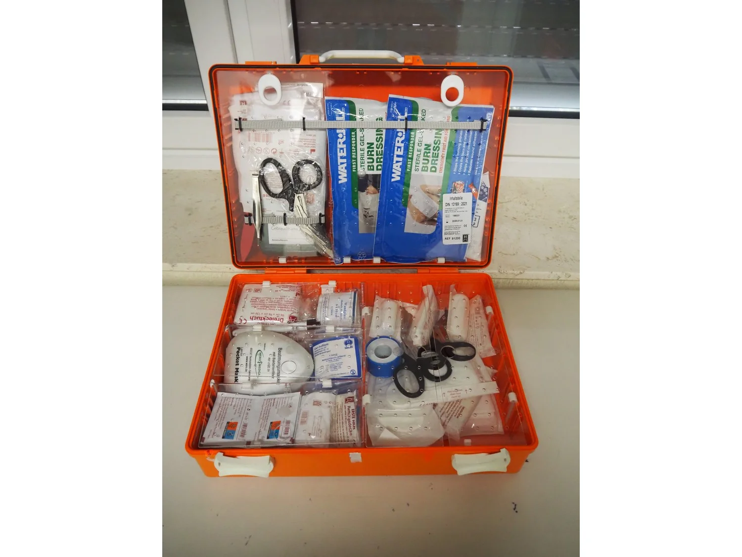 Steel first aid cabinet, dimensions: 600 mm x 520 mm x 1800 mm.