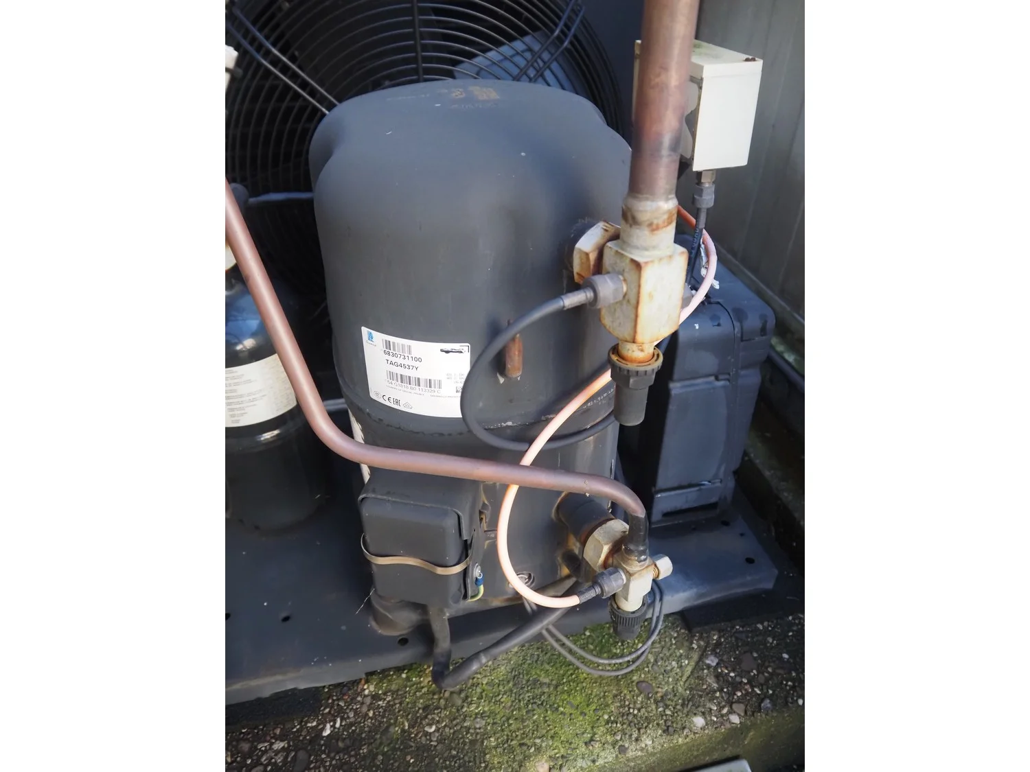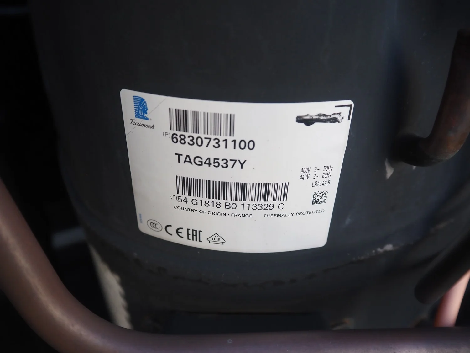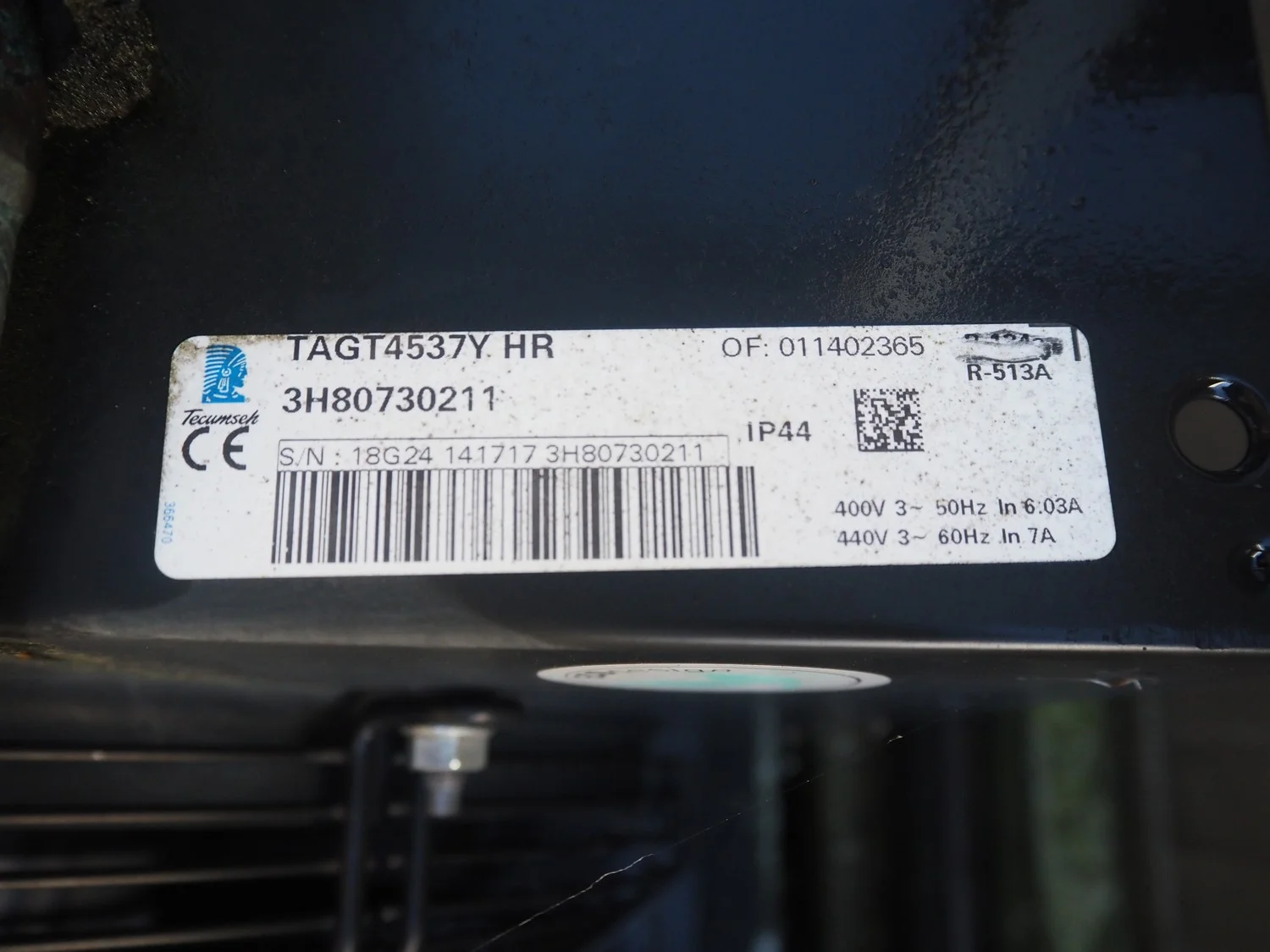 Tecumseh cooling compressor, model: TAGT4537Y HR, serial number: 18G24 141717 3H80730211, 400/440 V, 3 Ph, 50/60 Hz, 6.03/7 A, refrigerant: R-513A, dimensions: 600 mm x 600 mm x 540 mm.