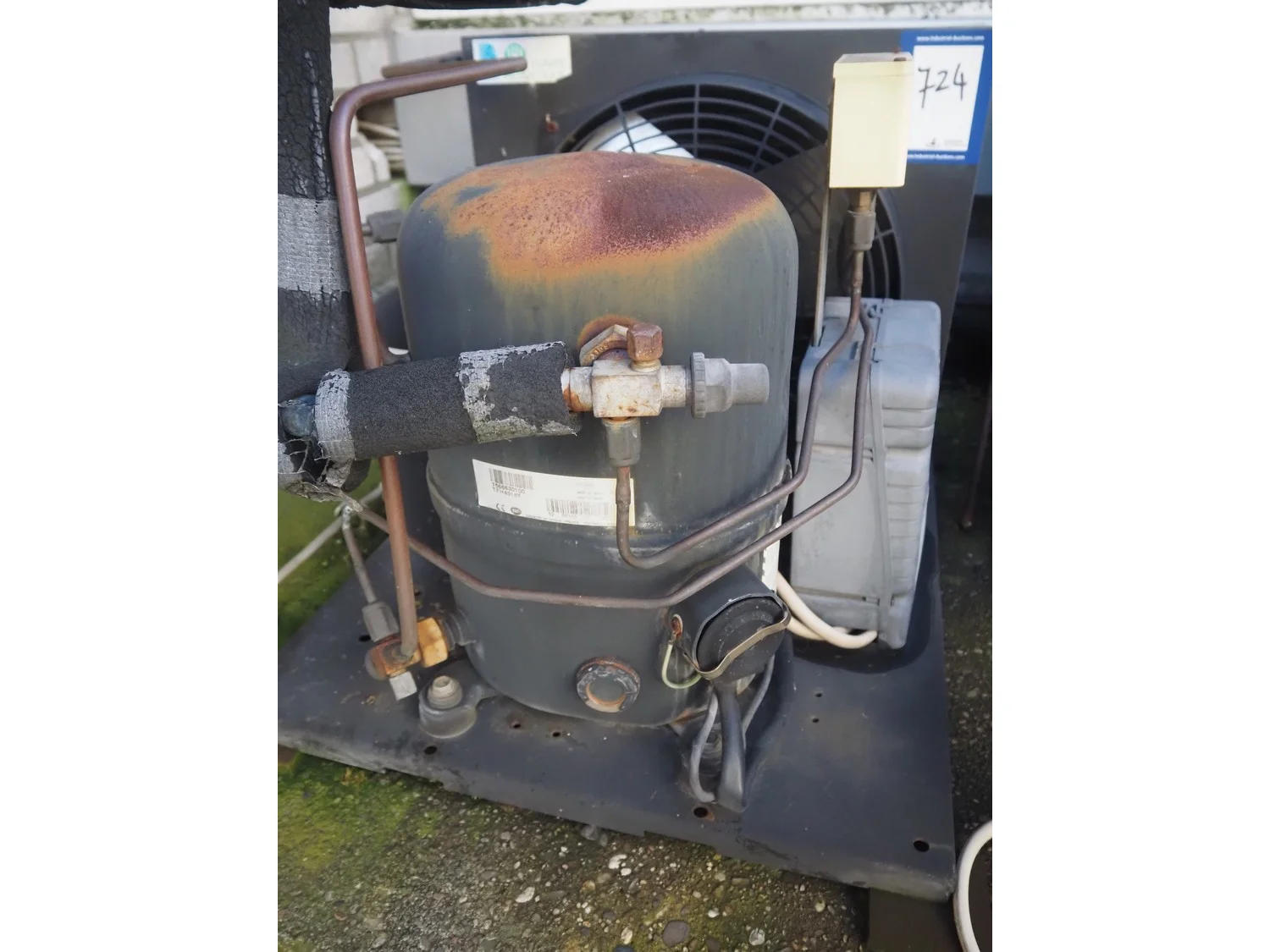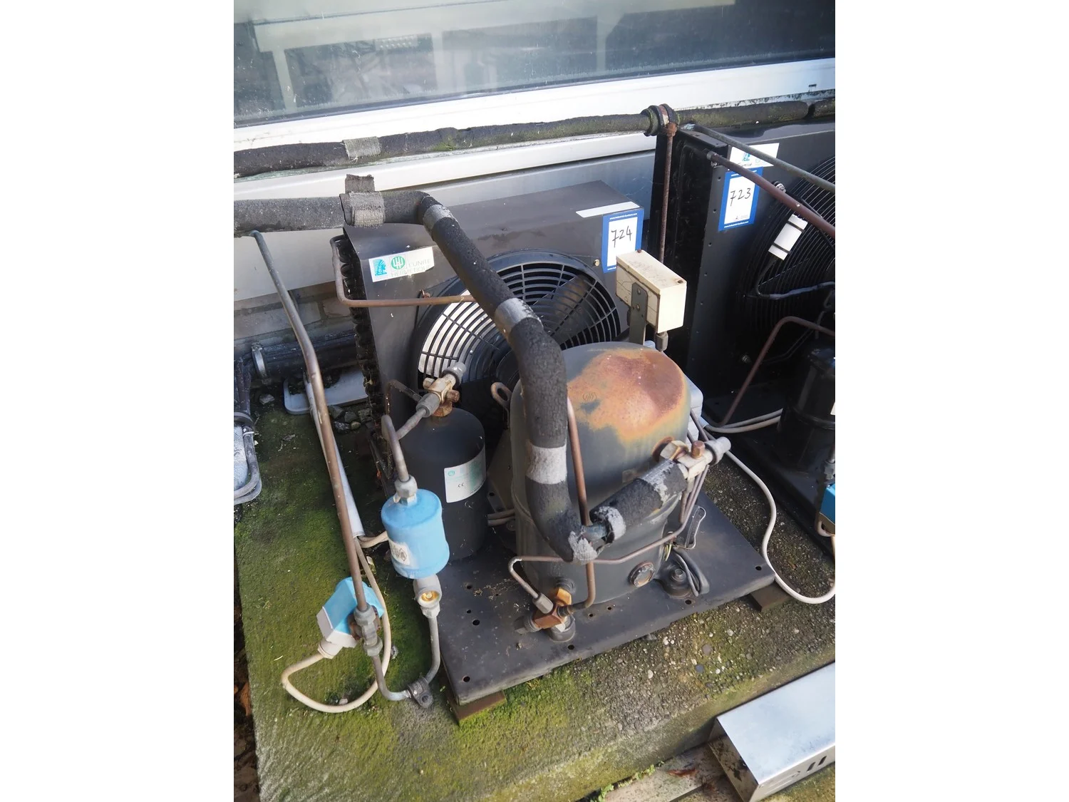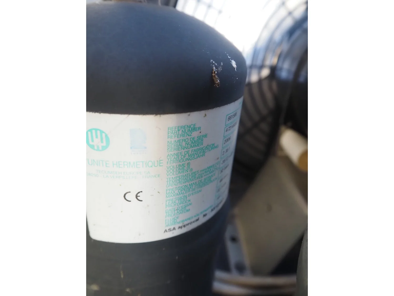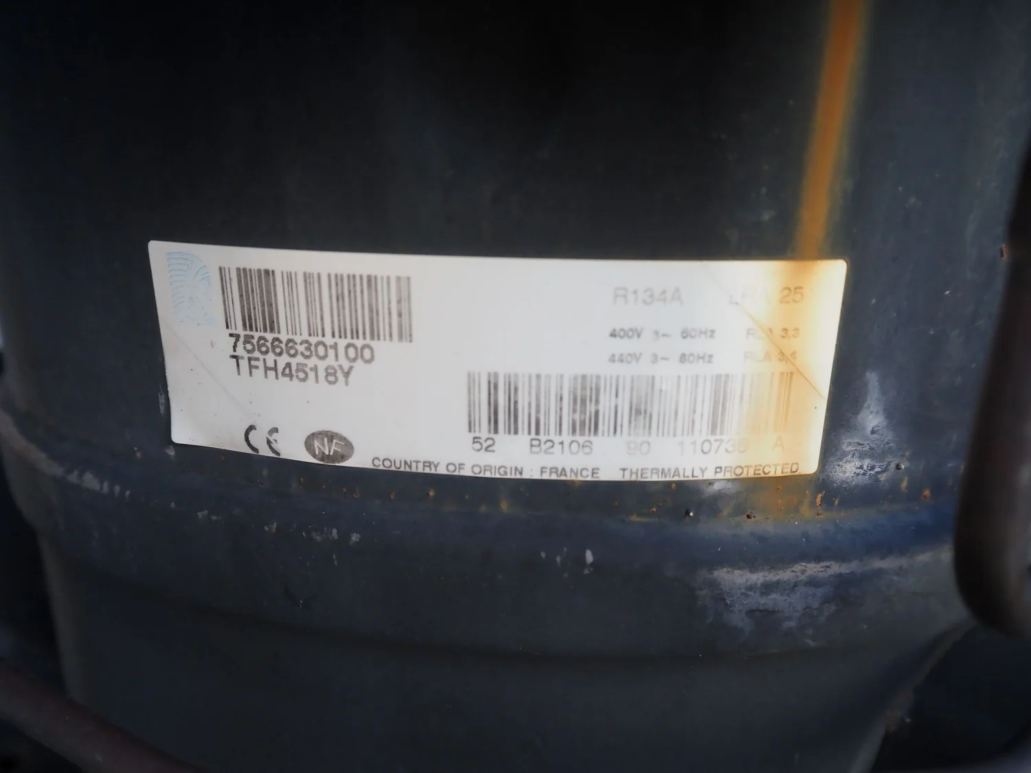 Tecumseh cooling compressor, model: TFH4518Y, serial number: 7566630100, 400/440 V, 3 Ph, 50/60 Hz, 3.3/3.4 A, refrigerant: R-134A, dimensions: 600 mm x 480 mm x 450 mm.